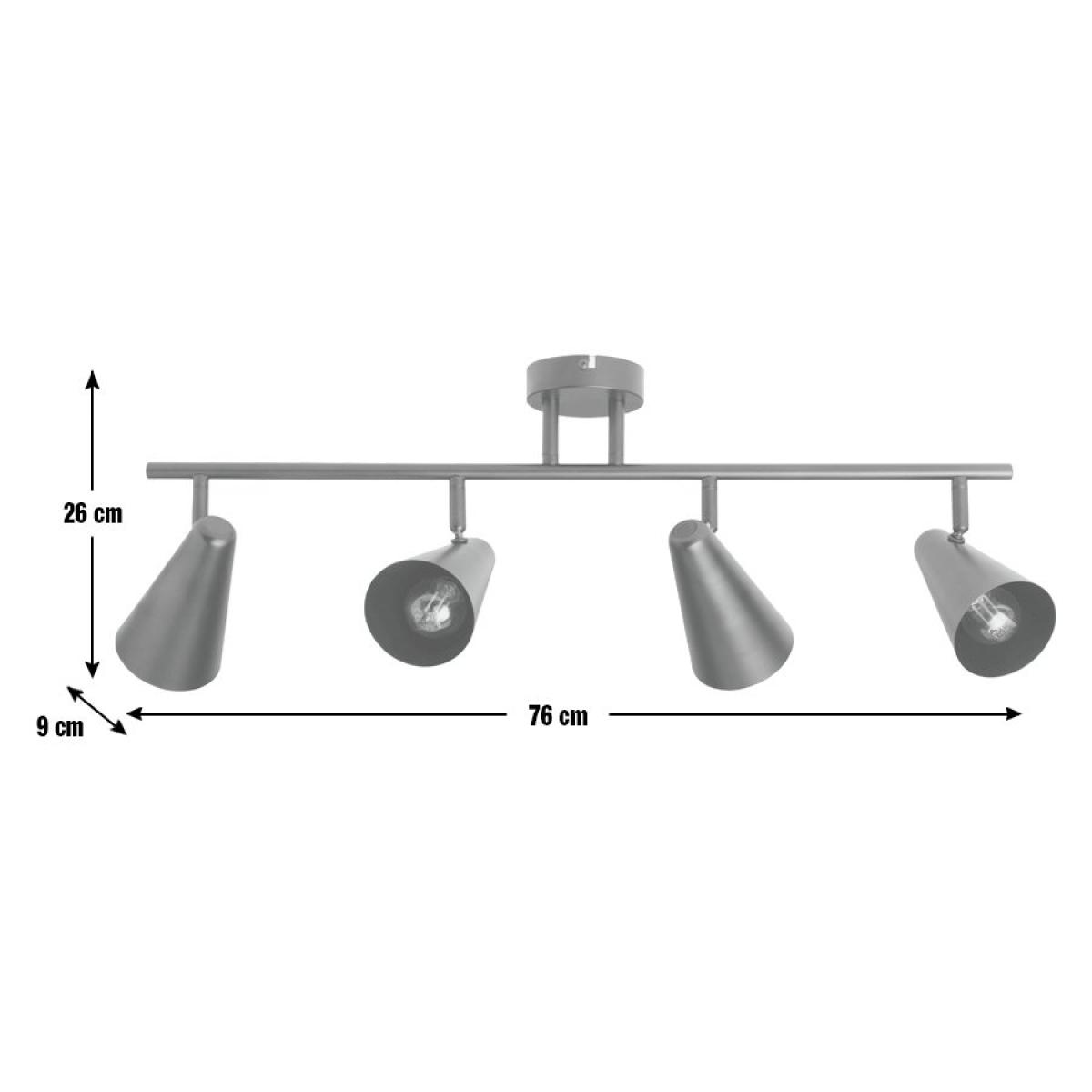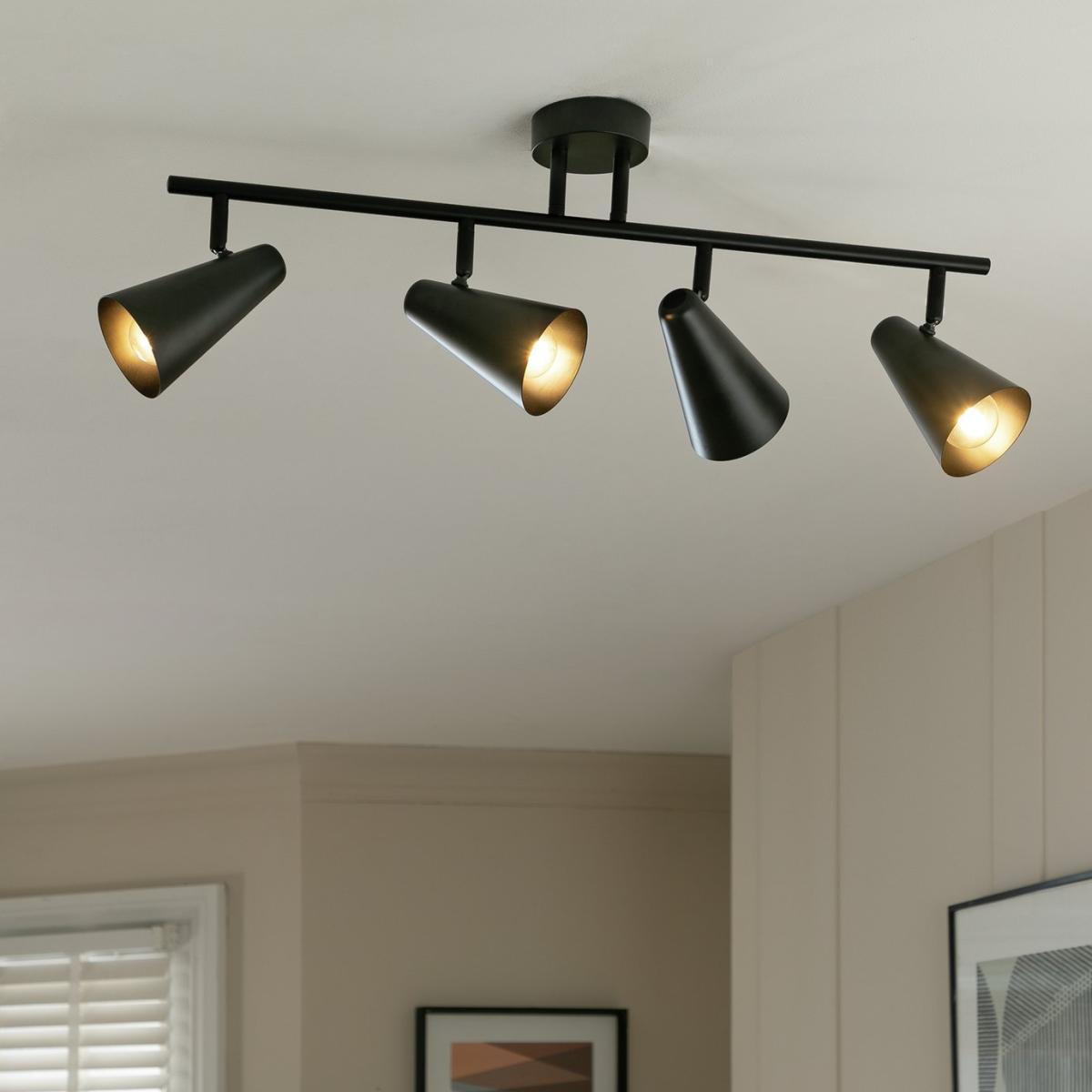 Directional lighting just got smoother. Clean crisp and uber cool, that's our matt black 4-spot bar. The contemporary shades are designed to show off retro style Edison bulbs. And each conical shade can be angled to throw down focused light just where you want it. Dimensions: Size H26, W76, D9cm. Bulb Information: Bulbs required 4 x golfball E14 small edison screw LED (not included). Recommended maximum wattage: 10 watts. Can not be used with a dimmer switch. LED bulb only. General Information: Steel. - not suitable for bathroom use. Weight: 1kg. Minimal assembly. Product is hard-wired into electrics. Manufacturer's 1 year guarantee.