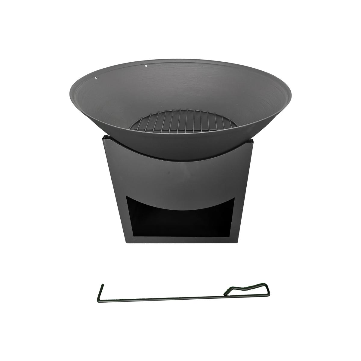 Ready for a sundown soiree? Want to set the tone to warm and cosy? Light up our solid steel firepit. And add instant ambience to small, seated gatherings. Or watch dancing flames as you sip cocktails under the stars. A contemporary focal point that comes with an attractive built-in log store, ash grate and poker. A great, and easy way to extend your home, entertain, and make the most of your outdoor area. Made from 100% steel. Stand. Grill not included. Size H42,. Weight 3.5kg. Diameter 56cm. 1 person self-assembly.