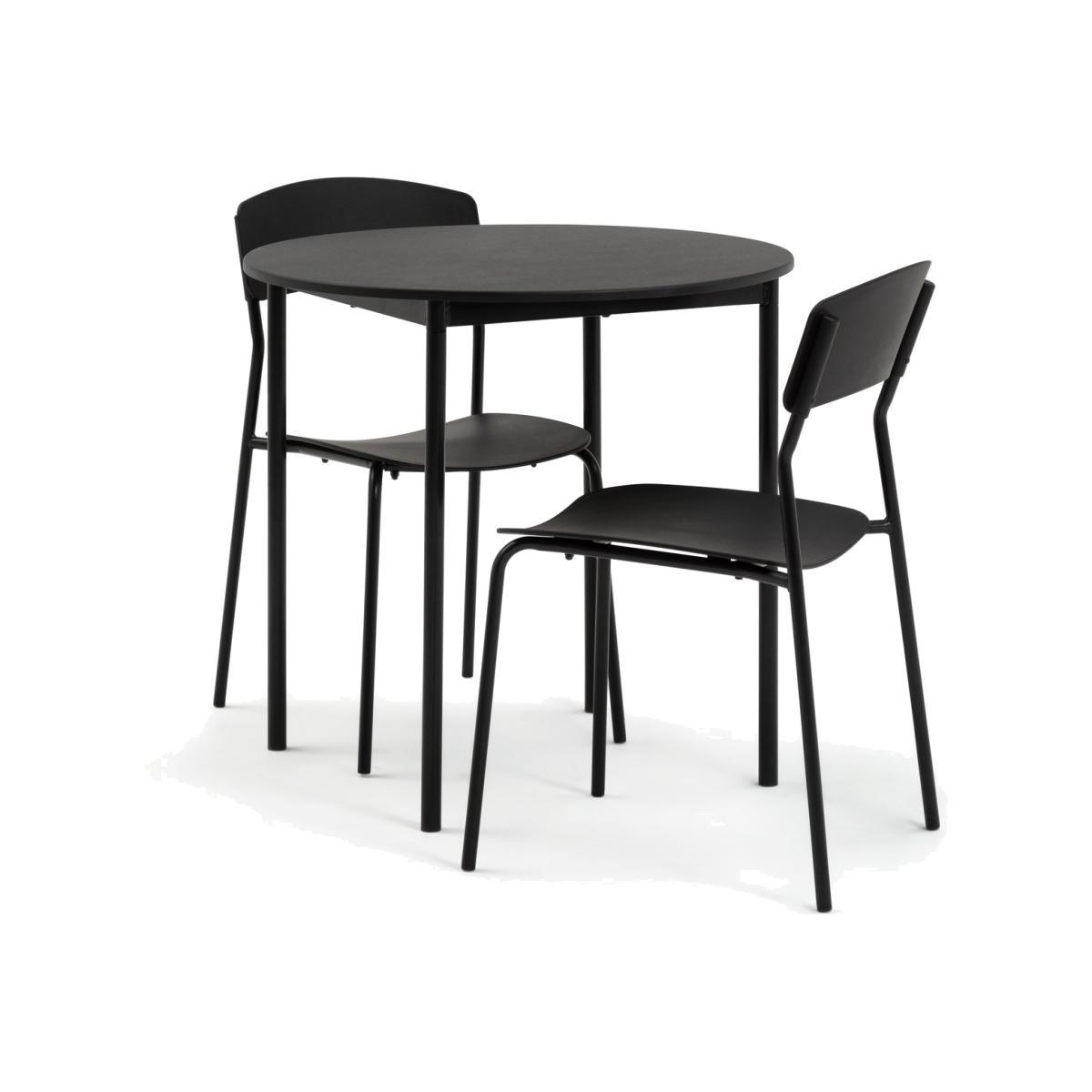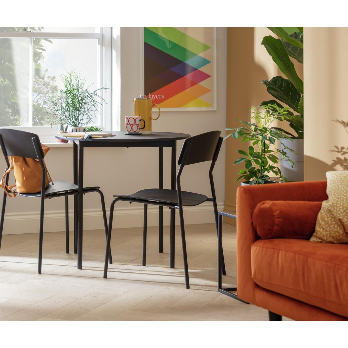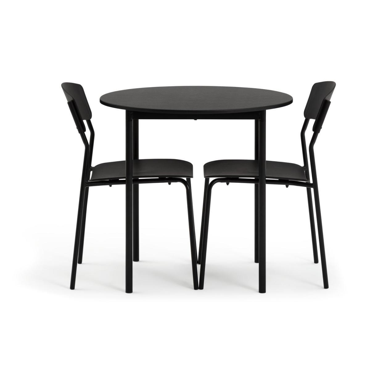 Dinner is served. Our lightweight, wood-effect dining table and 2 chairs sets the stage for family mealtimes and delicious dinner party spreads. Handsomely modern in midnight black, it looks good in a minimalist, contemporary kitchen. Get ready for a super comfy dining experience with cleanly curved seats and high backs for support. Pull up a chair. Eat, drink and chat the night away.