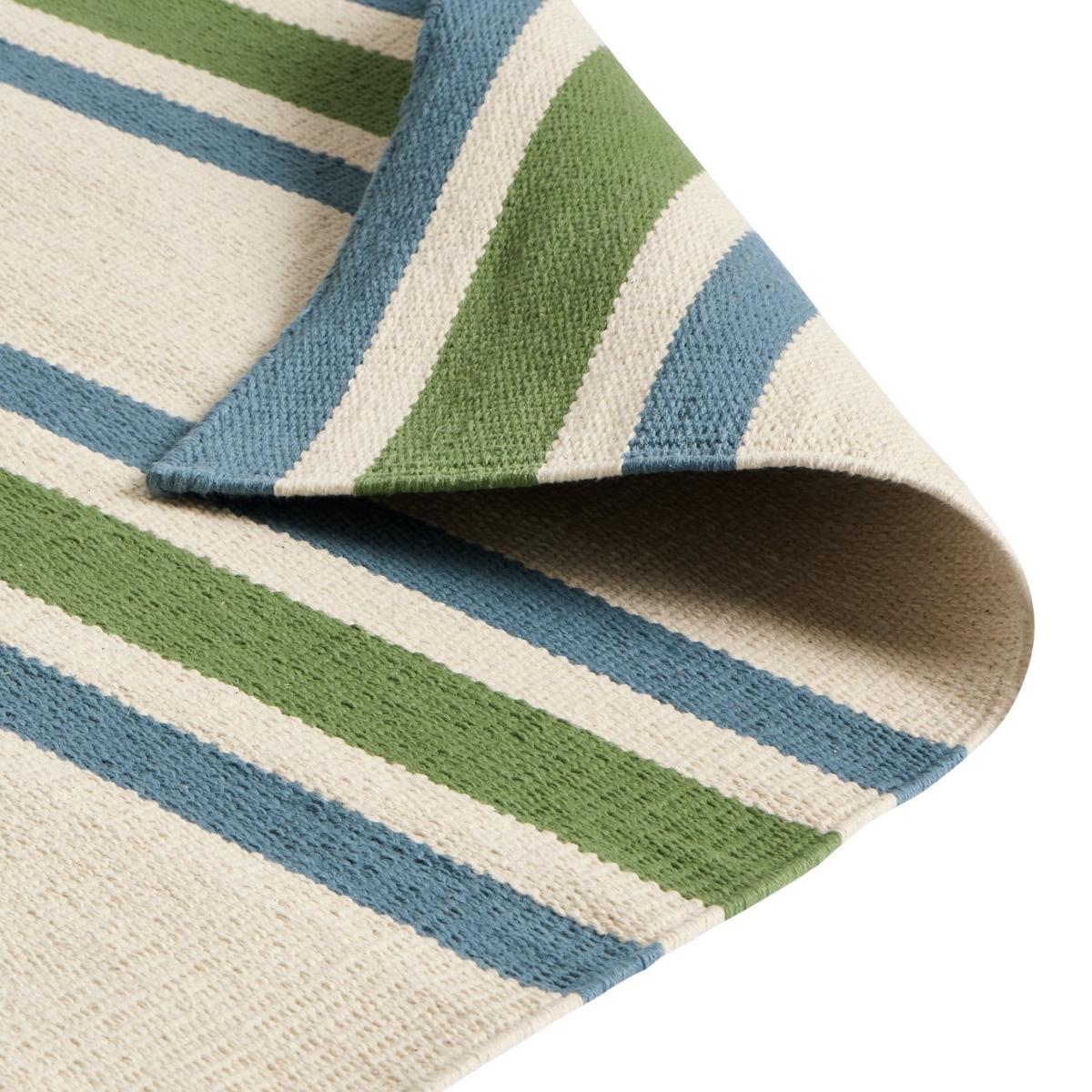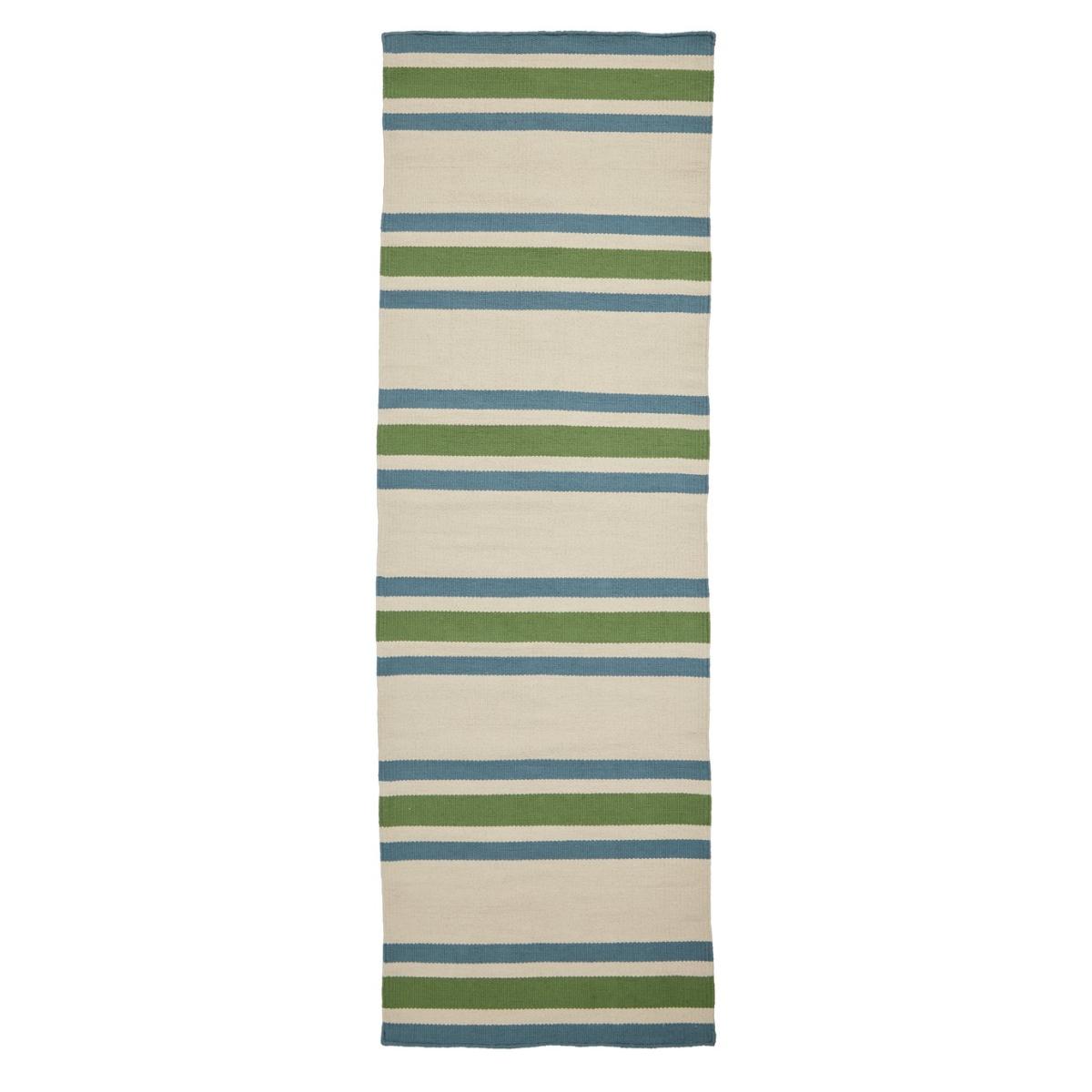 Stripes with structure and style. This flatweave runner brings together blue and green colours in a striking pattern of understated lines. And the background? It's neutral and timeless. Hand crafted in India, from hardwearing natural fabrics, it's lightweight, low profile, and easy to move wherever the mood takes you. Lay it in the hallway or lounge for maximum impact. Hand made. Made in India. 100% cotton. Sponge clean only. Size of runner L200, W66cm. 1.4kg. Natural Stripes design.