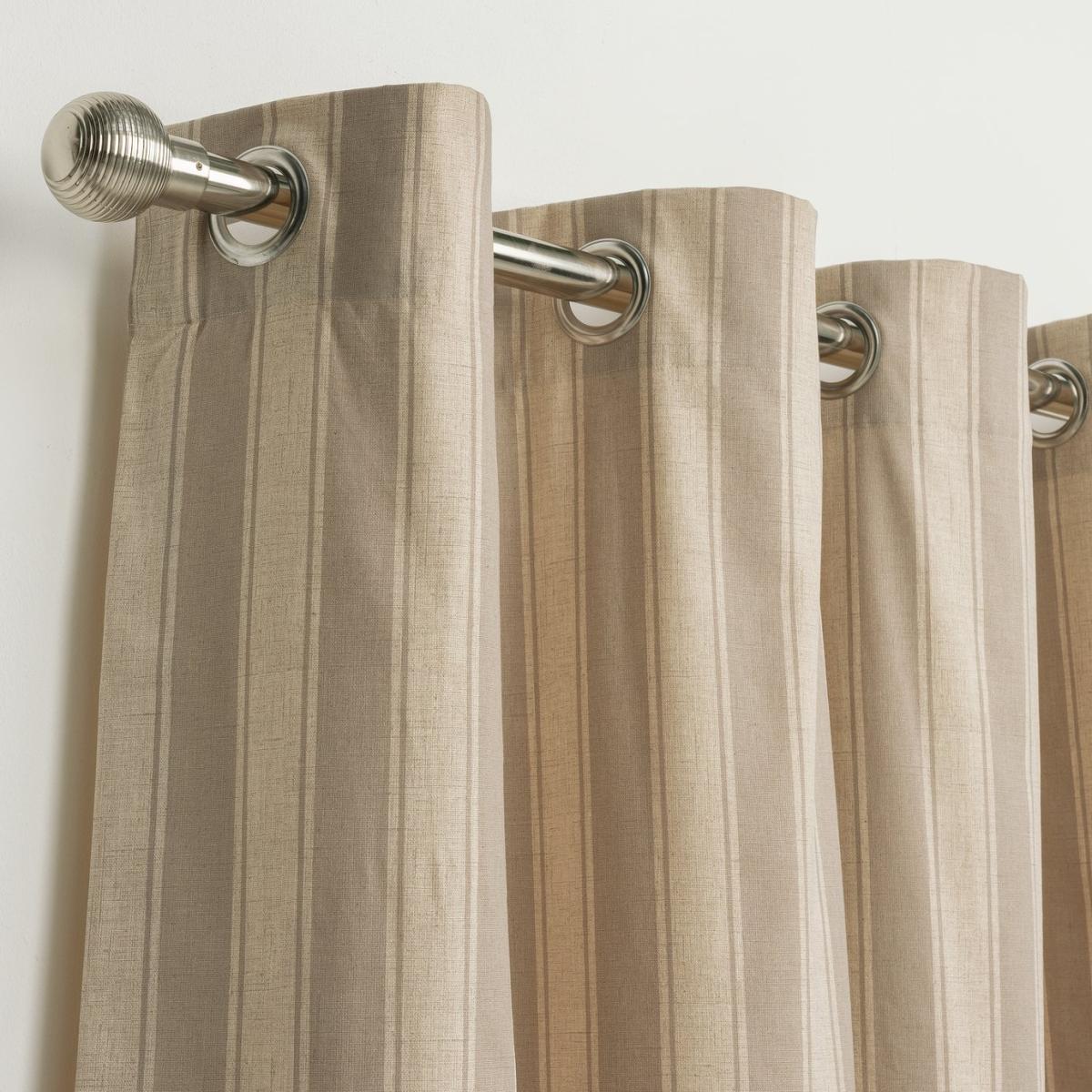 Stylish stripes for your window. This pair of fully lined blackout cotton curtains will add a touch of pared-back sophistication to your space. Easy to hang, just thread on a pole. They'll drape in soft folds thanks to the eyelet header. Come with tie-backs. Neutral. Features Fully lined. Made from 100% cotton. Lined. Lining made from 52% recycled polyester and 48% cotton. Includes tie backs. Dimensions Size 168cm (66 inches) wide by 229cm (90 inches) drop. Dimensions provided include header tape. Eyelet diameter: 4cm. General information Contains one pair of curtains. Number of eyelets per curtain: 10. Suitable for curtain poles. Suitable for curtain tracks. Curtain pole not included. Machine washable. Suitable for tumble drying.