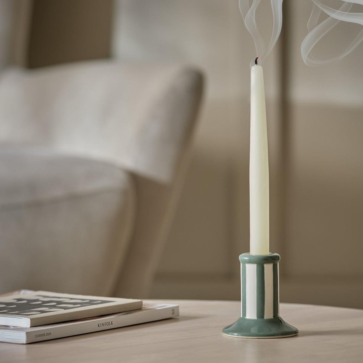 I love this green taper candle holder for its clean, modern lines and the way it adds a subtle pop of colour to a variety of interiors. It works especially well in contemporary, Scandinavian, or mid-century styled spaces, where its minimalist design complements neutral palettes or soft natural textures. Practical styling tips include pairing it with simple white or coloured candles for a versatile look, or grouping it with other patterns and textures to create an inviting tablescape or mantel display. Its size and colour make it a great statement piece that can easily dress up a breakfast table or add warmth to a cosy corner.