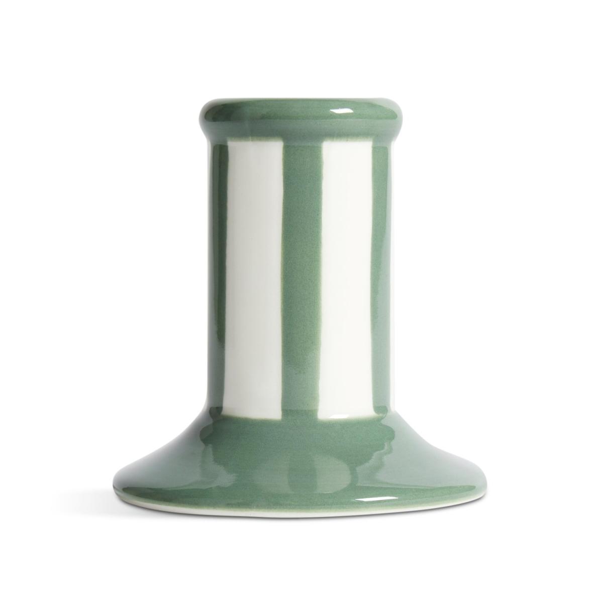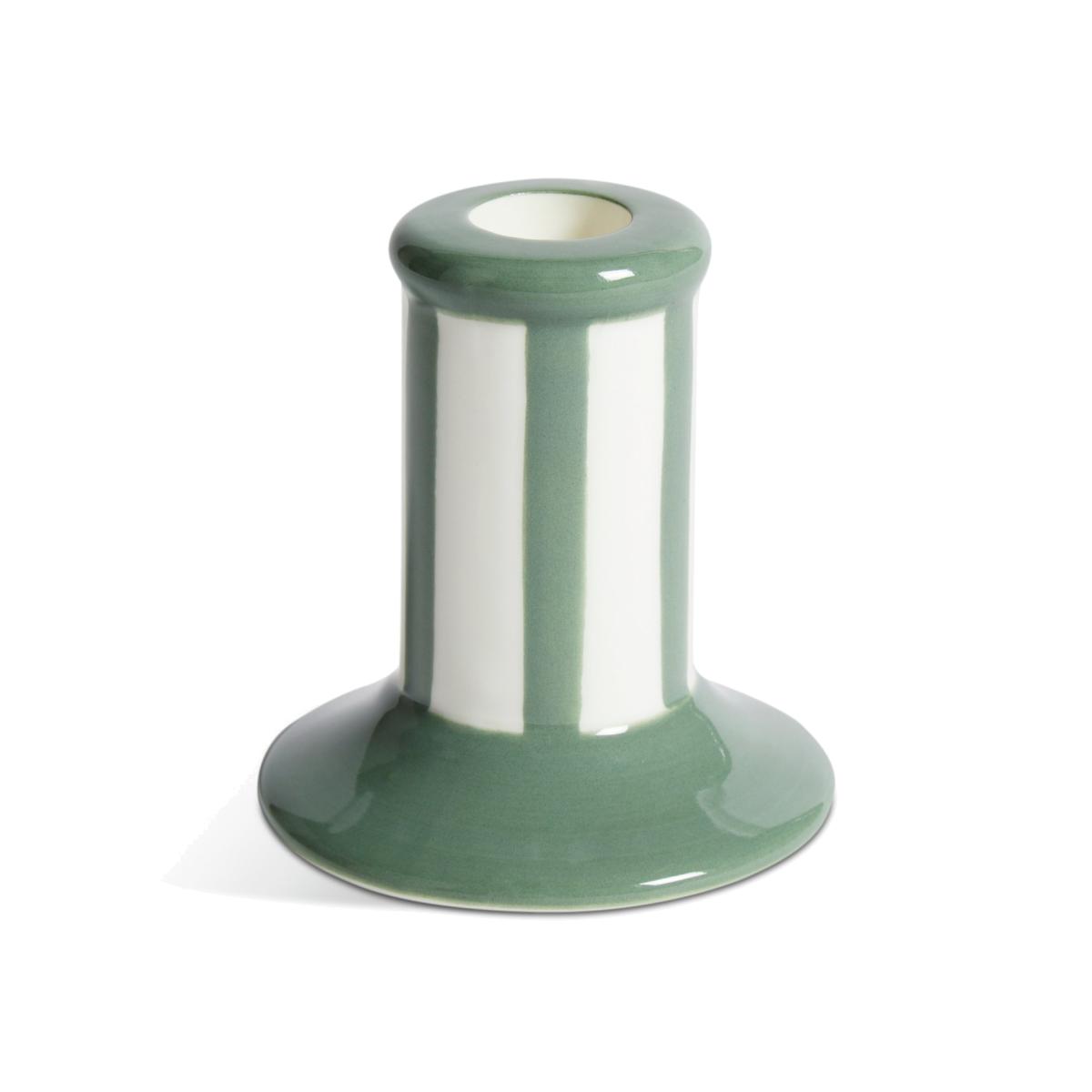 Brighten up a table or shelf with this gloriously glazed ceramic candle holder. Hand painted with bold green and white bands. Adds a whimsical and joyful touch to your home. Size H9, Diameter 8.6cm.