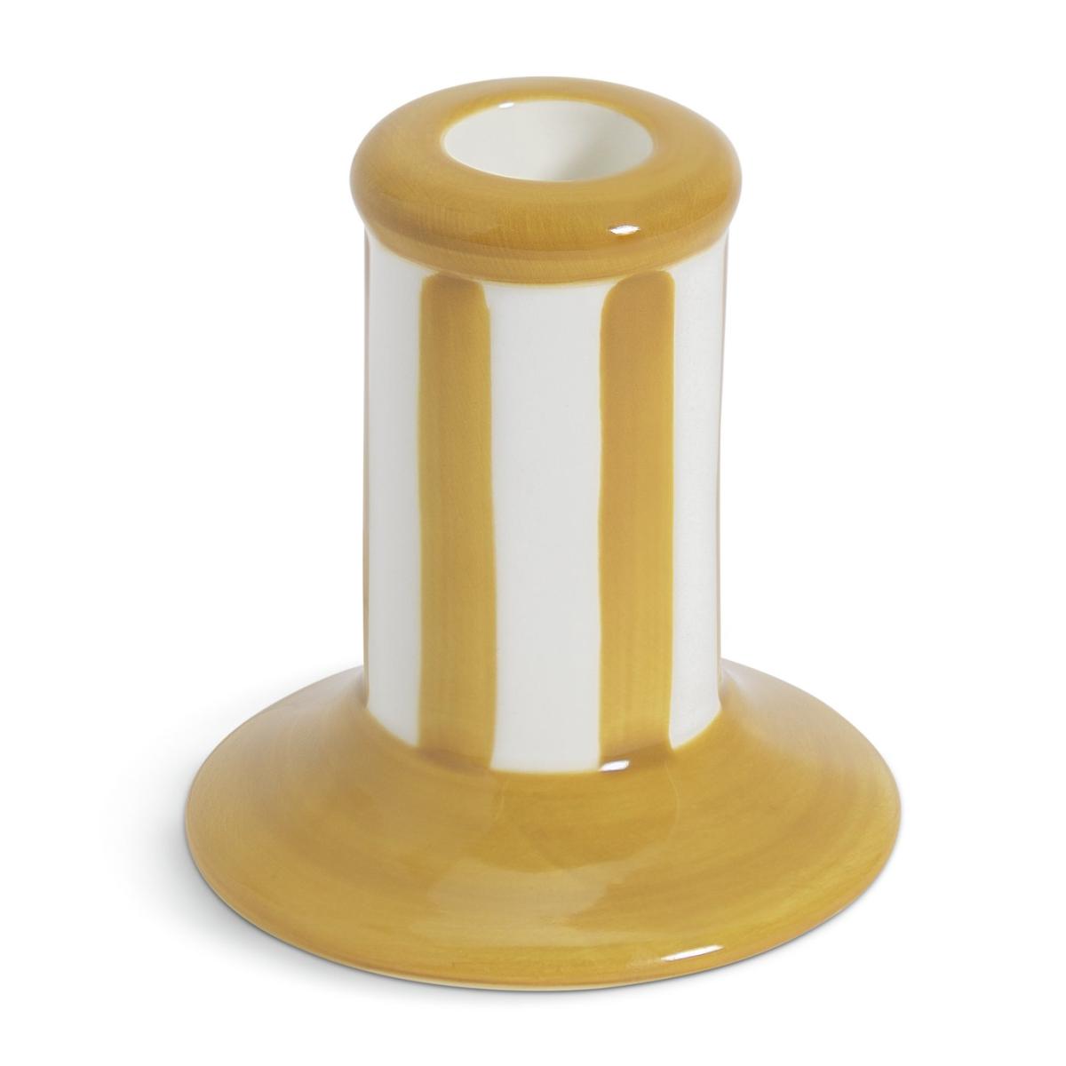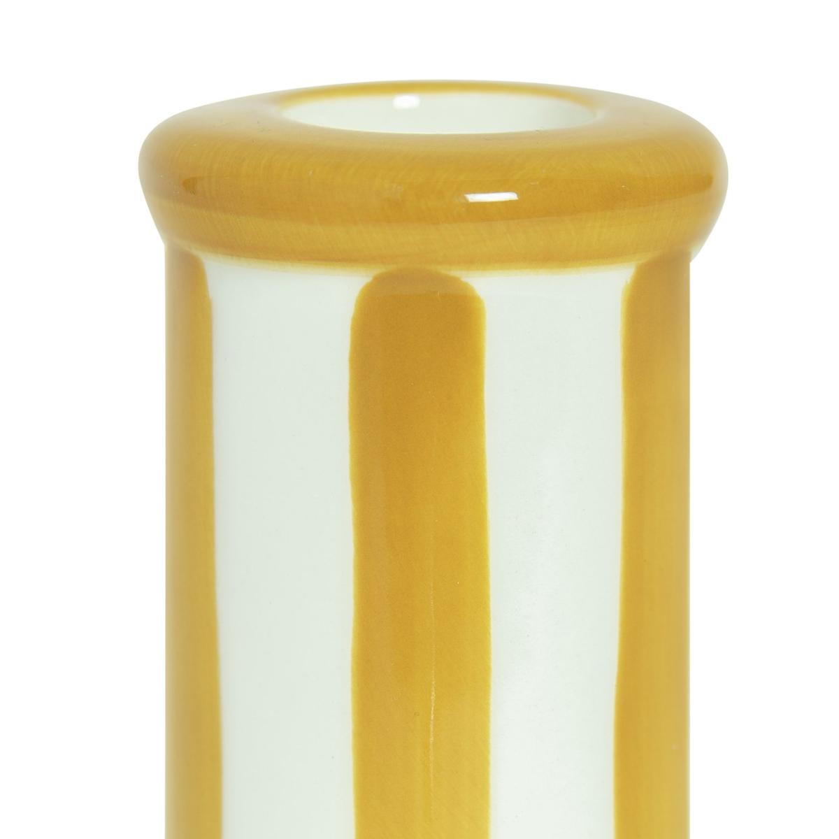Brighten up a table or shelf with this gloriously glazed ceramic candle holder. Hand painted with vibrant mustard and white bands. Adds a whimsical and joyful touch to your home. Size H9, Diameter 8.6cm.