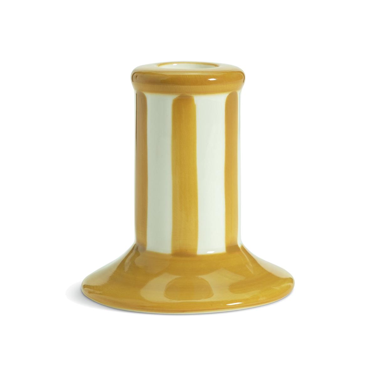 I love this candle holder for its playful yet sophisticated look. The mustard stripe design adds a pop of colour and a hint of retro charm, making it a versatile piece that can lift both modern and eclectic interiors. It works particularly well in casual dining spaces, living rooms, or bedside tables, where it can add warmth and visual interest. For styling, try grouping it with other rustic or colourful accessories, or use it as a standalone statement piece on a mantle or sideboard. Its taper design makes it practical for holding standard candles, and the striking pattern means it will stand out whether lit or unlit.