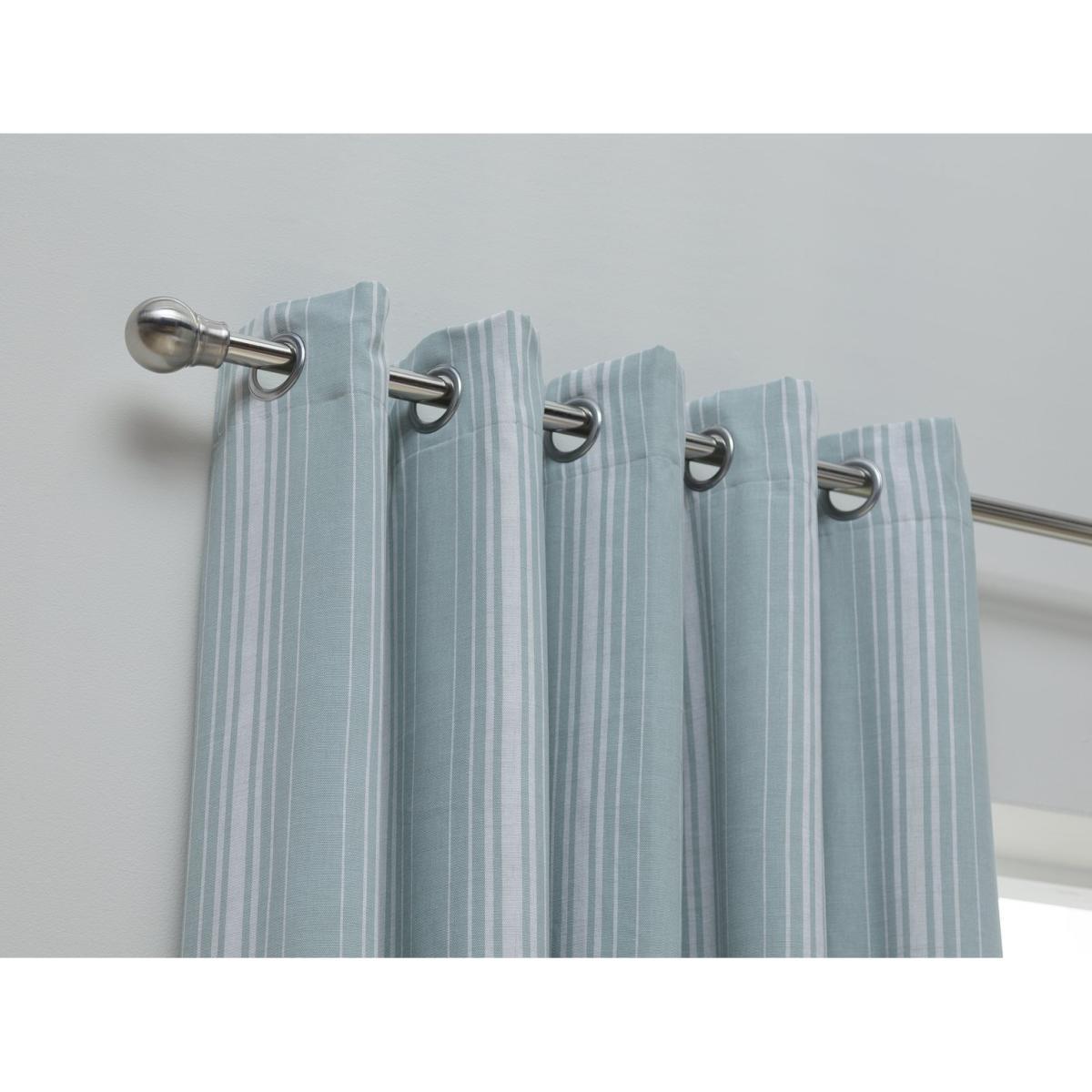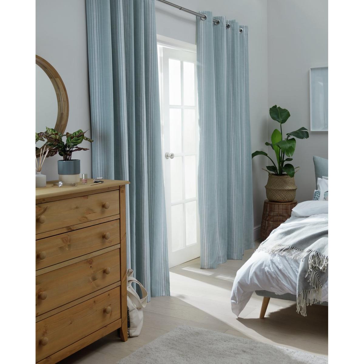 Swoosh. Transform your room and dress your window with our duck egg blue stripe blackout curtains. Eye-catching and stylish they'll certainly lift the mood of your interior. Ready made and easy to hang in soft folds, these are lovely drapes. The eyelet header is a popular look, neat and uncomplicated and makes them easy to open and close. Even better they are 100% cotton and fully lined so easy to care for. Our design can be mixed and matched with a multitude of colours and styles.