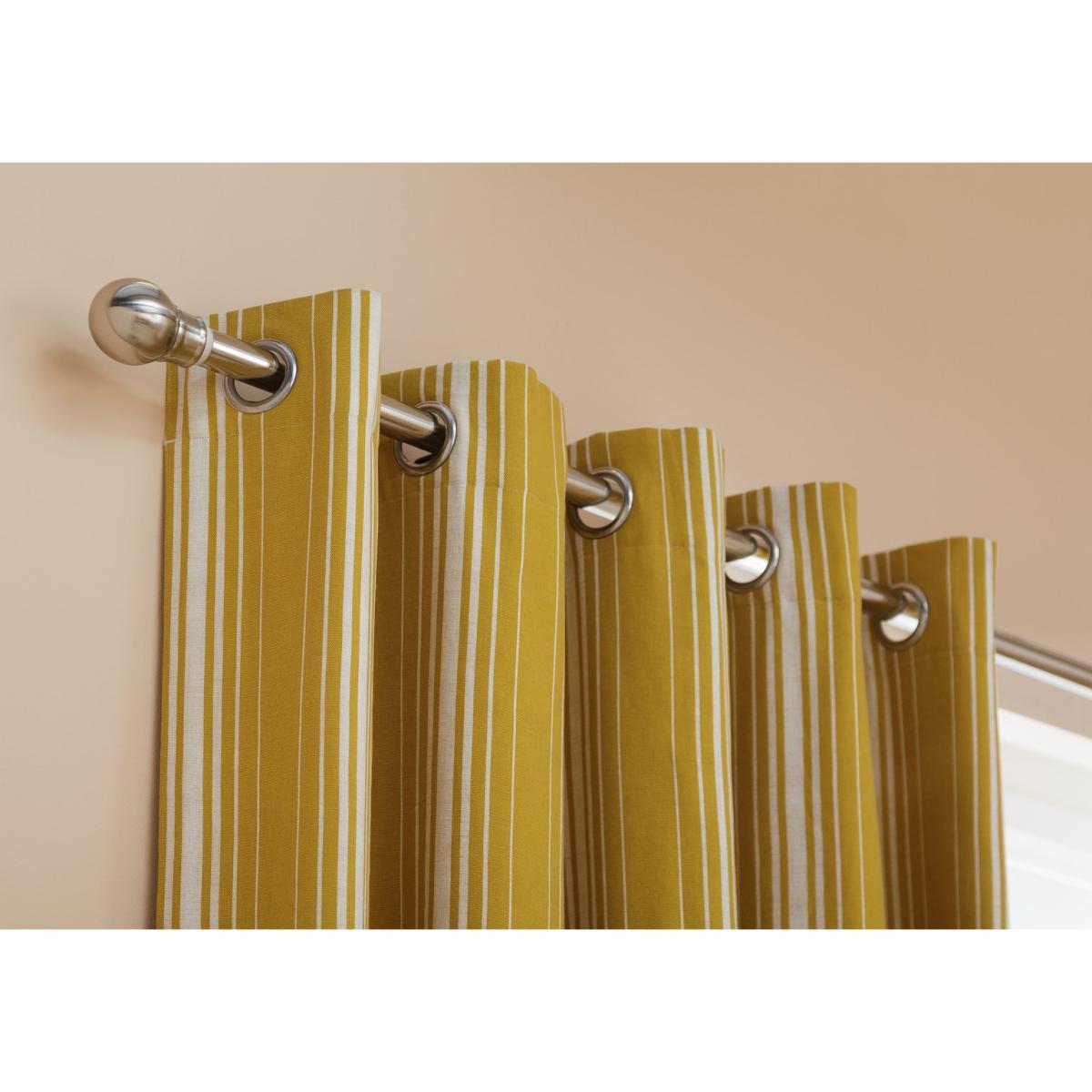 Swoosh. Transform your room and dress your window with our mustard yellow stripe blackout curtains. Eye-catching and stylish they'll certainly lift the mood of your interior. Ready made and easy to hang in soft folds, these are lovely drapes. The eyelet header is a popular look, neat and uncomplicated and makes them easy to open and close. Even better they are 100% cotton and fully lined – so easy to care for. Our design can be mixed and matched with a multitude of colours and styles.