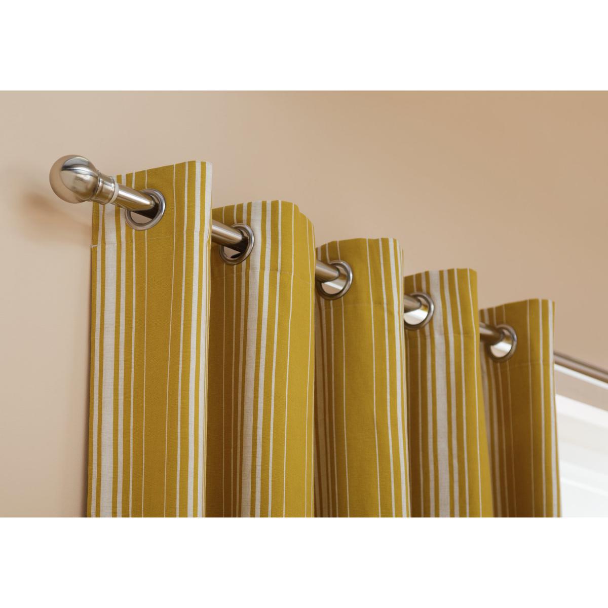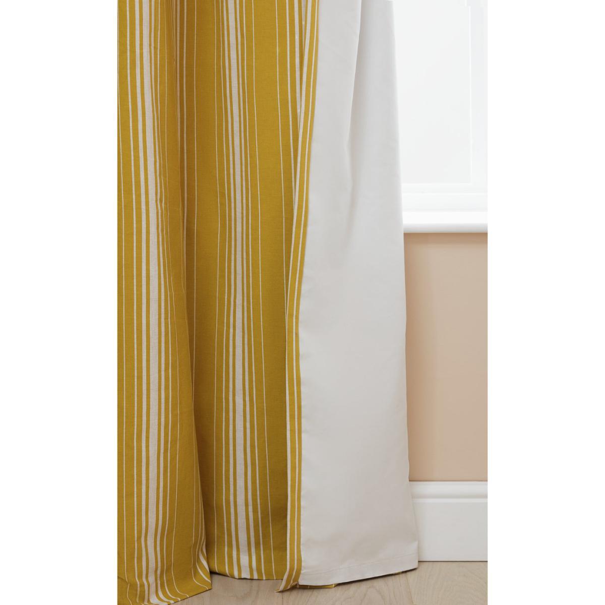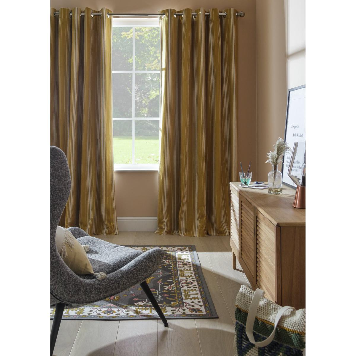 Swoosh. Transform your room and dress your window with our stripe mustard unlined curtains. Eye-catching and stylish they'll certainly lift the mood of your interior. Ready made and easy to hang in soft folds, these are lovely drapes. The eyelet header is a popular look, neat and uncomplicated and makes them easy to open and close. Even better, they are 100% cotton – so easy to care for. Our design can be mixed and matched with a multitude of colours and styles.