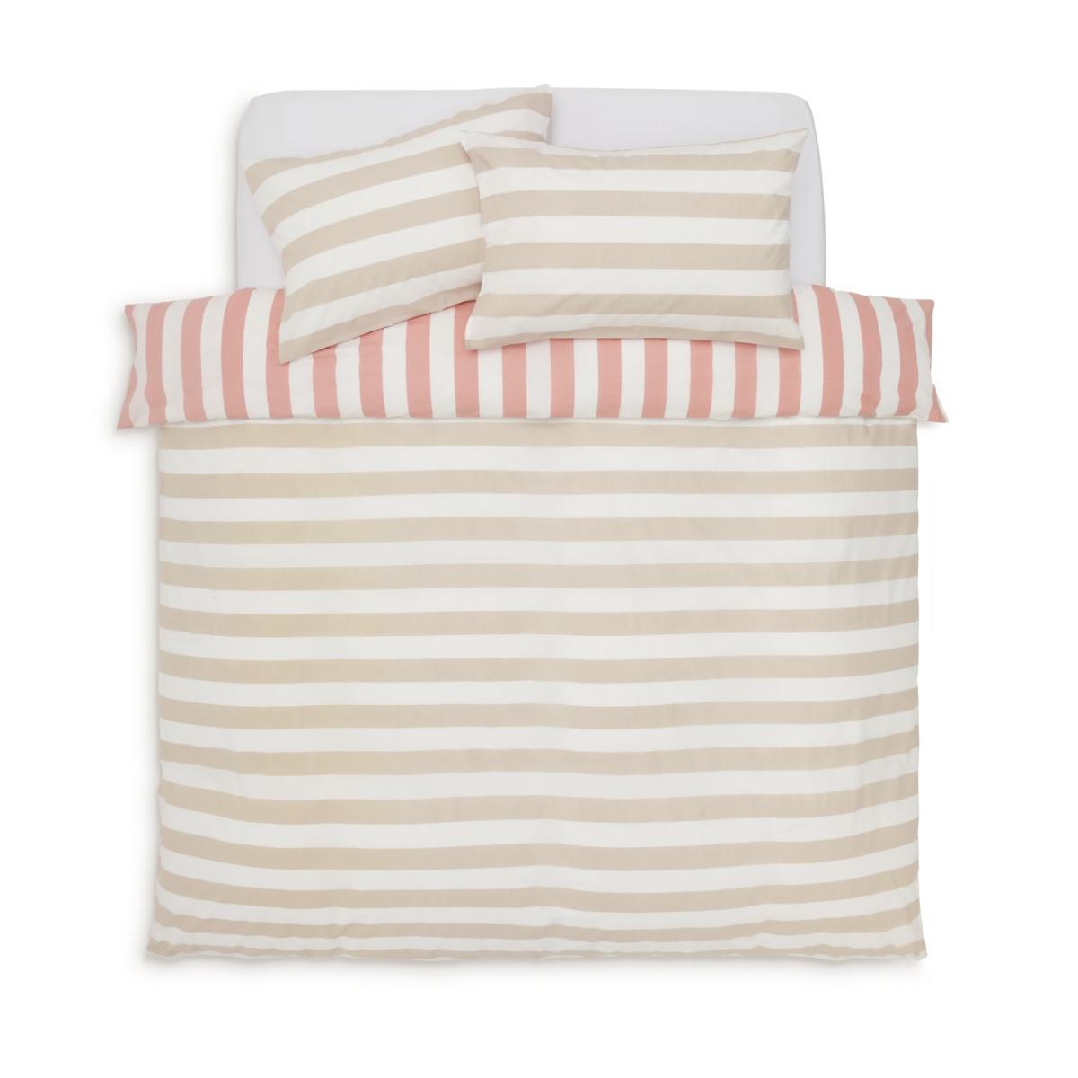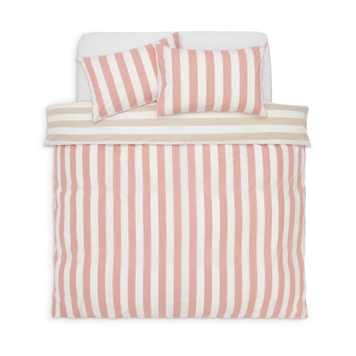 Hello warmer weather. Let's amp up the light and airy bedroom scene with this candy stripe duvet set. Fresh and fun, combining a tad of nostalgia with modern cool. Totally reversible you can opt for pretty in pink one day, and flip or twist for a muted beige and cream the next. Set the mood with your cover choice, and add some colour coded accessories for a lazy, hazy summer. Finish: woven. 52% polyester , 48% cotton, 1006619%. 1006619% , 1006619%, 1006619%. 144 thread count. Set includes 1 duvet cover and 2 pillowcases. Bed size: double. Length 200cm, Width 200cm. Reversible. Buttons for fastening. Standard pillowcase (s). Pillow case length 75cm, Width 50cm. Reversible pillowcase (s). Machine washable at 40 C. Suitable for tumble drying.