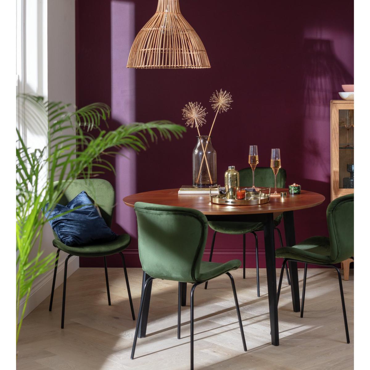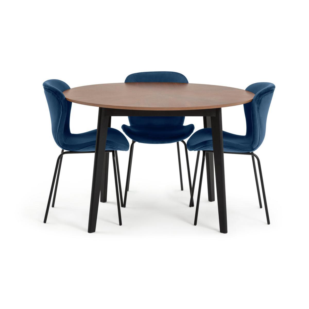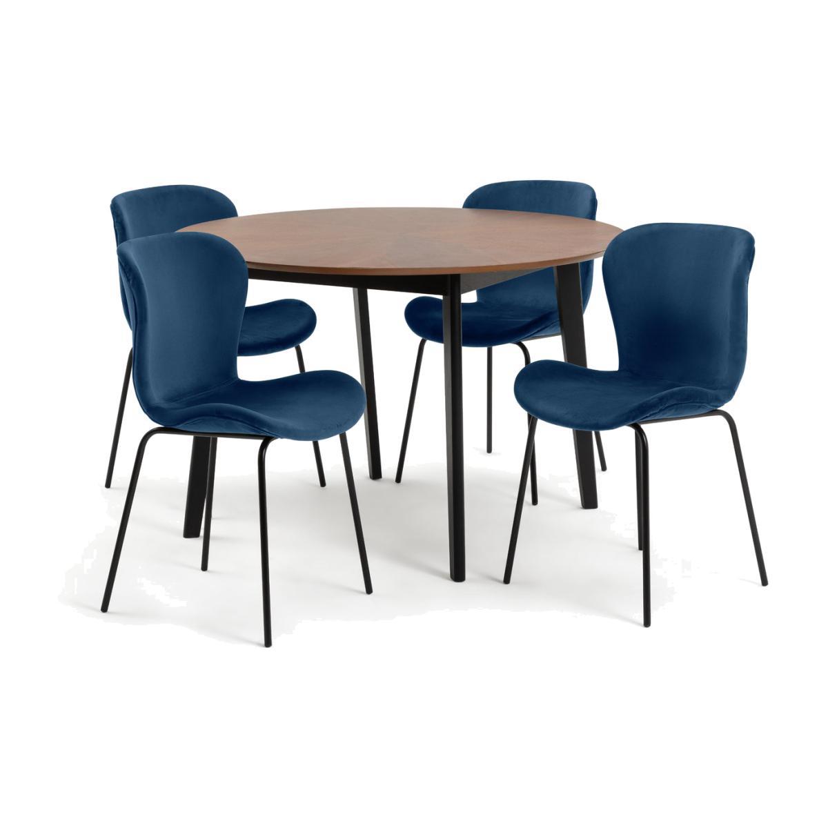 An impressive place to dine. Sunny is an opulent table and chair set that takes your home decor up a notch. Crafted with an elegant walnut veneer top and dark solid wood legs, the circular table is made for those with an eye for the finer things. And look at those shapely blue velvet chairs. They complement the table beautifully. It's classic meets contemporary with a healthy dash of luxe thrown in. Gather round and tuck in.