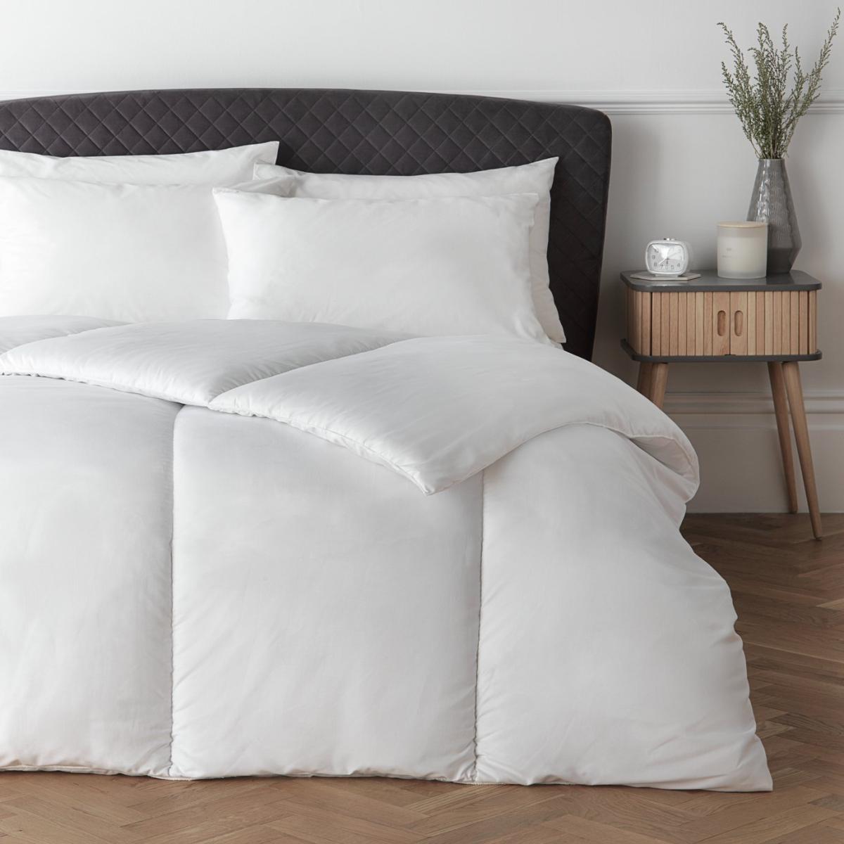 Sink into our Supersoft range for a heavenly night's sleep. Made in the UK, it combines comfort with practicality and is perfect for lazy days in bed. We've chosen a super soft cover to add a luxurious touch and a warm hollowfibre filling to trap air and keep you snug. With a 13.5 tog rating, this duvet is great for the colder months. Filled with 100% recycled polyester. While this duvet is machine washable, we recommend you take it to a professional laundry service for a more thorough clean. King size duvet. 13.5 tog duvet. Cover made from 100% polyester. Filling made from 100% recycled polyester. Size L220, W225cm. Machine washable. Suitable for tumble drying. Non-allergenic.