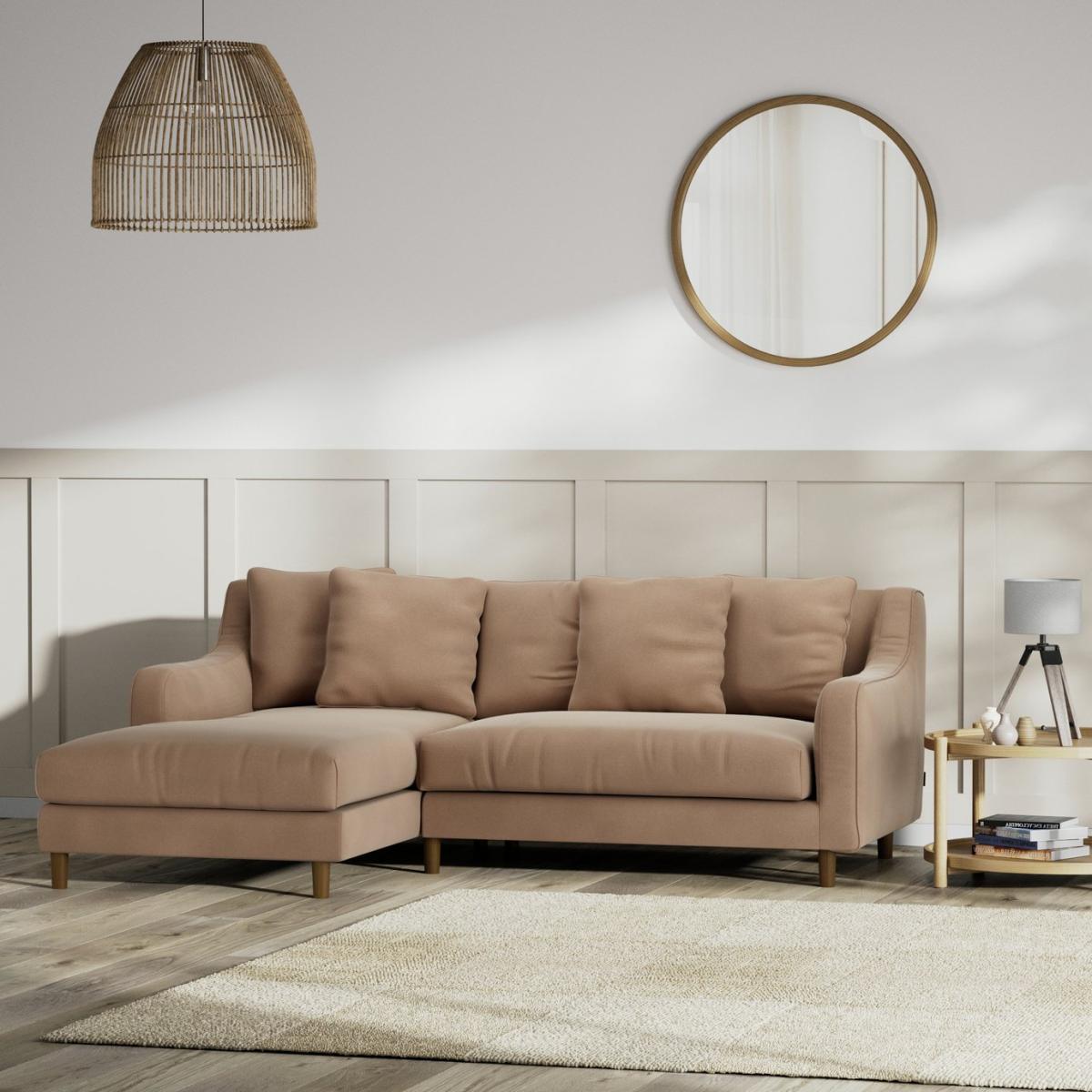 When it's made for you, you know you'll love it. Our comfortable Swift 3-seater left hand chaise is a Habitat classic. The elegant, curved arms and slender legs are a nod to mid-century design. Upholstered in a rich velvet, the Swift takes on a luxe look. With a soft and relaxing seat and a scatter cushion back to lean into. Swift is a striking sofa that's easy to live with. Offering relaxed comfort, the Swift's cushions use high density foam wrapped in a thick fibre quilted wrap to create the perfect balance of support, durability and recovery. Hand made to order in the UK, the Swift uses quality materials and traditional techniques for furniture that's unique to you. Available in a choice of sizes and fabrics including Aquaclean technology protection built into the yarn, which is easy to clean with just water. Part of the Swift collection. Left hand corner. Material: Made from 100% recycled polyester. Wooden feet. Removable seats with fibre filling. Removable cushion(s) with fibre filling. Free fabric swatch available on this line. Dimensions: Size H87, longer width 214,. Floor to seat height: 52cm. Depth of seat: 53cm. Height of seat back: 37.5cm. Longer seating area width between arms: 187cm. Height of arm rest: 60cm. Packaged dimensions: Package size H92, W126, D94cm. Second package size H92, W98, D94cm. General information: We do more than deliver your product, we unpack, set it up and take away the packaging. Manufactured in the UK using components sourced globally. Professional clean only. Plump cushions regularly to maintain shape. Manufacturer's 15 year frame guarantee.