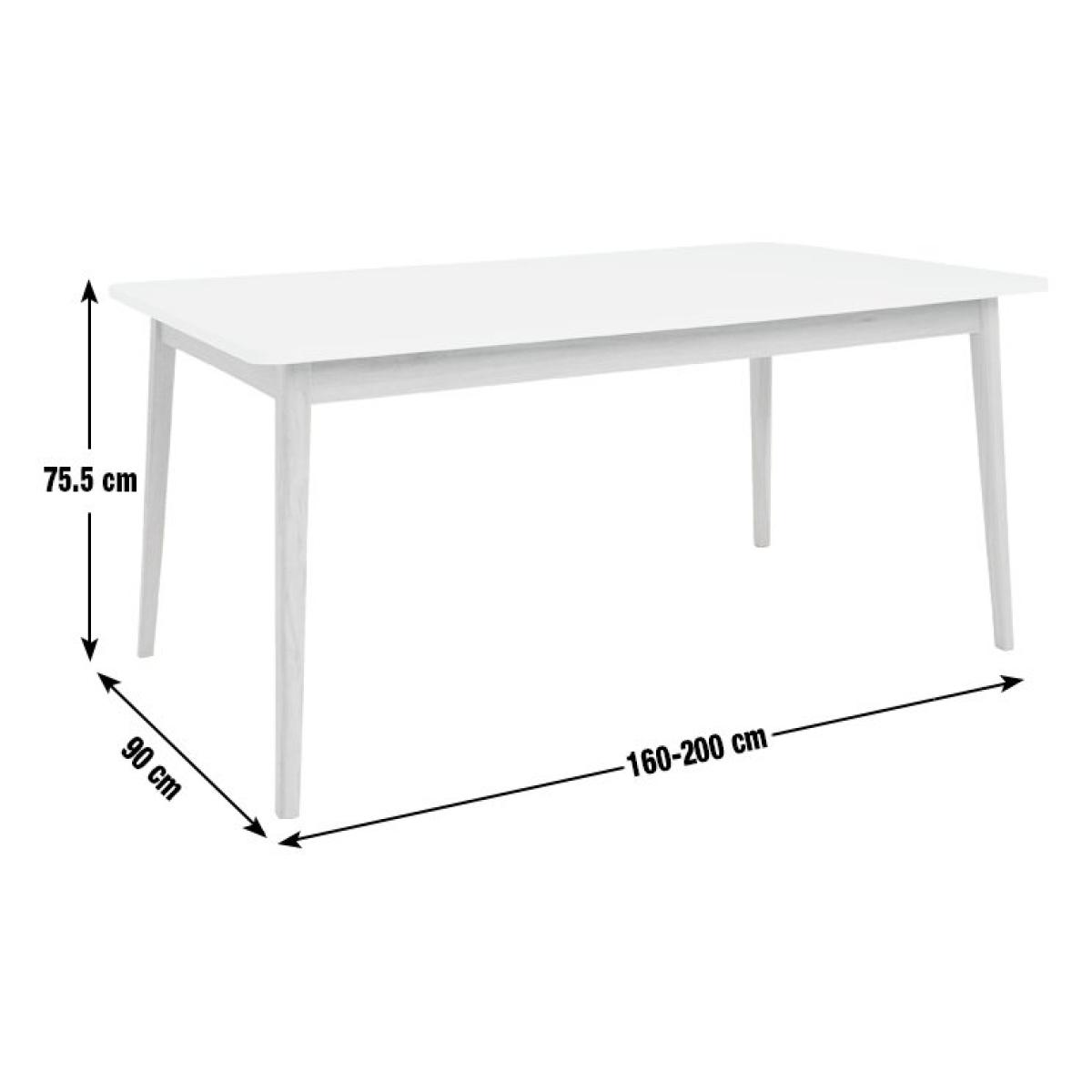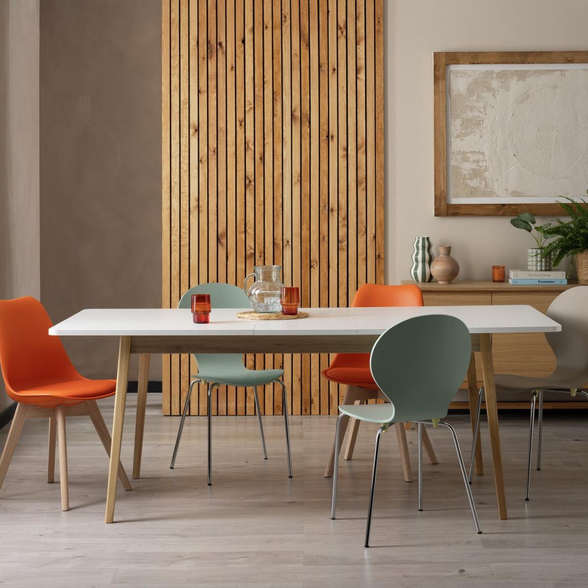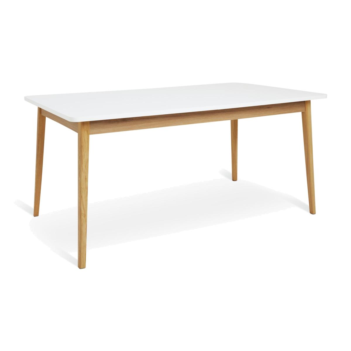 Here's a table that likes a crowd. Our smart Sylas dining table can go from seating 6 to 8 in a jiffy. Just pop in the central extension and the job's done. Fresh and inviting. The bright white top and contrasting solid wood like legs bring a scandi-esque feel to your home. A simple space saving design that's easy to get along with. Part of the Sylas collection. Table: Table size: H75.5, L160, W90cm. Internal size between table legs L138, W68cm. Size of table extended: L200cm. Integral table extension. Removable table extension. Centre leaf extension type. Wood effect table with solid wood legs. Melamine table top finish. Self-assembly - 2 people recommended. Weight of table 39kg. Package Dimensions: Table packaging size: H148, W20, D12.5cm. Table packaging part 2 size: H103, W86, D7cm. General information: Manufacturer's 2 year guarantee. FSC certified meaning the materials used for this product are responsibly sourced.