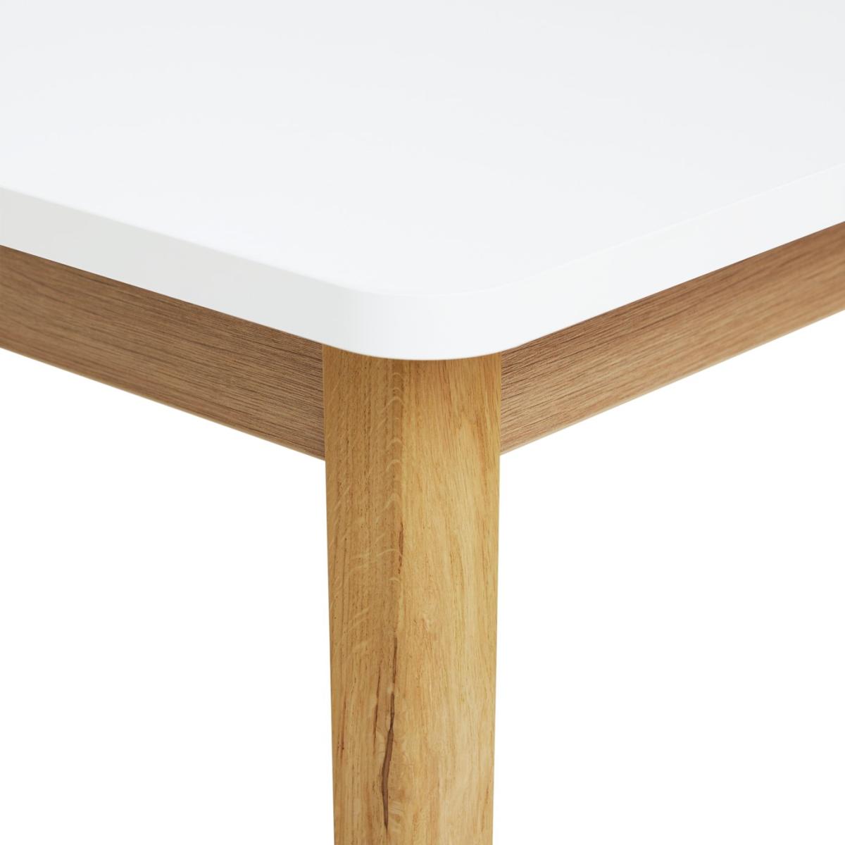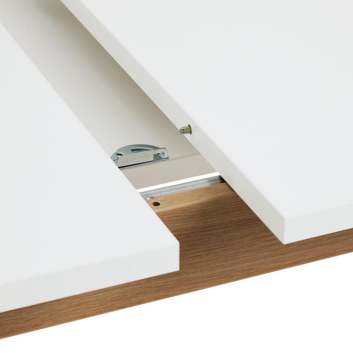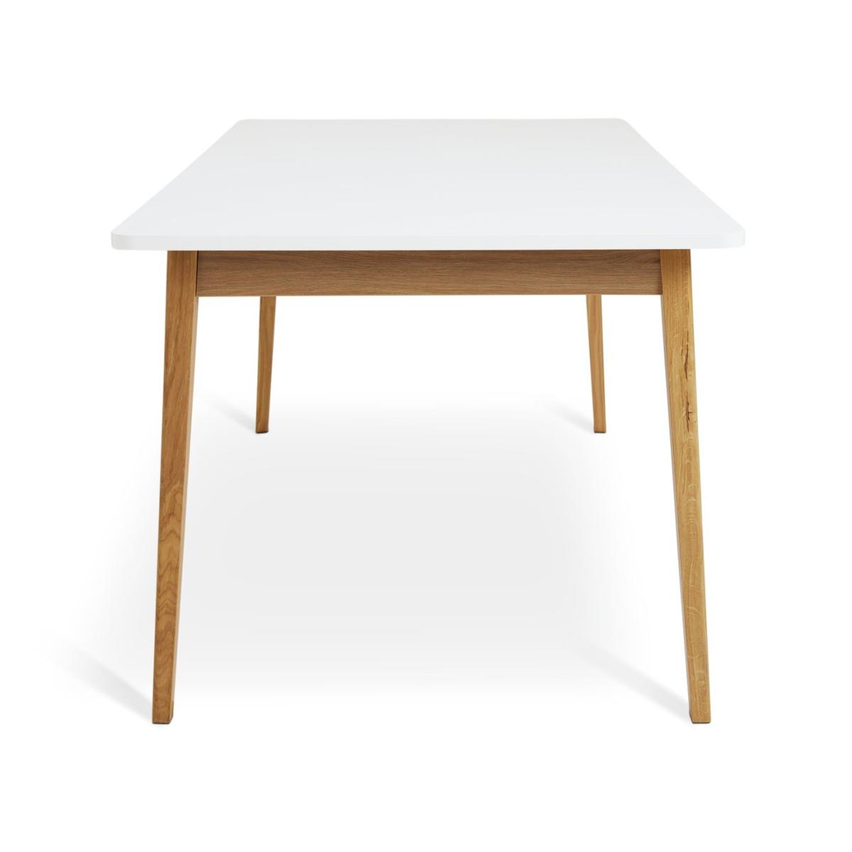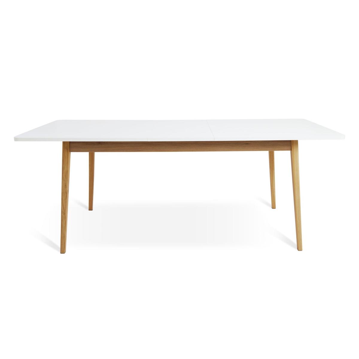 Here's a table that likes a crowd. Our smart Sylas dining table can go from seating 6 to 8 in a jiffy. Just pop in the central extension and the job's done. Fresh and inviting. The bright white top and contrasting solid wood like legs bring a scandi-esque feel to your home. A simple space saving design that's easy to get along with. Part of the Sylas collection. Table: Table size: H75.5, L160, W90cm. Internal size between table legs L138, W68cm. Size of table extended: L200cm. Integral table extension. Removable table extension. Centre leaf extension type. Wood effect table with solid wood legs. Melamine table top finish. Self-assembly - 2 people recommended. Weight of table 39kg. Package Dimensions: Table packaging size: H148, W20, D12.5cm. Table packaging part 2 size: H103, W86, D7cm. General information: Manufacturer's 2 year guarantee. FSC certified meaning the materials used for this product are responsibly sourced.