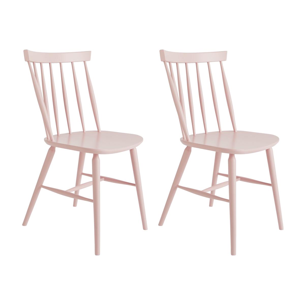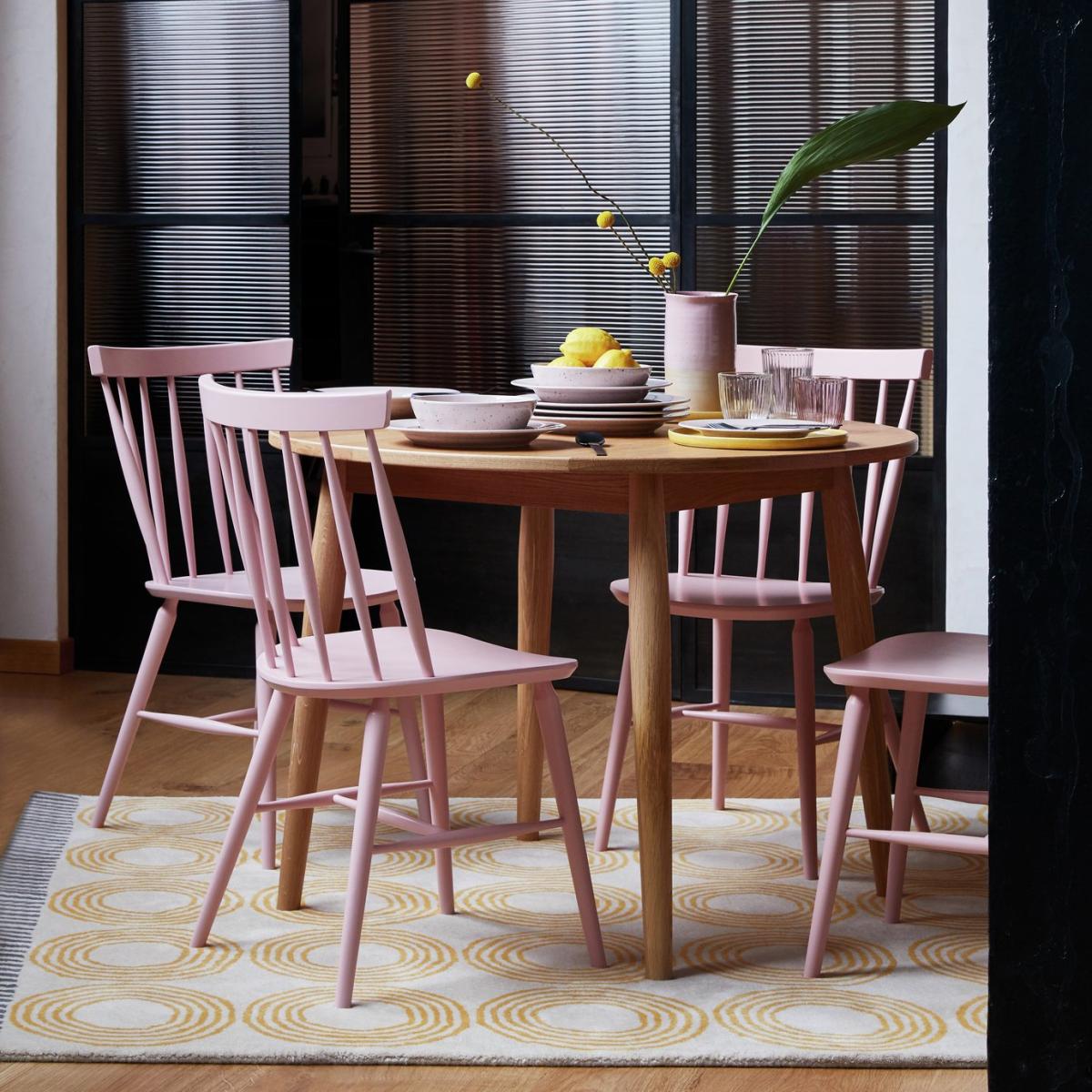 A contemporary update on a traditional design. This pair of striking spindle-back Talia dining chairs work well with a variety of table styles. In pale pink, they can also provide a strong visual contrast. Made from hard-wearing, lacquered solid beech wood with turned rods and a classic H-shaped support structure. Characterful country kitchen chairs. Inviting extra guests over? Buy a few pairs of chairs. And we've different colours too, making it easy for you to mix it up.