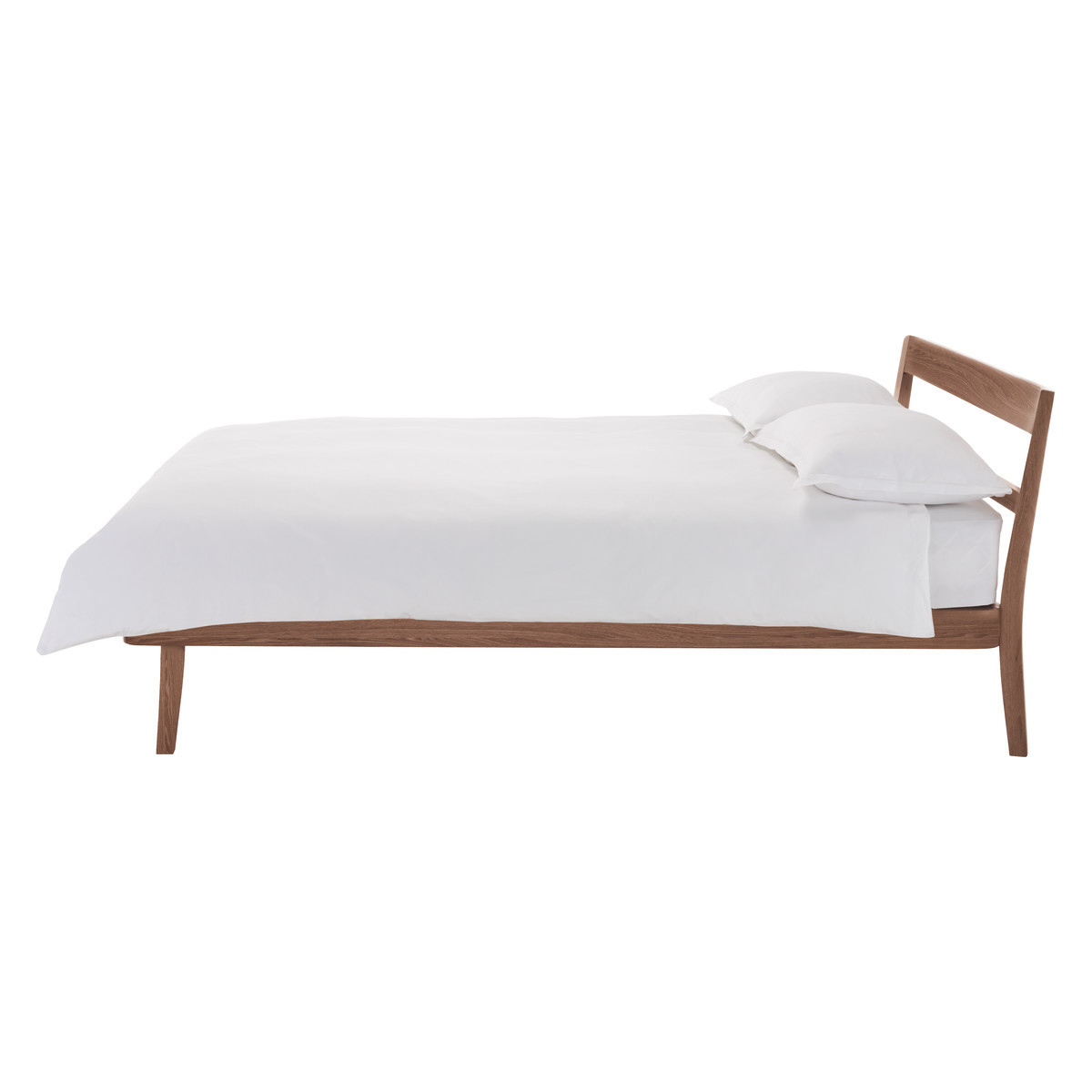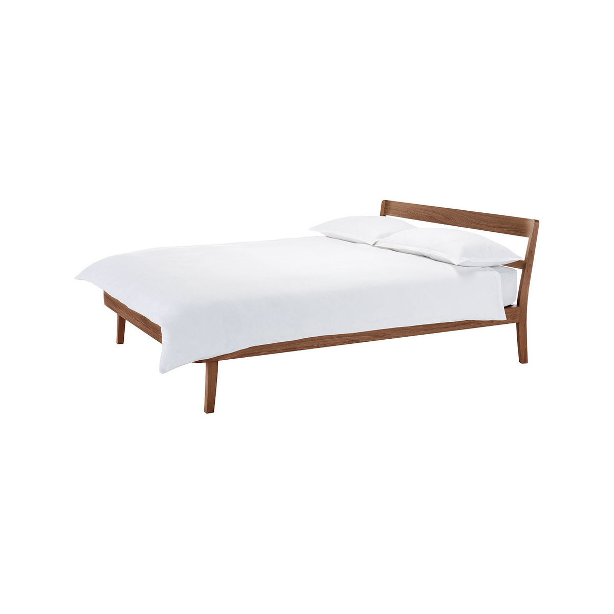 Designed by Habitat's in-house team, the Tatsuma walnut stained double bed is a clean-lined design with a double rail headboard and elegant tapered legs. Part of the Tatsuma bedroom furniture range, the bed complements a variety of interiors and is also available in both ash and a walnut stained finish. Tatsuma is a standard UK size bed frame W135 x L190cm. This bed is designed for a UK size mattress, sold separately. The Tatsuma bedroom range extends to wardrobes, chests and bedside units.