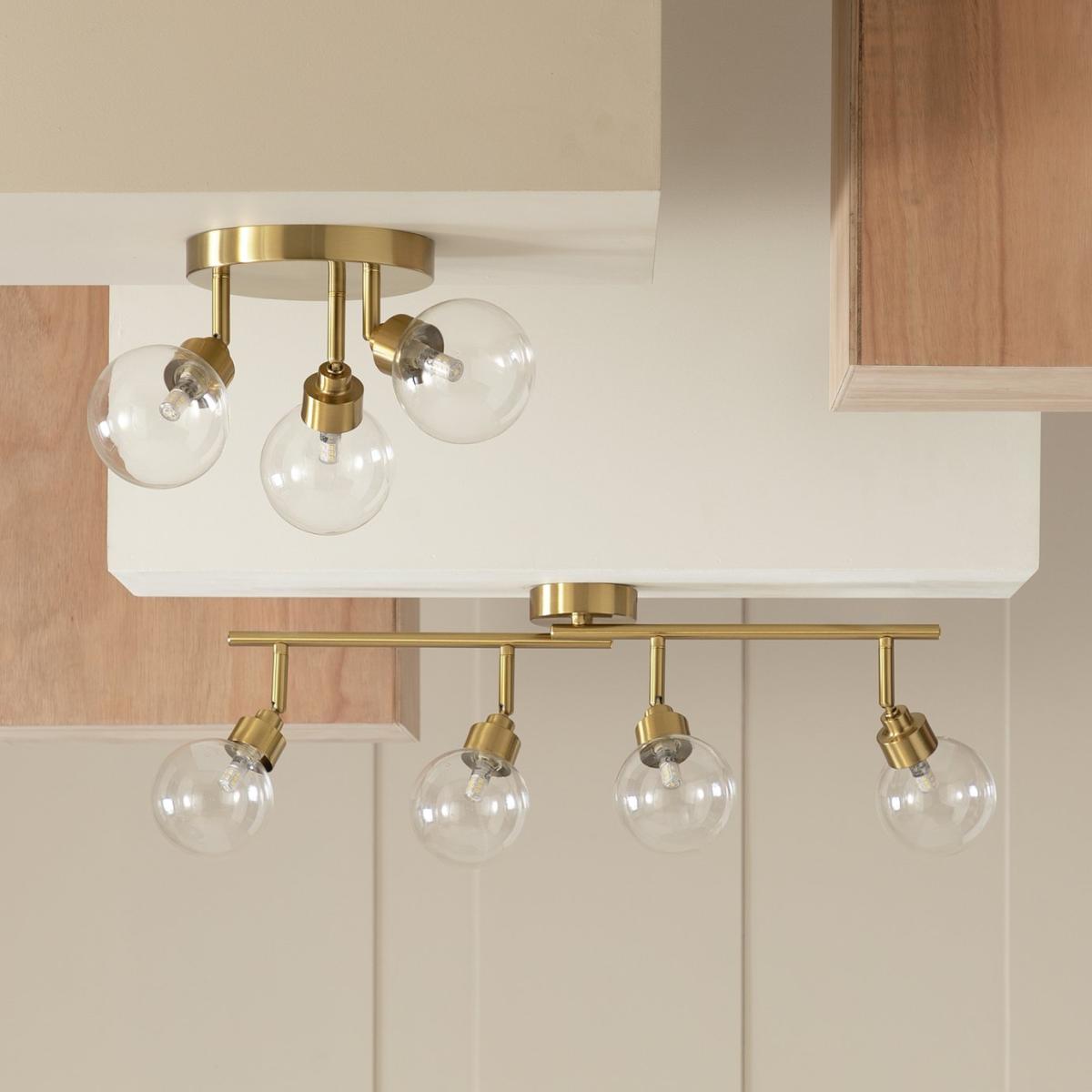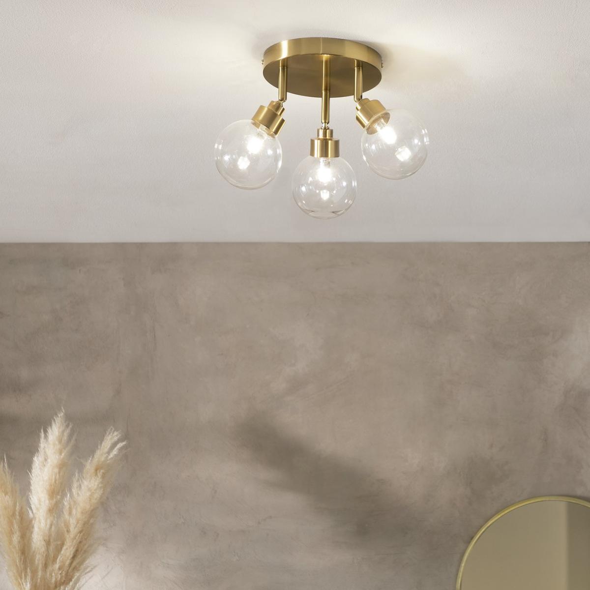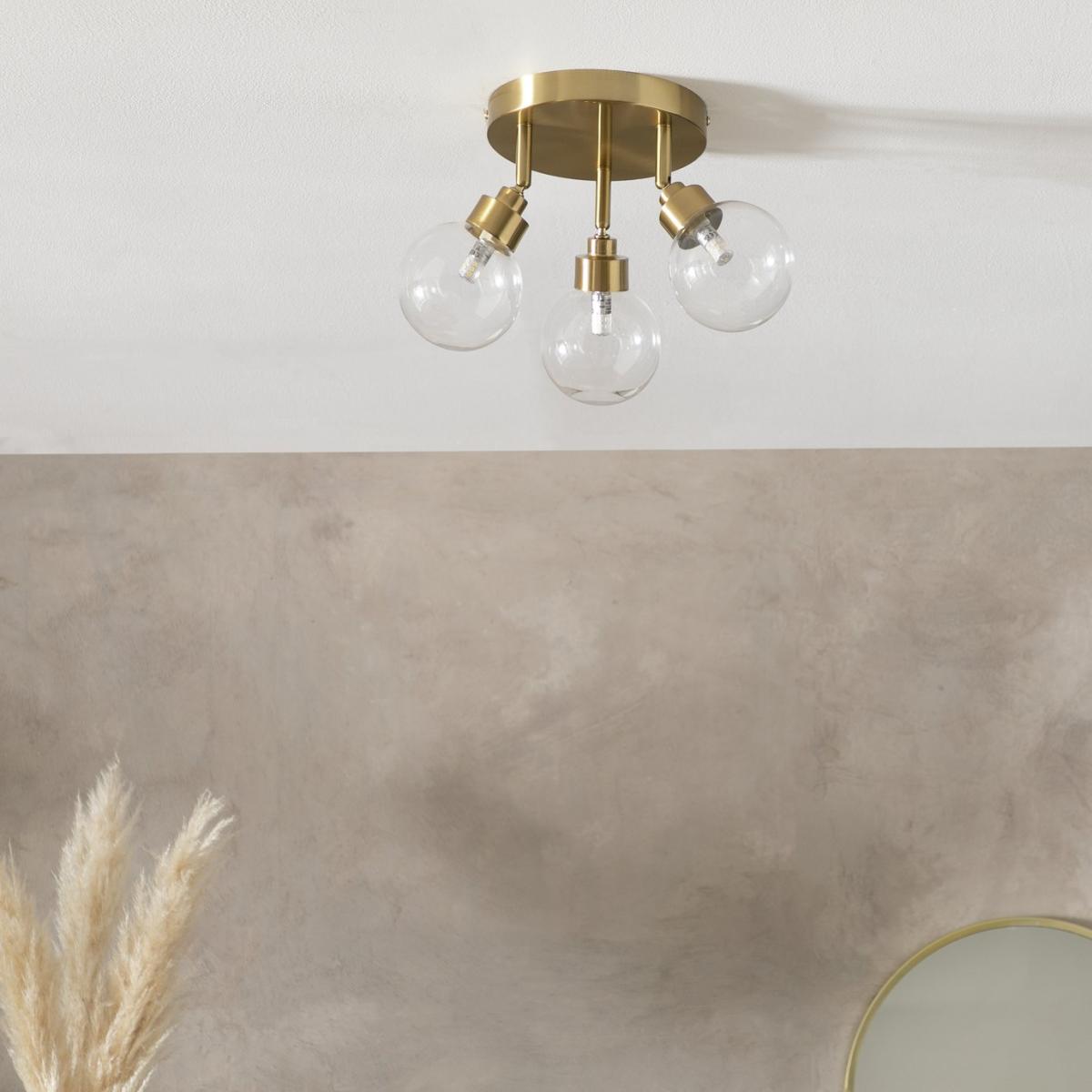 Serving up ceiling style on a plate. With gleaming good looks and a trio of clear globe glass shades, its contemporary meets classic with this spotlight. Practical too. Each of the 3 globes can be angled to throw light just where you want it. Made from steel with a warm brass finish. Part of the Tay collection. Dimensions: Size H20.5, W34, D34cm. Diameter 34cm. Bulb Information: Bulbs required 3 x capsule G9 LED (not included). Recommended maximum wattage: 5 watts. Can not be used with a dimmer switch. LED bulb only. General Information: Steel. - not suitable for bathroom use. Weight: 0.61kg. Minimal assembly. Product is hard-wired into electrics. Manufacturer's 1 year guarantee.