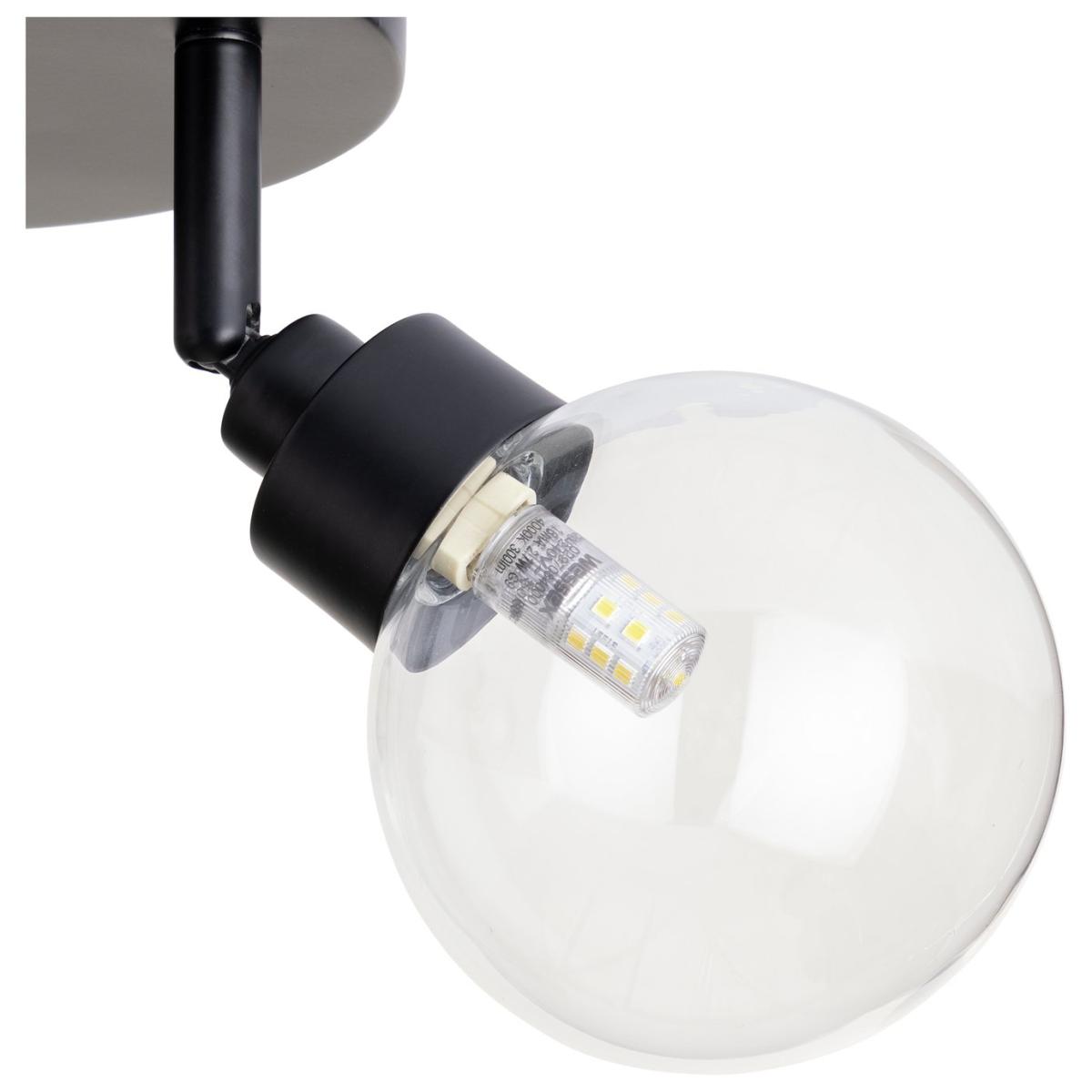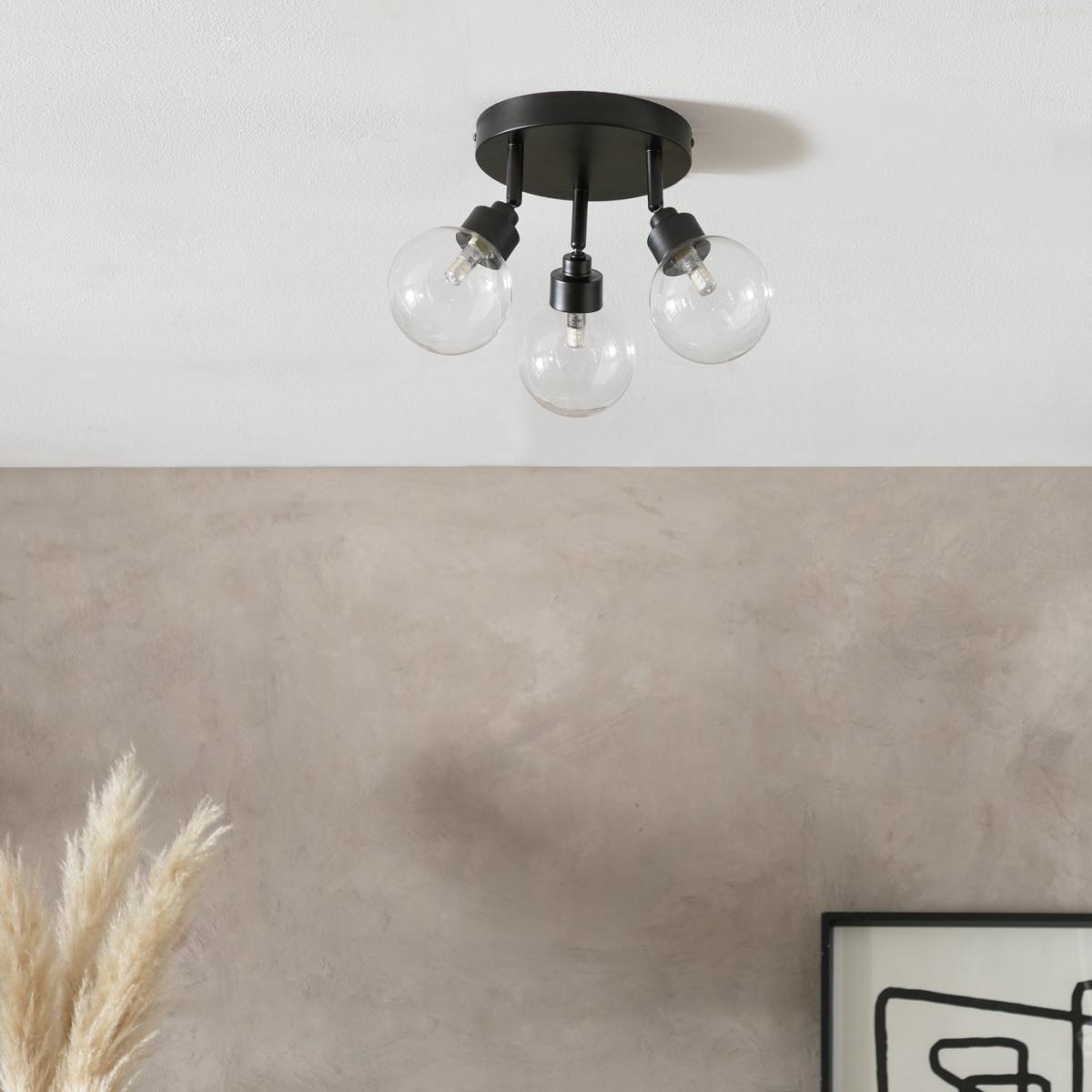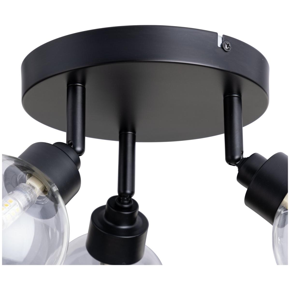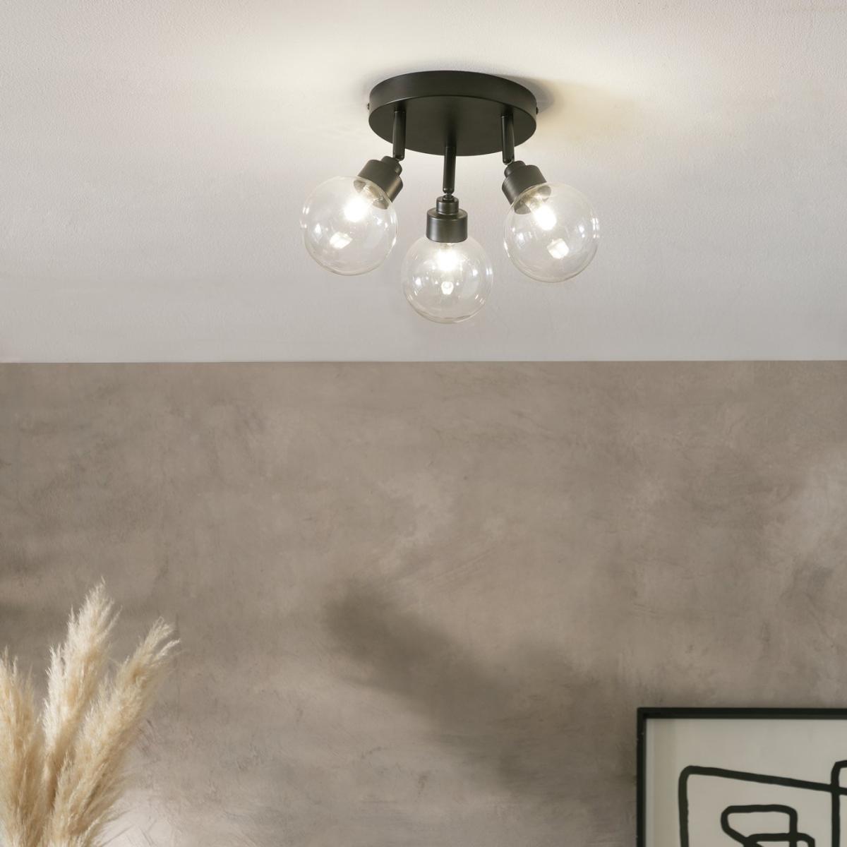 Serving up ceiling style on a plate. With dark good looks and a trio of clear globe glass shades, its contemporary meets classic with this spotlight. Practical too. Each of the 3 globes can be angled to throw light just where you want it. Made from steel with a matt black finish. Part of the Tay collection. Dimensions: Size H20.5, W34, D34cm. Diameter 34cm. Bulb Information: Bulbs required 3 x capsule G9 LED (not included). Recommended maximum wattage: 5 watts. Can not be used with a dimmer switch. LED bulb only. General Information: Steel. - not suitable for bathroom use. Weight: 0.61kg. Minimal assembly. Product is hard-wired into electrics. Manufacturer's 1 year guarantee.