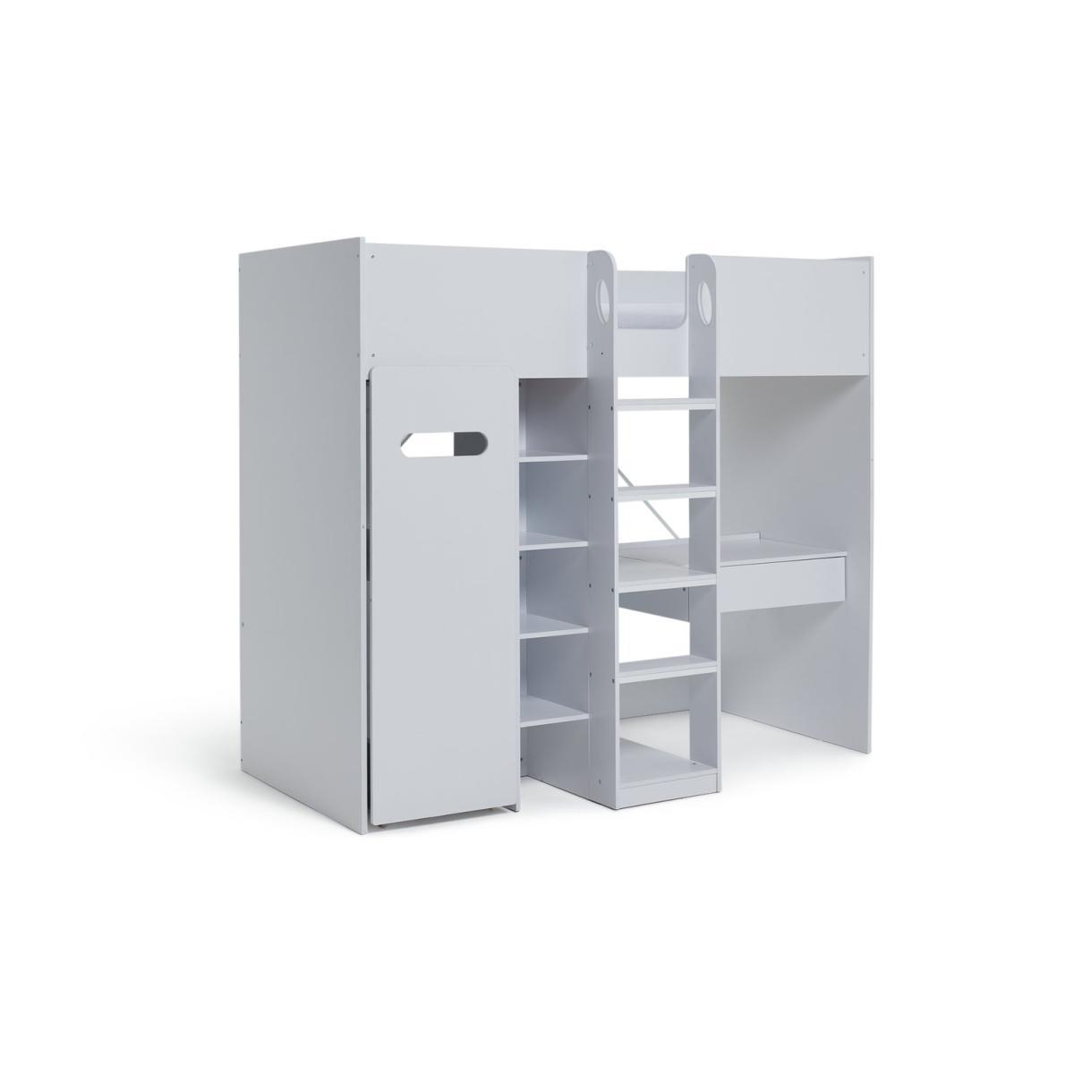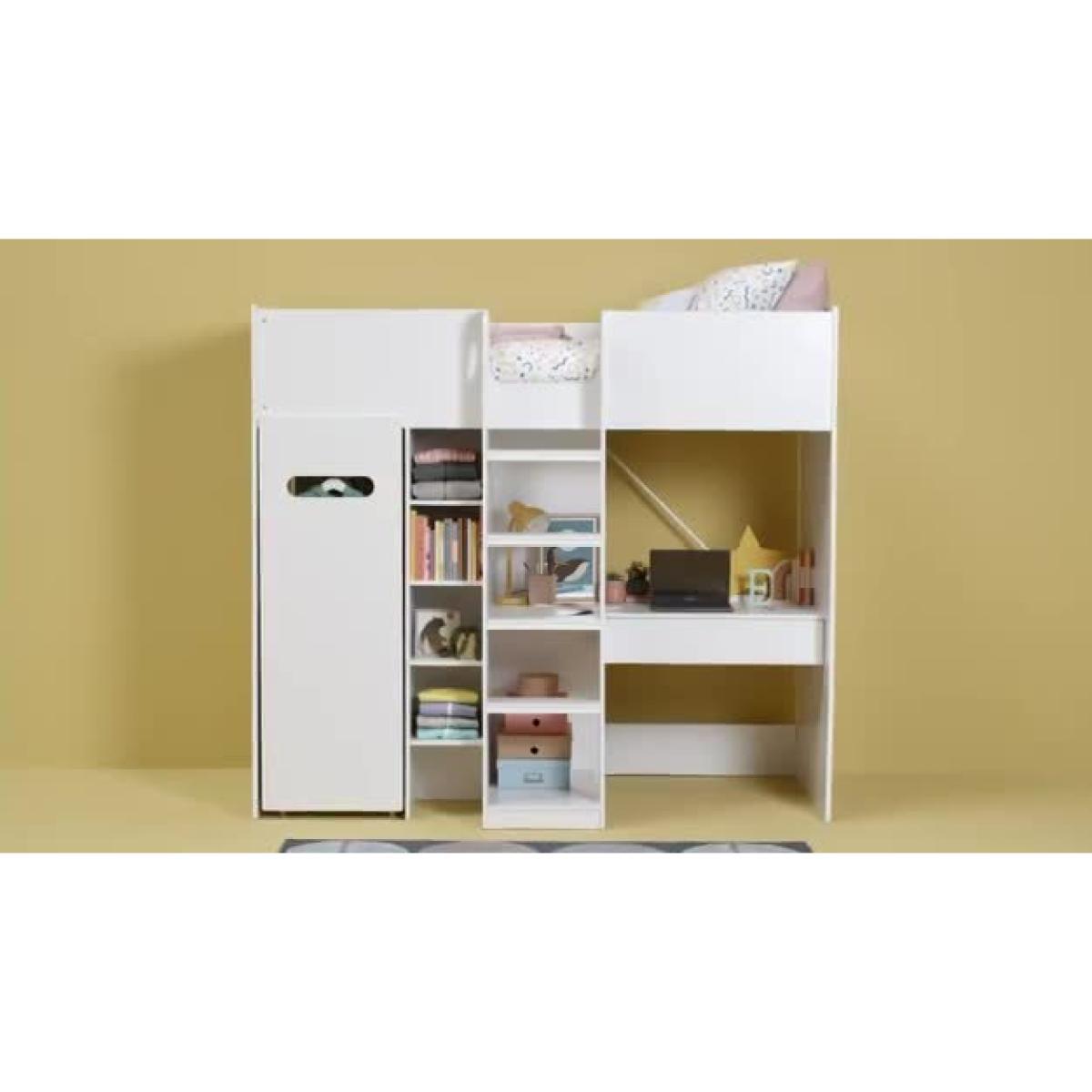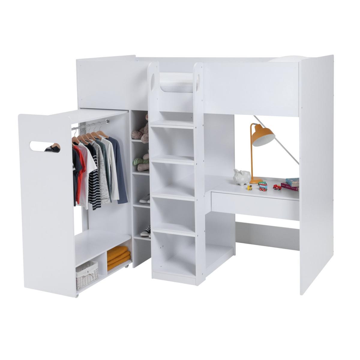 Big kid, big space? Not necessarily. Take this Taylor high sleeper for example. Designed with growing kids in mind, it's got everything they need in one tidy footprint: A high bed with high sides hidden away up top, a pull out wardrobe with shelf space built-in, a desk with drawer – great for gaming or getting homework done – and loads more shelf and storage space for books and games. The central ladder lets them choose which end to rest their head. And the bright white easy-clean finish means this loft bed won't dominate the space. Clever huh?