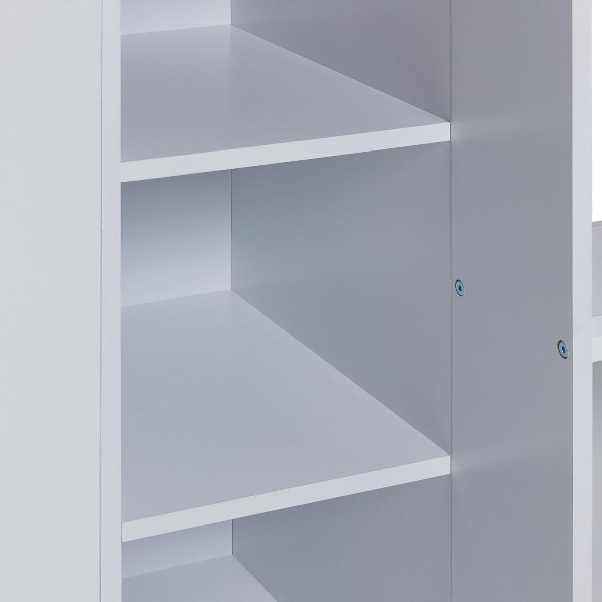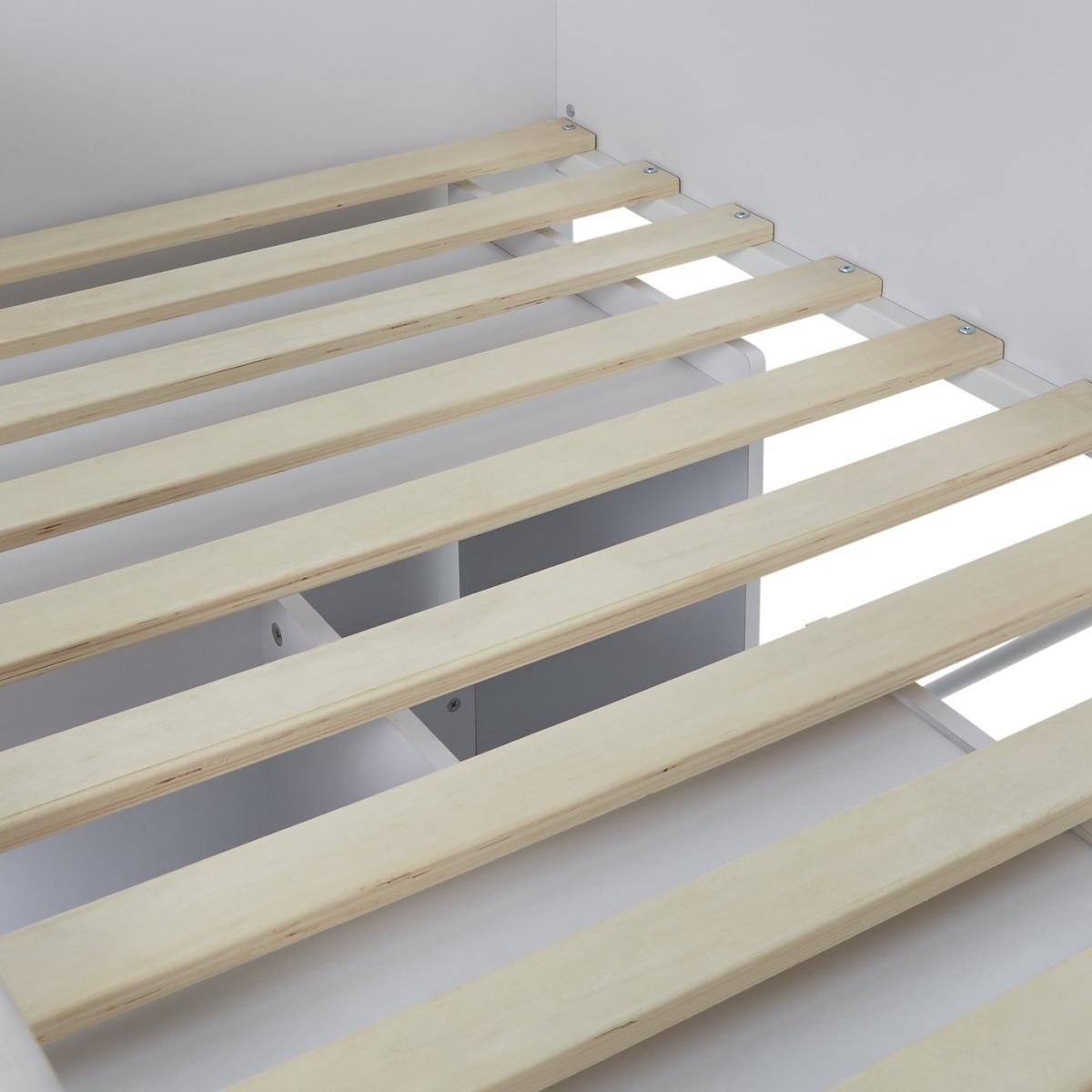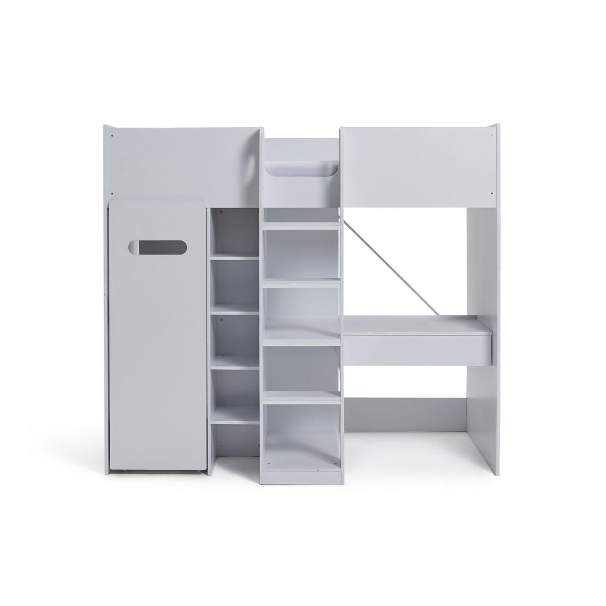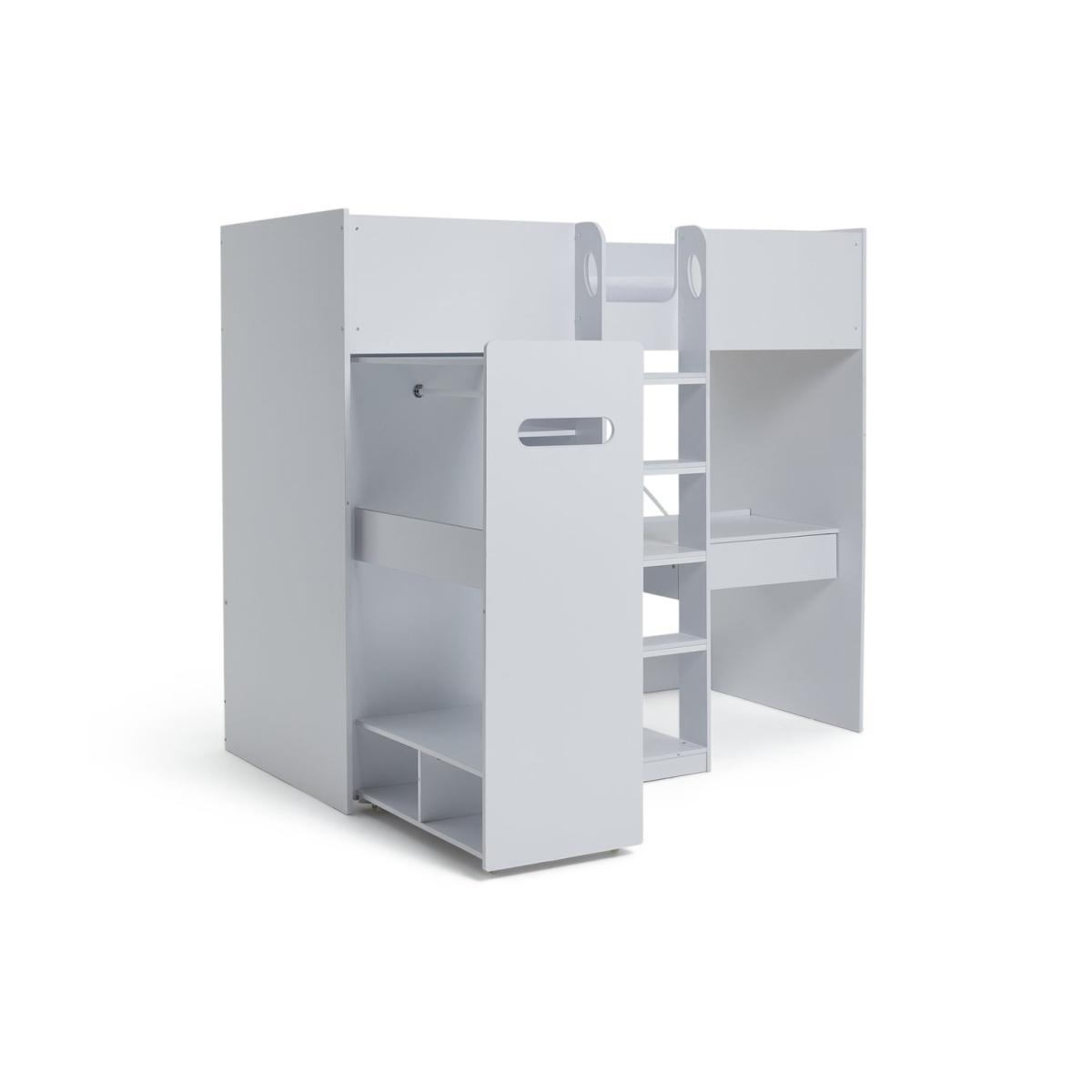 Big kid, big space? Not necessarily. Take this Taylor high sleeper for example. Designed with growing kids in mind, it's got everything they need in one tidy footprint: A high bed with high sides hidden away up top, a pull out wardrobe with shelf space built-in, a desk with drawer – great for gaming or getting homework done – and loads more shelf and storage space for books and games. The central ladder lets them choose which end to rest their head. And the bright white easy-clean finish means this loft bed won't dominate the space. Clever huh?