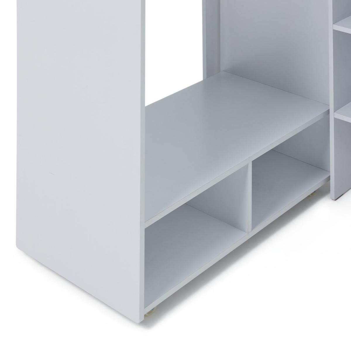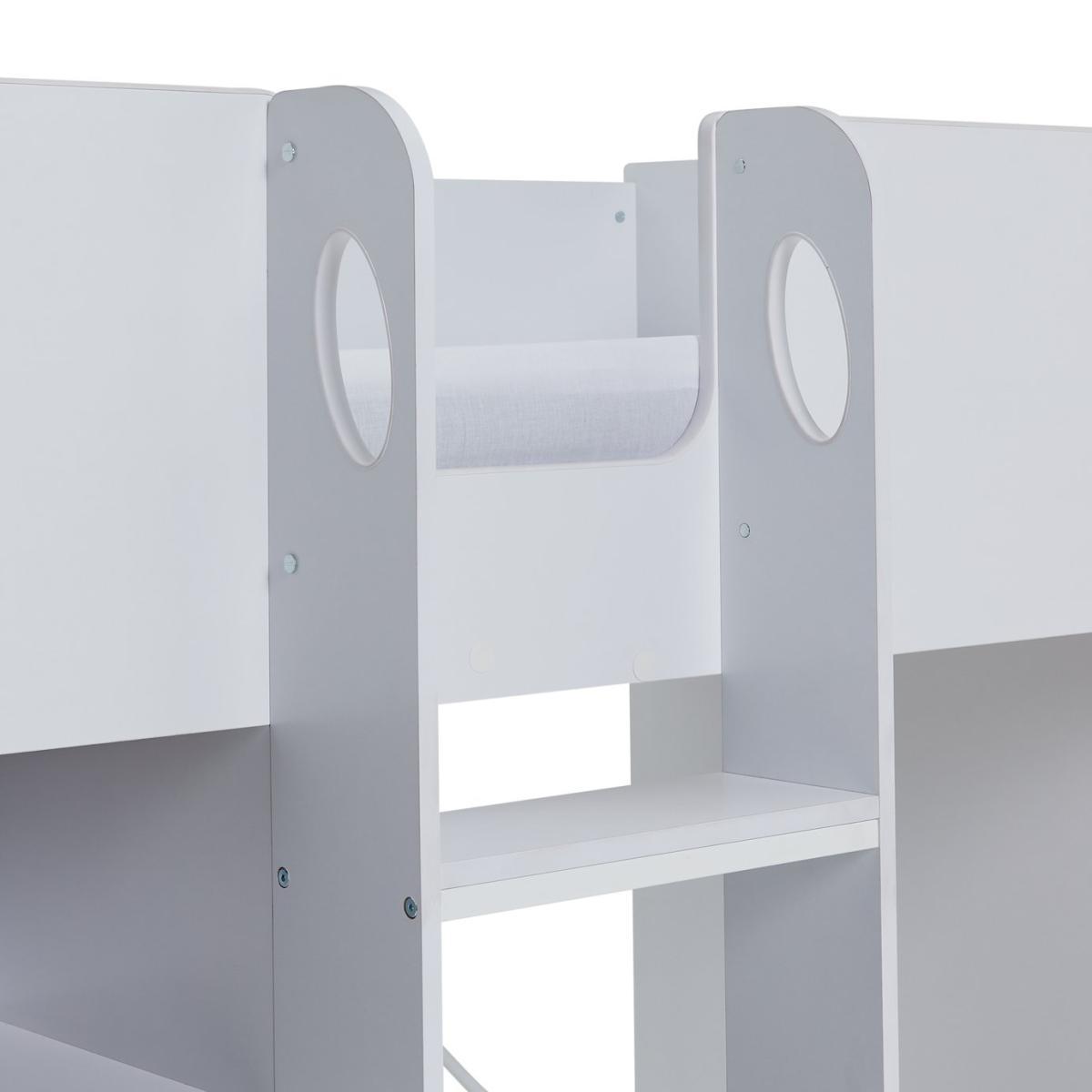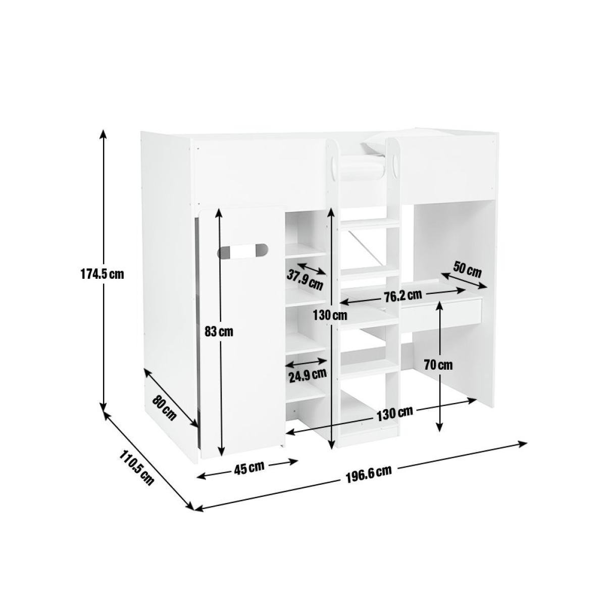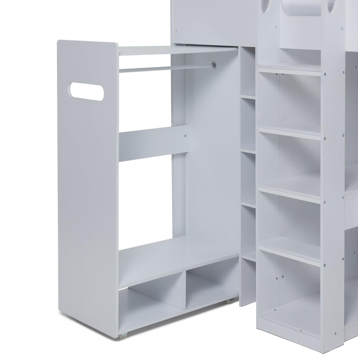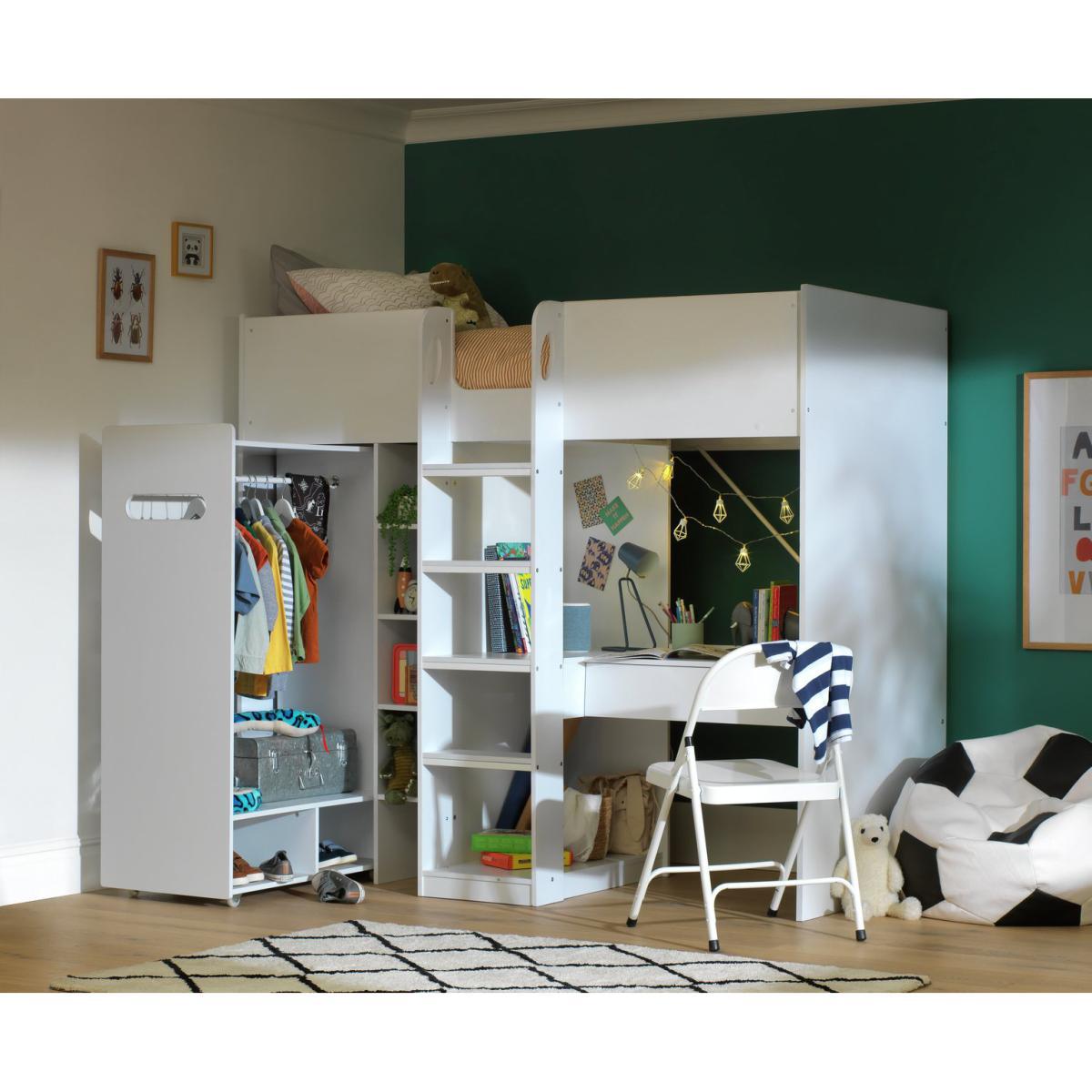 Big kid, big space? Not necessarily. Take this Taylor high sleeper for example. Designed with growing kids in mind, it's got everything they need in one tidy footprint: A high bed with high sides hidden away up top, a pull out wardrobe with shelf space built-in, a desk with drawer – great for gaming or getting homework done – and loads more shelf and storage space for books and games. The central ladder lets them choose which end to rest their head. And the bright white easy-clean finish means this loft bed won't dominate the space. Clever huh?