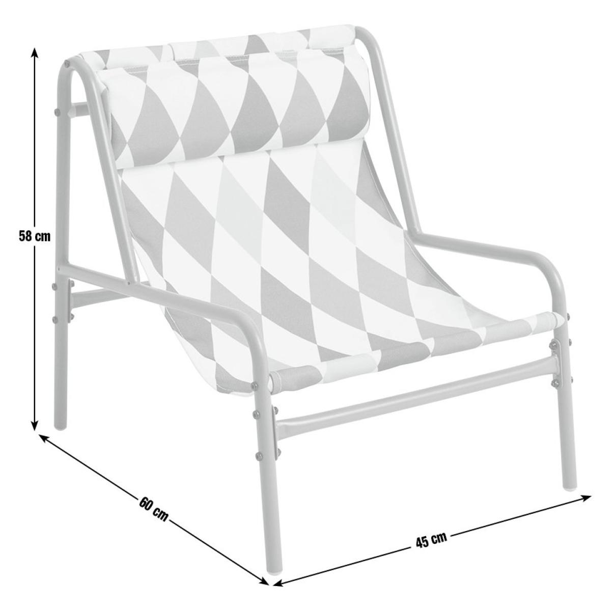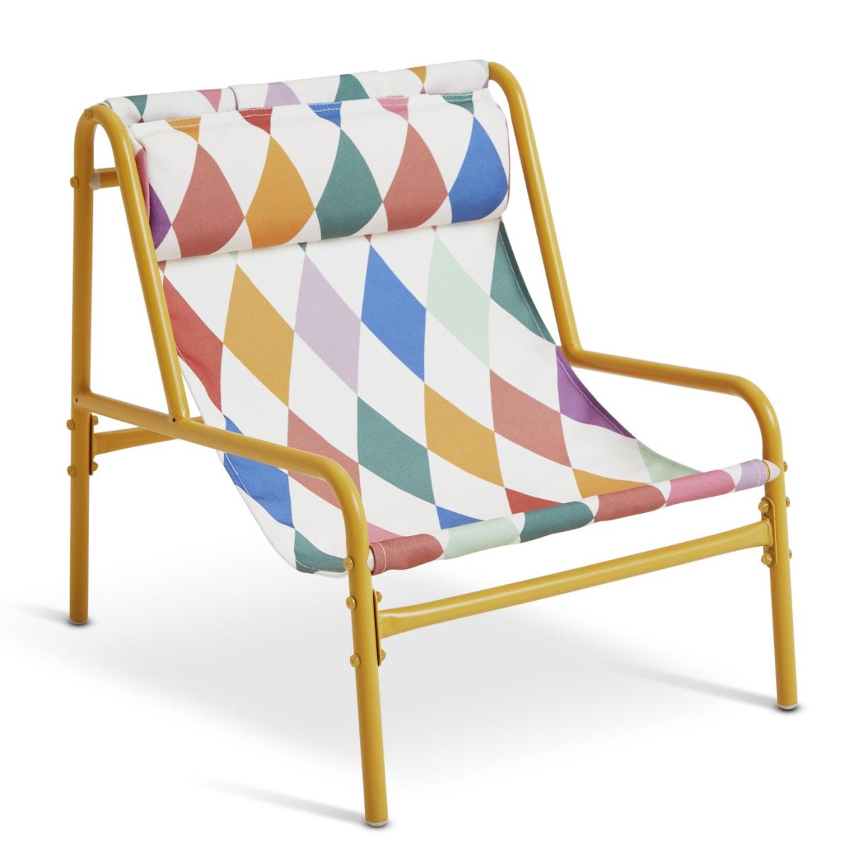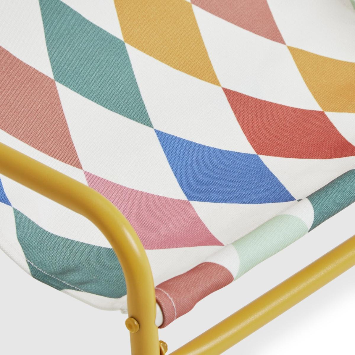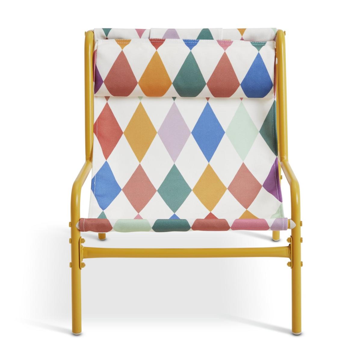 Let your kids get comfy in their very own outdoor seat. Smartly designed the supportive sling-style multi-coloured harlequin canvas seat is paired with a strong steel yellow frame. And that built-in cushioned headrest? Great for those moments when play time winds down. Ready for some sunshine daydreaming? Fancy a charming parent-child matching moment? Colourful Teka comes in adult size too, because greet style runs in the family. Metal frame. Chair seat and back made from fabric. Does not recline to a flat position. Fixed foot rest. Cushions: Polyester cushion cover. Cushions are shower proof, but should be stored inside when not in use. Dimensions: Size H58, W45, D60cm. Weight 3.3kg. Seat height from ground 24cm. Arm rest height from ground 30cm. Seating area size W40, D30cm. Maximum user weight 50kg. Package Dimensions: Package 1 dimensions: H61, W6, D55.5cm. Package 1 weight:4.5kg. General information: Self-assembly - 2 people required. Store inside when not in use. Cover or store inside in winter months to prolong life of product. Manufacturer's 1 year guarantee.