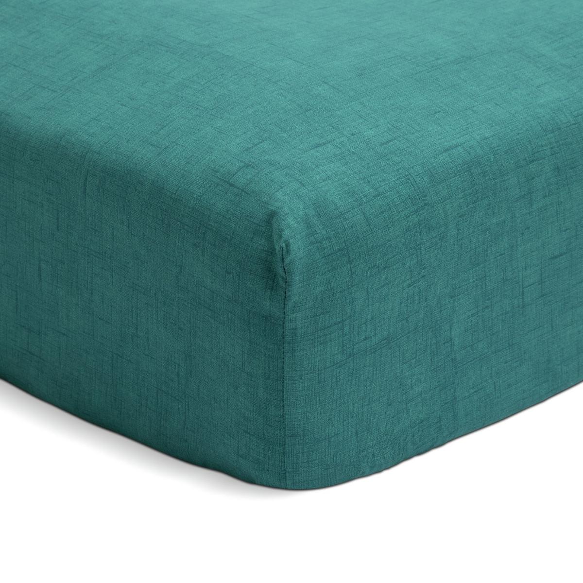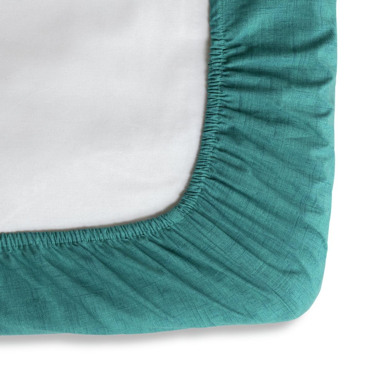 Smart bedding. You'll love how easy our fitted sheet makes bed changes. Just stretch snugly over your mattress, pop elasticated corners on and voila. It'll stay put and crease-free. And it's a looker too, with a Scandi style brushstroke texture in a deep jewel green. This item carries the STANDARD 100 by OEKO-TEX logo, which means you can be certain that every component has been tested for harmful substances and is therefore harmless to human health. Fabric finish: percale. 50% recycled polyester, 50% cotton. 144 thread count. Double. Size L190, W135cm. Suitable for mattress depth of 28cm. Depth of frill 28cm. Elasticated corners. Machine washable.