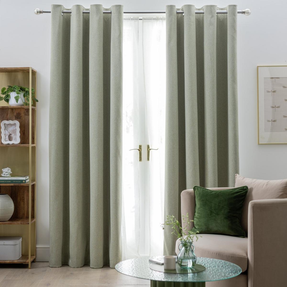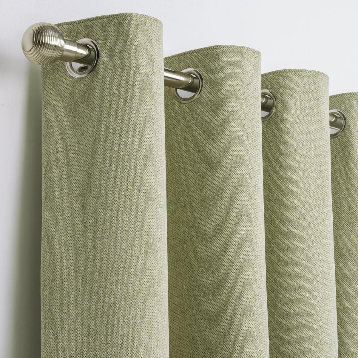 Need a nice dark room to get a good night's sleep? Yep, so do we. That's why we love this pair of textured blackout curtains. They'll help keep the light out, making sure you get a decent rest all year round. We've chosen an eyelet header to give them soft, wide folds and for ease of installation. There's no fiddling required, simply slot them onto the curtain pole and you're done. Green. Silver stainless iron Eyelets. Features Blackout. Made from 100% polyester. Lined. Lining made from 100% polyester. Dimensions Size 168cm (66 inches) wide by 229cm (90 inches) drop. Width refers to one curtain panel before hanging. Eyelet diameter: 4cm.