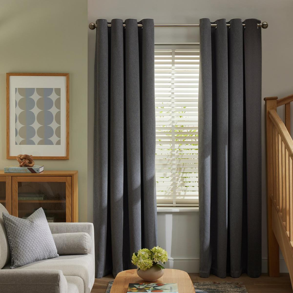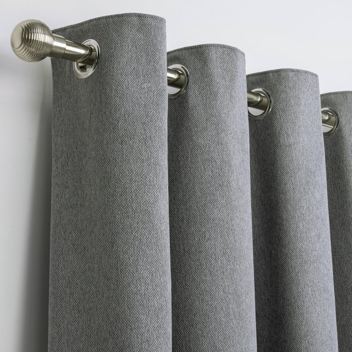 Need a nice dark room to get a good night's sleep? Yep, so do we. That's why we love this pair of textured blackout curtains. They'll help keep the light out, making sure you get a decent rest all year round. We've chosen an eyelet header to give them soft, wide folds and for ease of installation. There's no fiddling required, simply slot them onto the curtain pole and you're done. Grey. Silver stainless iron Eyelets. Features Blackout. Made from 100% polyester. Lined. Lining made from 100% polyester. Dimensions Size 168cm (66 inches) wide by 229cm (90 inches) drop. Width refers to one curtain panel before hanging. Eyelet diameter: 4cm.