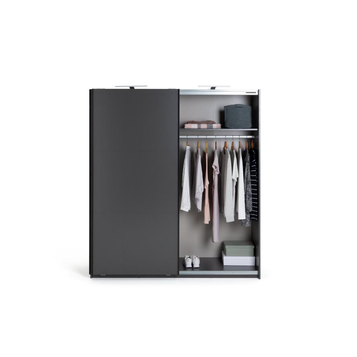 Stylish and smart. Our Tokyo 2 Door Sliding Wardrobe offers a versatile solution to all your storage needs. With 2 strong hanging rails and 2 sturdy shelves, there's ample space for all your favourite clothes, shoes and accessories. The warm, dark anthracite outer works well with contemporary or modern decors. Time to get dressed. Slide the German engineered doors silently open and LED lights will flicker with the help of footswitch on ready for you to choose your outfit. That's neat.