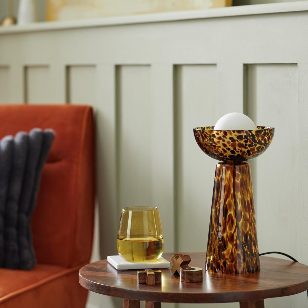 A table lamp or a work of art? Our sculptural tortoiseshell glass lamp is a collector's piece. Rich, warm and a touch exotic, it feels glamorously indulgent. And topping it all off is an opaque ball like shade within a shade. One to delight the designer in you. An inline switch makes for easy on, easy off. Dimensions: Overall size H29.7, Diameter 15cm. Shade size H3.7, D9cm. Diameter of base 10cm. Cord length 1.8m. Bulb Information: Bulbs required 1 x capsule G9 LED bulb(s) (not included). Recommended maximum wattage: 3 watts. General Information: Shade colour: multicoloured. Base colour: multicoloured. Shade material: glass. Base material: glass. In-line switch. IP rating 20 - not suitable for bathroom use. Supplied assembled. Product is mains powered plug in. Mirage. Manufacturer's 1 year guarantee.