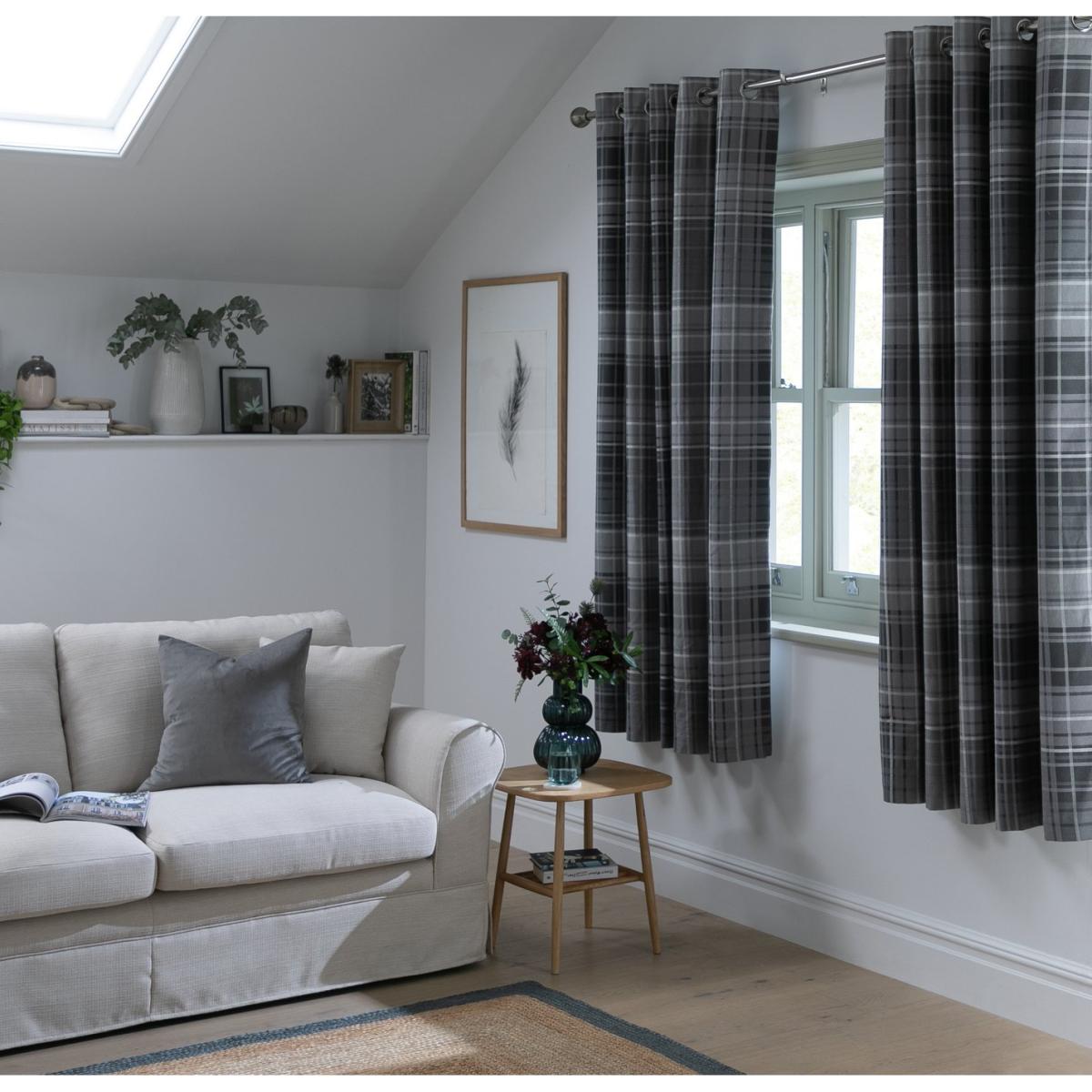 Check these out. Pop this pair of brushed cotton grey check, silver eyelet curtains on a pole, step back and admire. And they don't just look good. These fully lined blackout curtains will help you get some shut eye. And they're washable. How brilliant is that. Grey Checked Design. Silver Metal Eyelets. Features Blackout. Made from 100% cotton. Lined. Lining made from 50% cotton and 50% polyester. Dimensions Size 168cm (66 inches) wide by 229cm (90 inches) drop. Eyelet diameter: 4cm. General information Contains one pair of curtains. Number of eyelets per curtain: 20. Suitable for curtain poles. Curtain pole not included. Machine washable. Suitable for tumble drying. General Information: We are excited to be welcoming some of our favourite HOME products into the Habitat range. Your product may arrive in Habitat or HOME packaging.