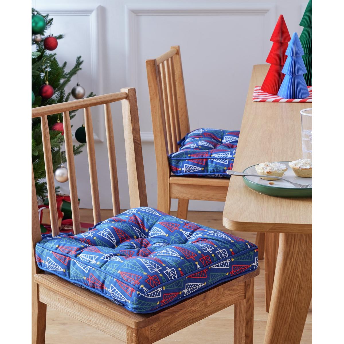 Have a very, merry, comfortable Christmas with the help of our 2 festive tie-on cushions. Padded and patterned with white and red fir tree graphics. A simple way to dress up your dining chairs this season. Cotton cover. Polyester filling. Secured by ties. Size L40, W40cm. Wipe clean. Manufacturer's 1 year guarantee.