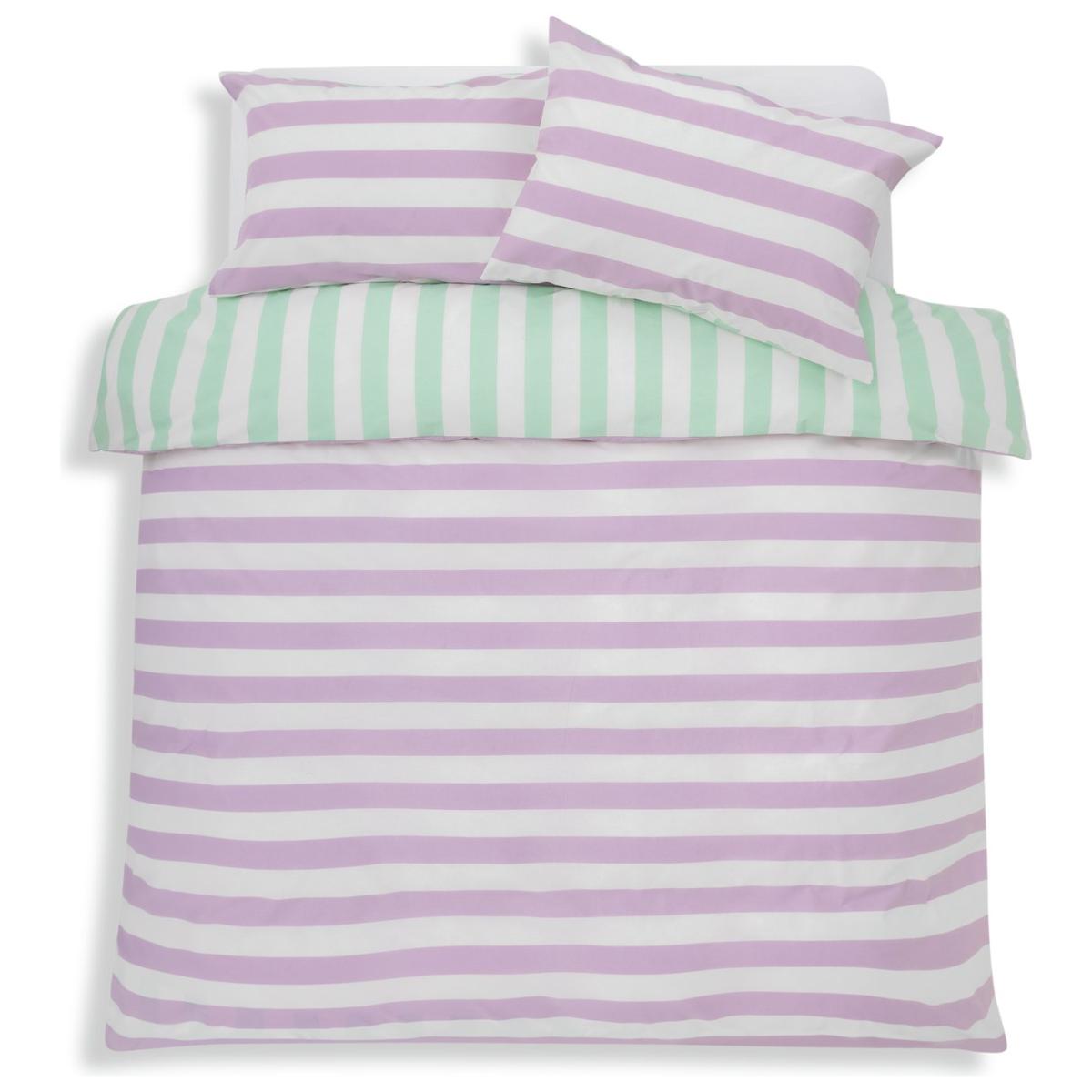 Let's amp up the style. This striped duvet set mixes nostalgia with modern cool. Totally reversible. You can opt for pastel green one day, or muted lilac the next. What a bright idea. This item carries the STANDARD 100 by OEKO-TEX logo, which means you can be certain that every component has been tested for harmful substances and is therefore harmless to human health. Finish: woven. 52% recycled polyester , 48% cotton. 144 thread count. Set includes 1 duvet cover and 2 pillowcases. Bed size: king size. Length 220cm, Width 230cm. Buttons for fastening. Standard pillowcase (s). Pillow case length 75cm, Width 50cm. Machine washable at 40 C. Suitable for tumble drying.