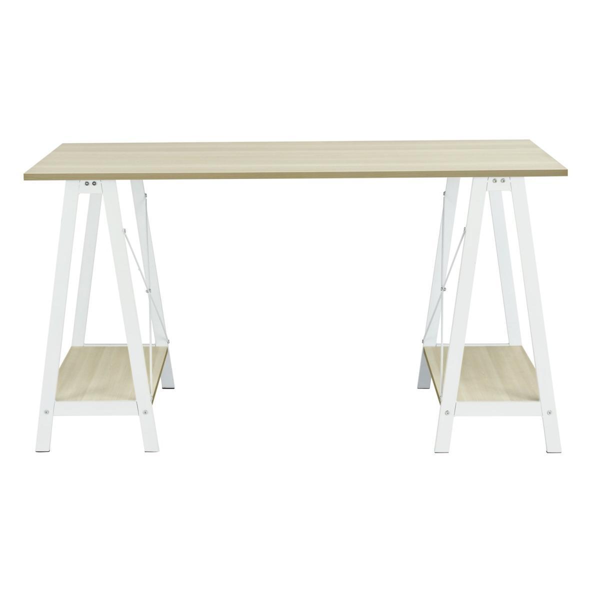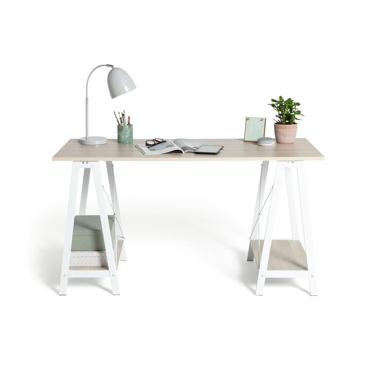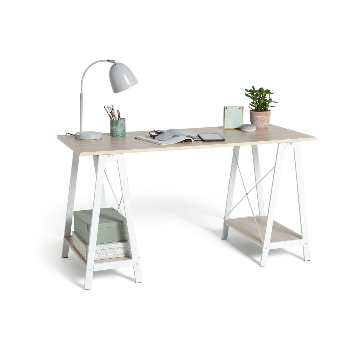 Blending seamlessly with your living space, this large trestle table cuts a contemporary industrial look with its stylish white legs and oak-effect finish. Fitted with roomy storage shelves and ample surface space, whether you're on your computer, drawing up plans, or nestled in amongst the books, it's the perfect spot to get creative. With straightforward assembly and easy access for cables, it's practical too.