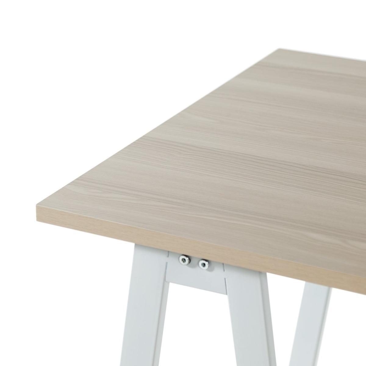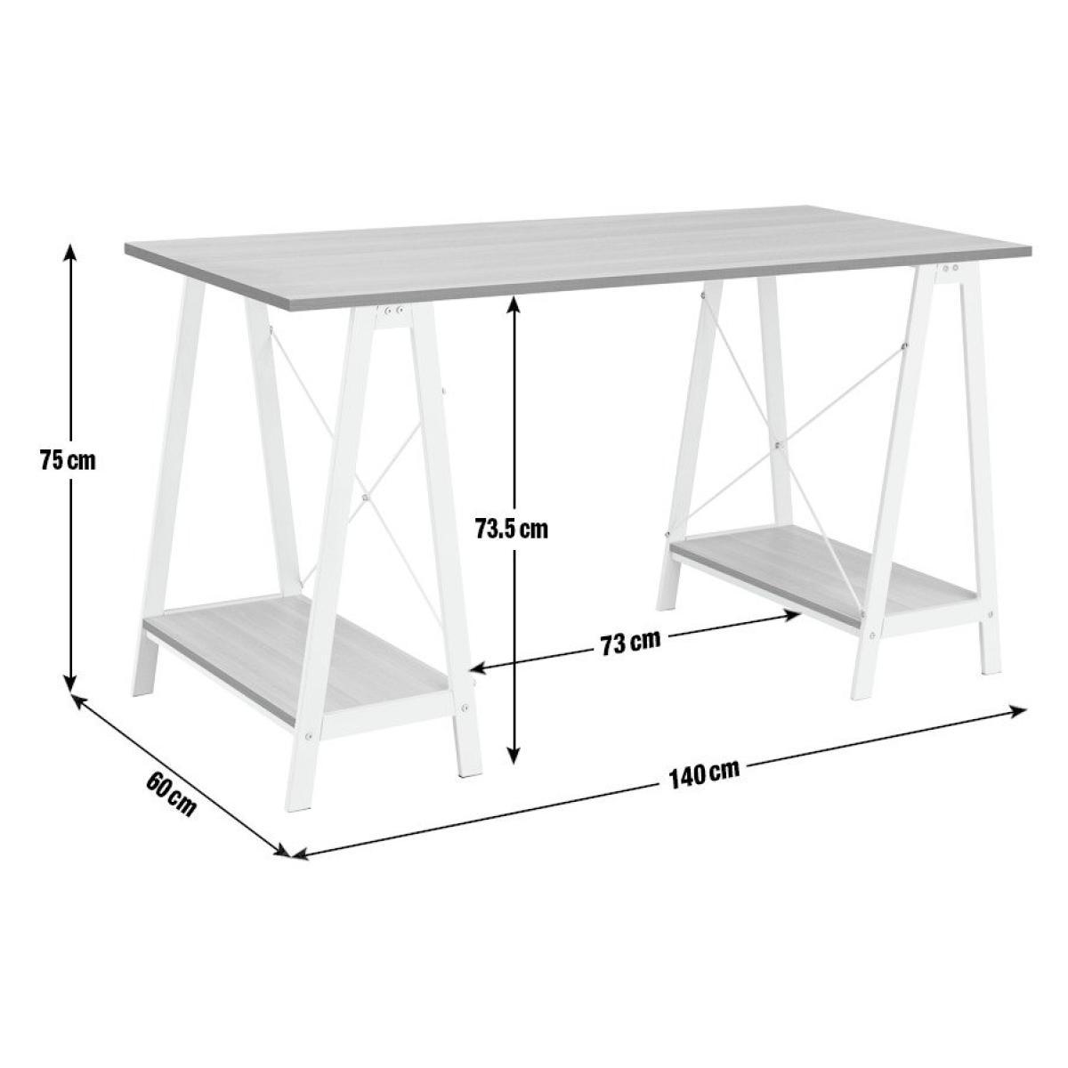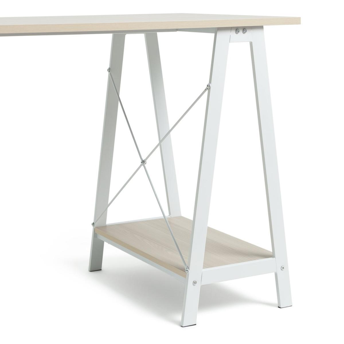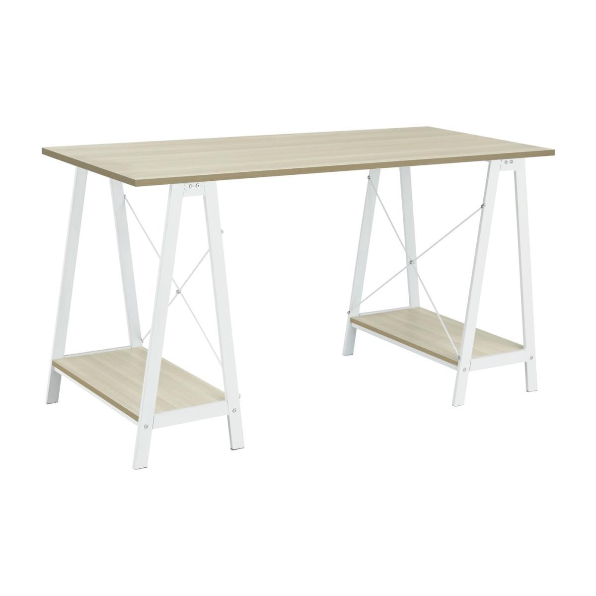 Blending seamlessly with your living space, this large trestle table cuts a contemporary industrial look with its stylish white legs and oak-effect finish. Fitted with roomy storage shelves and ample surface space, whether you're on your computer, drawing up plans, or nestled in amongst the books, it's the perfect spot to get creative. With straightforward assembly and easy access for cables, it's practical too.