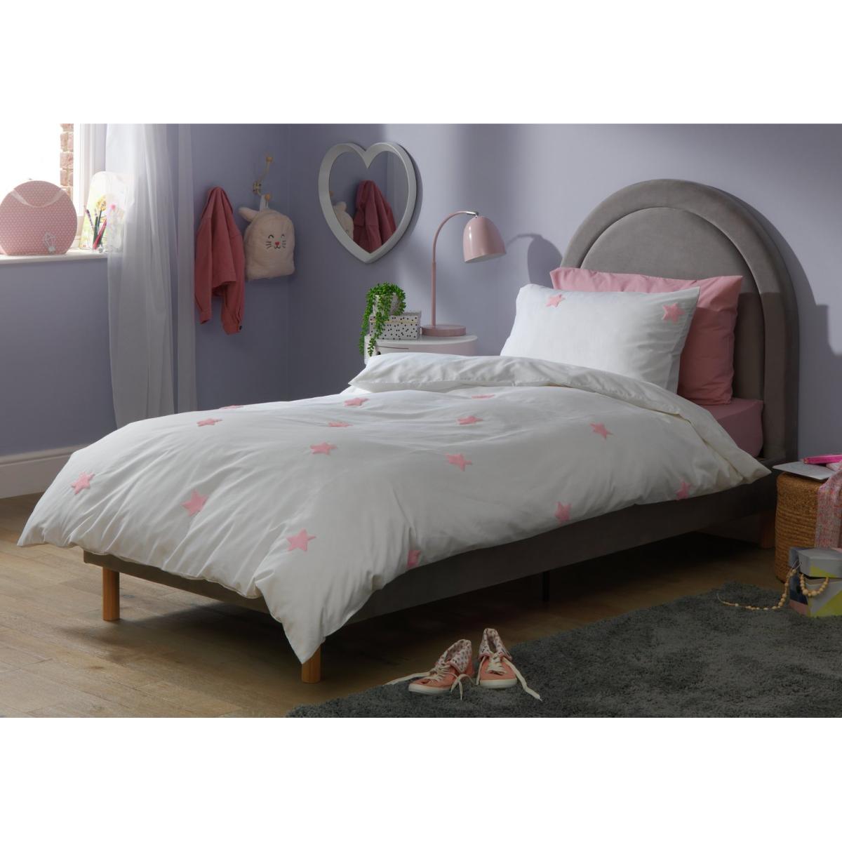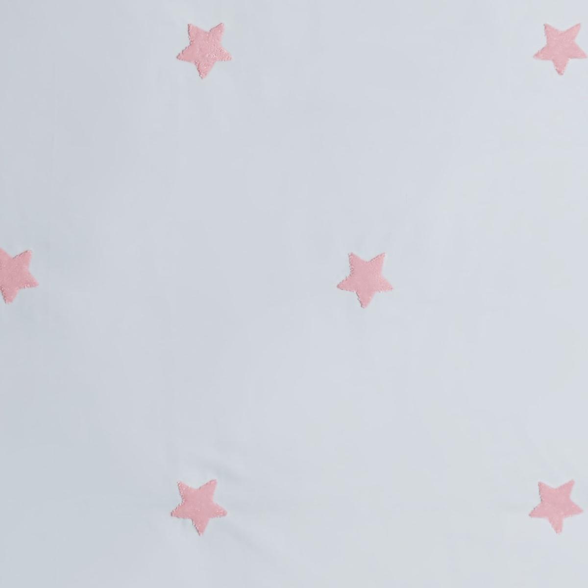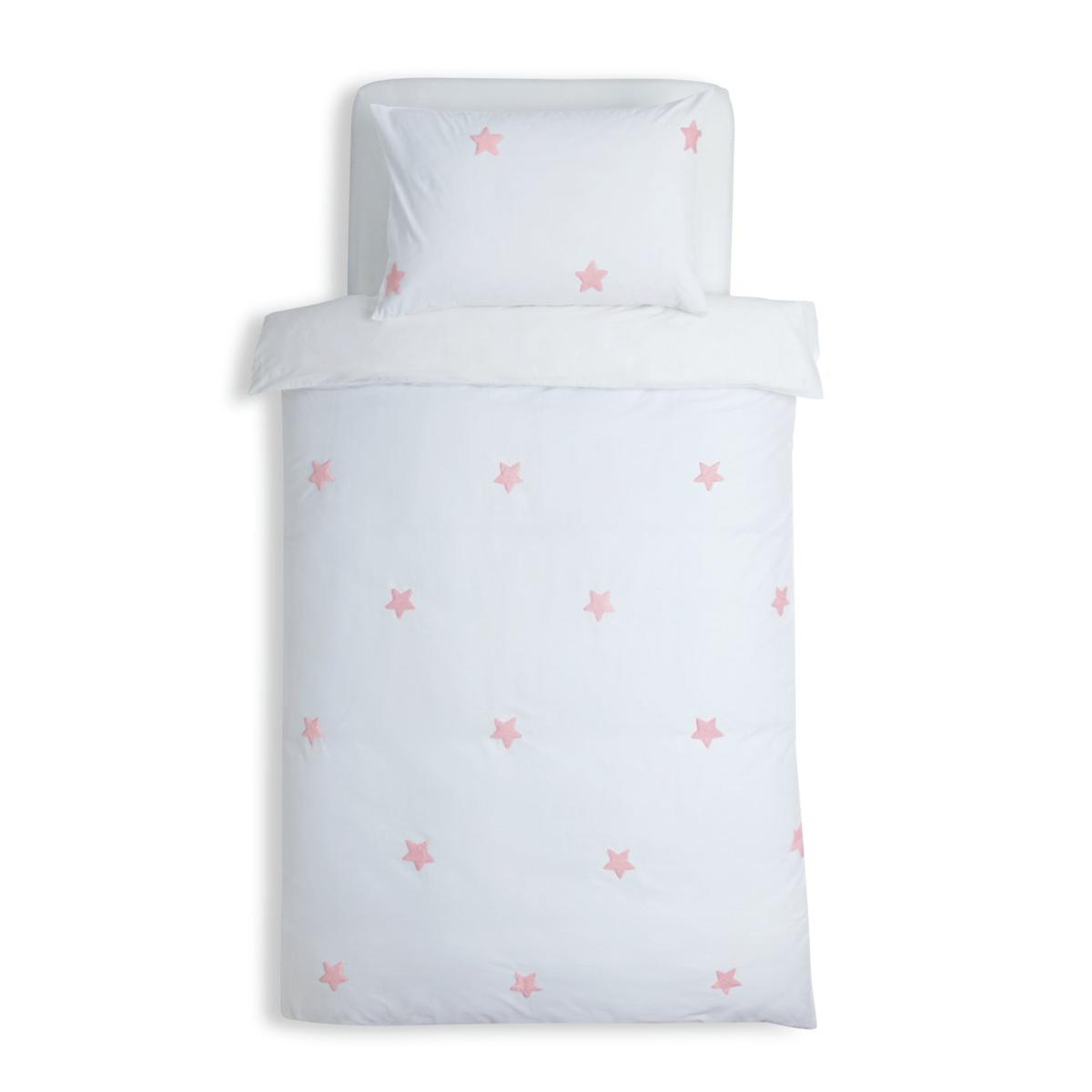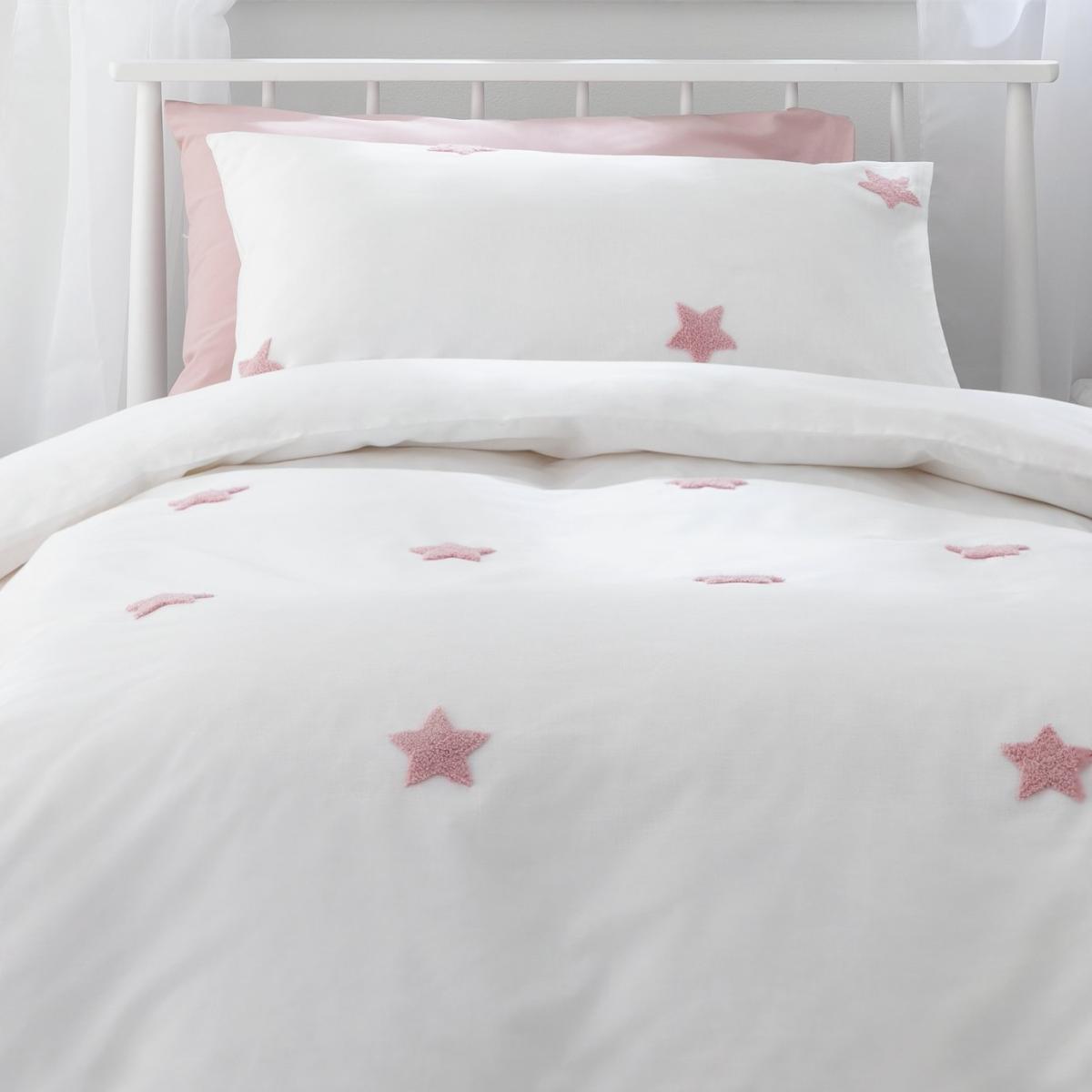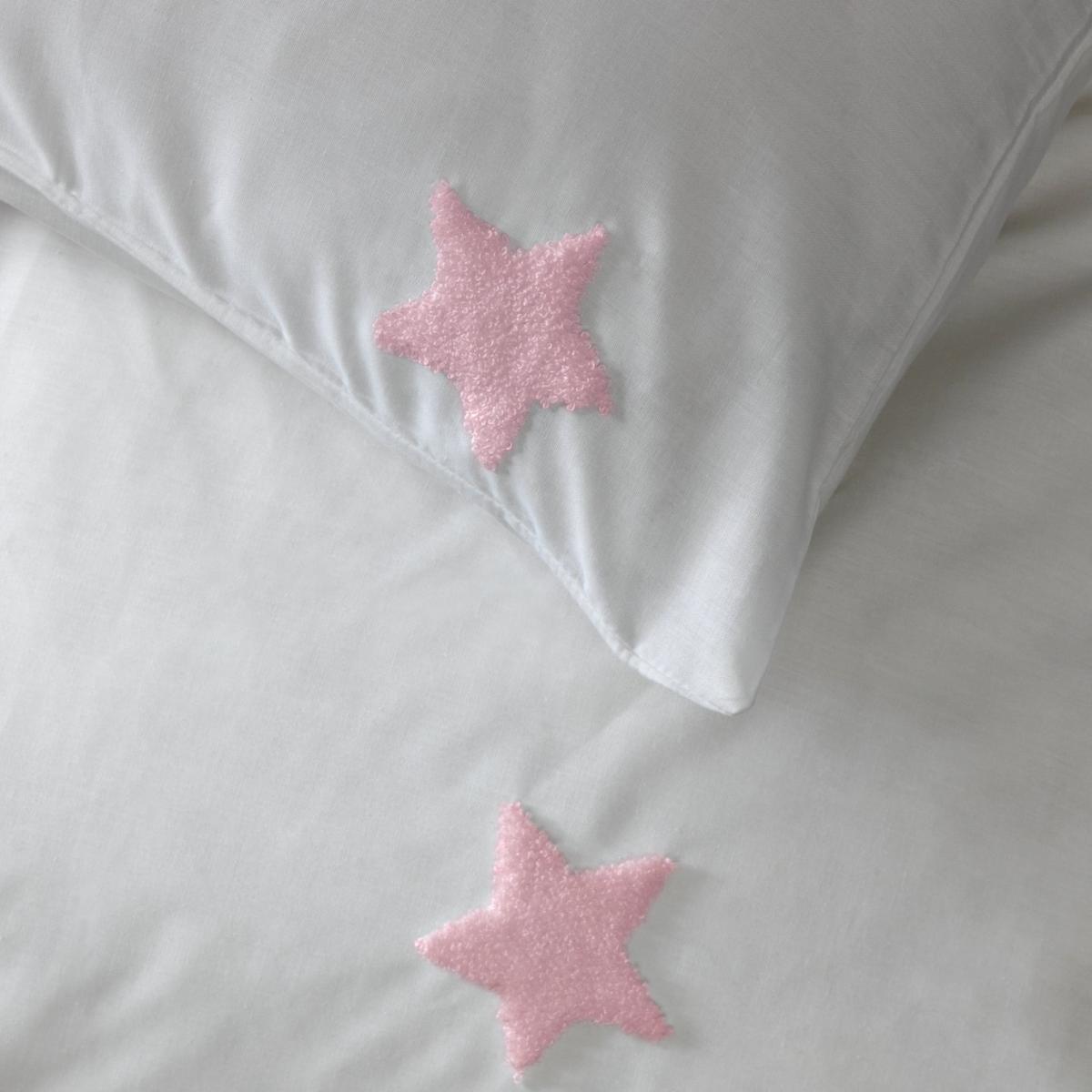 Wish upon a star. Add some cosmic magic to your child's room with this tufted pink bedding set. Soft to touch and curl up in. Dreamy. This item carries the STANDARD 100 by OEKO-TEX logo, which means you can be certain that every component has been tested for harmful substances and is therefore harmless to human health. Set comprises of 1 duvet cover and 1 pillowcase. Pink Pink stars pattern. Finish: tufted. Pillow case length 75cm, Width 50cm. Standard pillowcase (s). Buttons for fastening. Machine washable at 40 C. Suitable for tumble drying. 50% polyester, 50% cotton. 141 thread count.