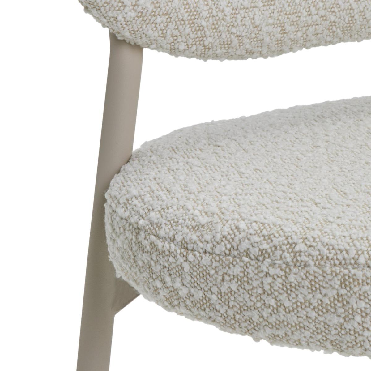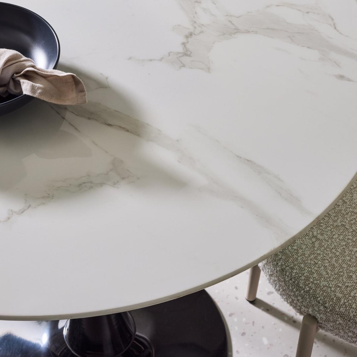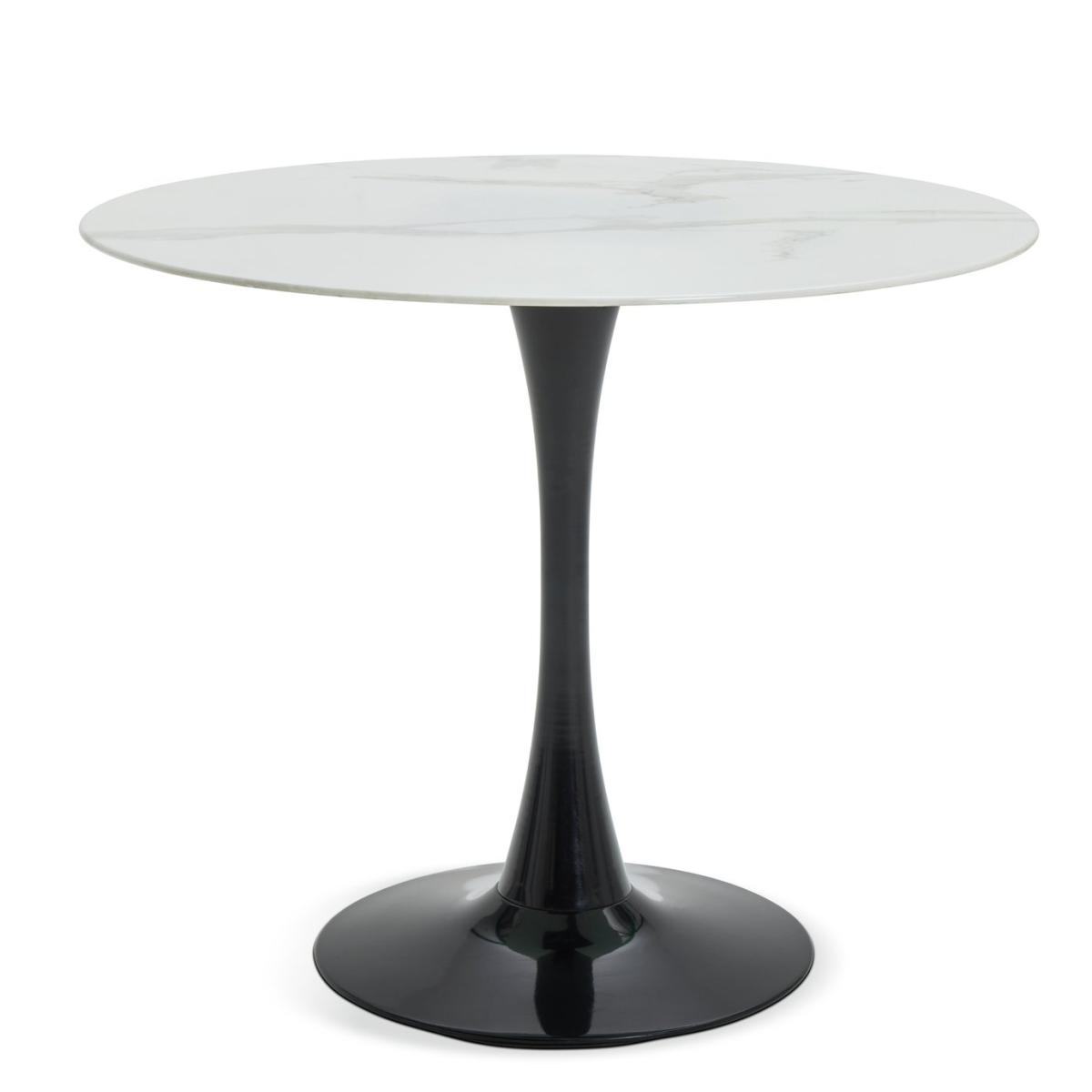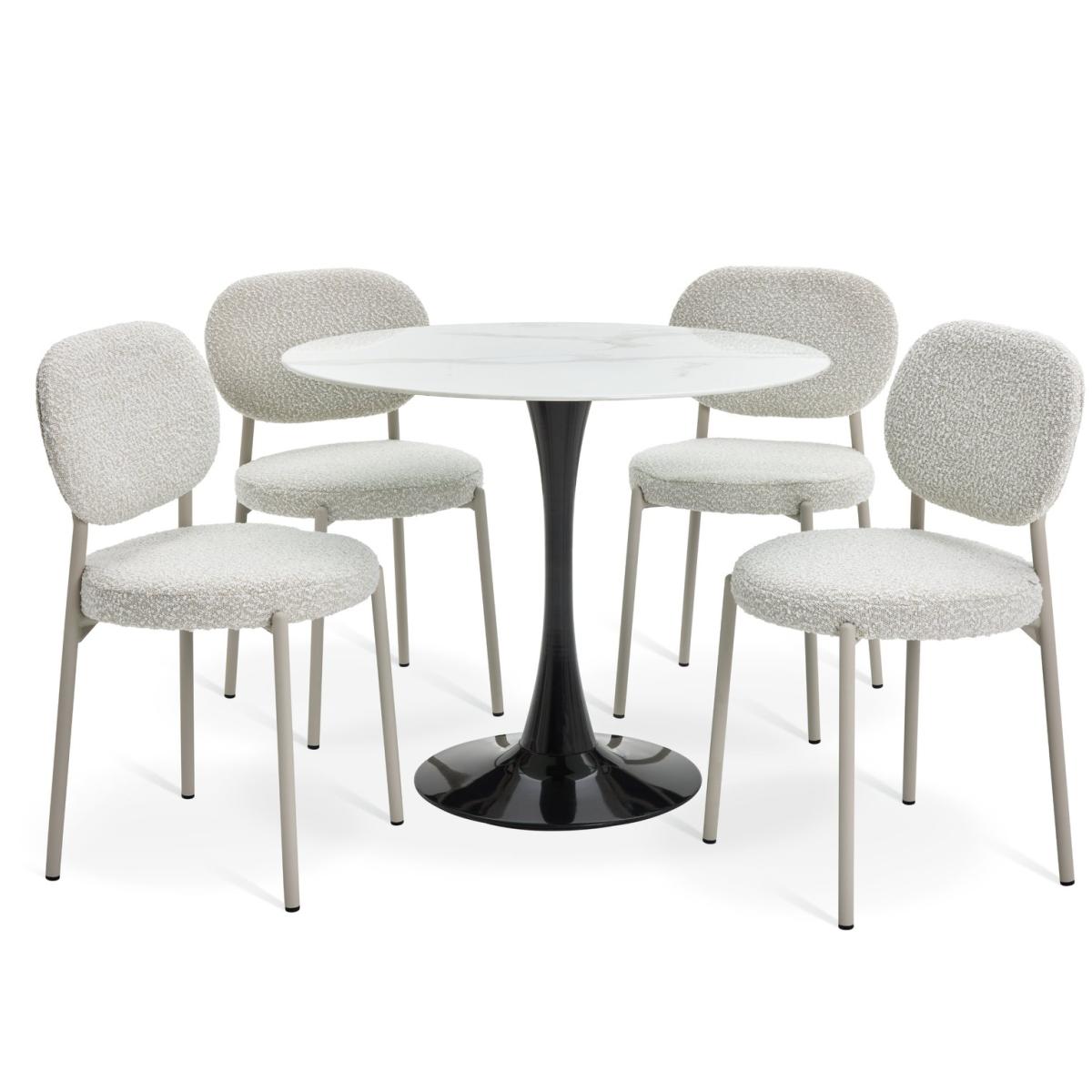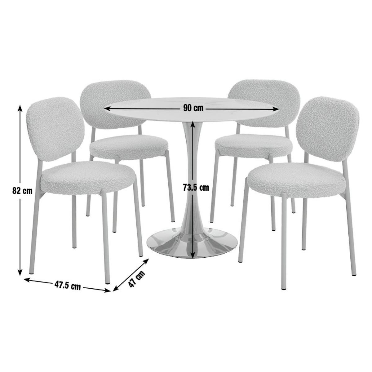Enjoy a dash of retro style with Tulip. So mid-century with its black shaped hour-glassy base and semi-gloss marble-effect white top. And paired with 4 cushiony, metal legged chairs upholstered in soft white boucle fabric. Perfect for social suppers. Part of the Tulip collection. Table: Table size H73.5, D90cm. Marble effect table with metal legs. Marble effect table top finish. Self-assembly - 1 person recommended. Chair: Includes 4 chairs. Size of each chair H82, W47, D47.5cm. Seat height 48cm. Metal frame with metal legs. Fabric seat pad. Self-assembly. Maximum user weight per chair 130kg. Individual chair weight 4.9kg. Package Dimensions: Table package 1 size H51, W51, D11cm. Table package 2 size H94, W49, D4cm. Individual chair package size H13, W82, D56cm. General information: Manufacturer's 1 year guarantee. Wipe clean with a damp cloth. FSC certified meaning the materials used for this product are responsibly sourced.