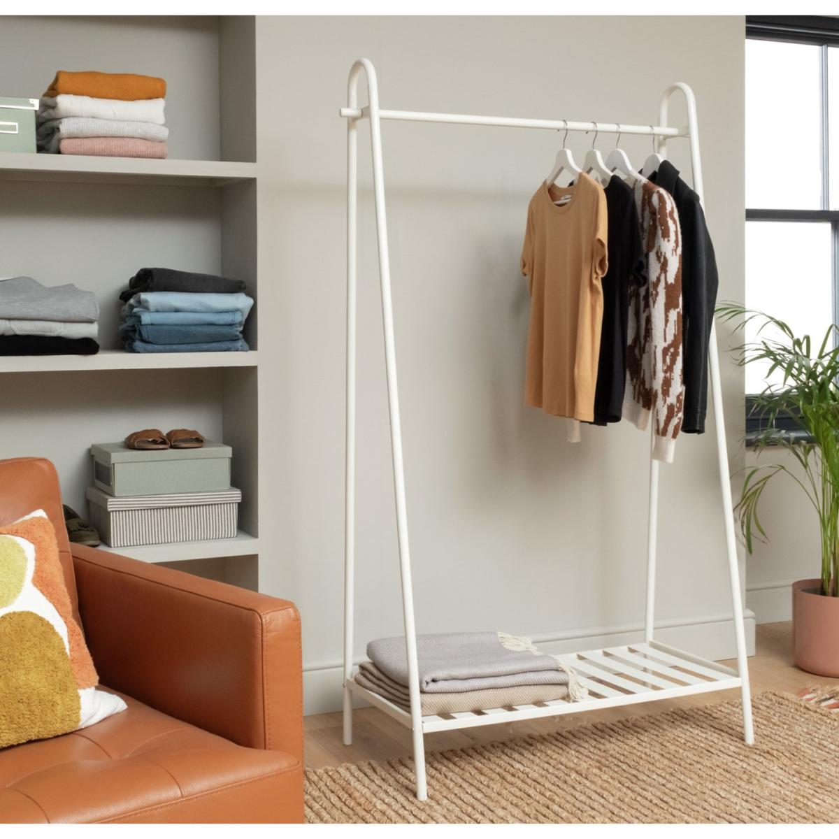 Simple designs often look the best, so lovers of industrial minimalism, our white carbon steel clothes rail is especially for you. This no-fuss piece offers oodles of tall hanging space. There's even a slatted shelf along the bottom for shoes. What more do you need. Bit of a fashionista? Check out the rest of our clothes storage options. Size H170, W100cm. Rail weight capacity 15kg. Shelf weight capacity 20. Kg. Packed flat.
