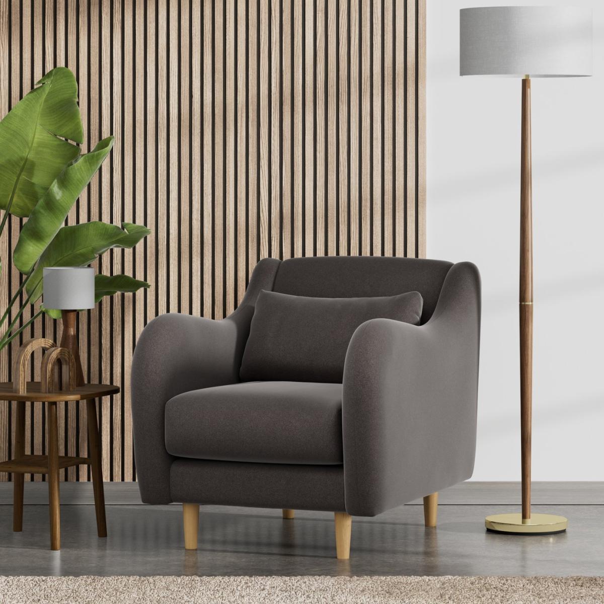 When it's made for you, you know you'll love it. The Turnmill is a highly desirable Habitat designed armchair. From the side, the arm rest's free flowing lines are a nod to mid-century curves. And check out the extra cushion factor. Nestling against the gently reclining back are lumber supporting bolsters to relax into. In a rich velvet, the Turnmill takes on a luxe look. An aesthetically pleasing, comfortably inviting armchair. Offering a more supportive seat, the Turnmills cushions use high density foam core wrapped in fibre wadding to create the perfect balance of support, durability and recovery. Hand made to order in the UK, the Turnmill uses quality materials and traditional techniques for furniture thats unique to you. Available in a choice of sizes and fabrics including Aquaclean technology protection built into the yarn, which is easy to clean with just water. Part of the Turnmill collection. Material: Made from 100% recycled polyester. Wooden feet. Removable seat with foam fibre wrap filling. Removable cushion(s) with foam fibre wrap filling. Dimensions: Size H84, W77, D99cm. Floor to seat height: 49cm. Depth of seat: 53cm. Height of seat back: 49cm. Width of seating area between arms: 55cm. Height of arm rest: 76cm. Weight: 35kg. Packaged dimensions: Package size H89, W82, D104cm. General information: FSC certified meaning the materials used for this product are responsibly sourced. We do more than deliver your product, we unpack, set it up and take away the packaging. Manufactured in the UK using components sourced globally. Professional clean only. Plump cushions regularly to maintain shape. Manufacturer's 15 year frame guarantee.