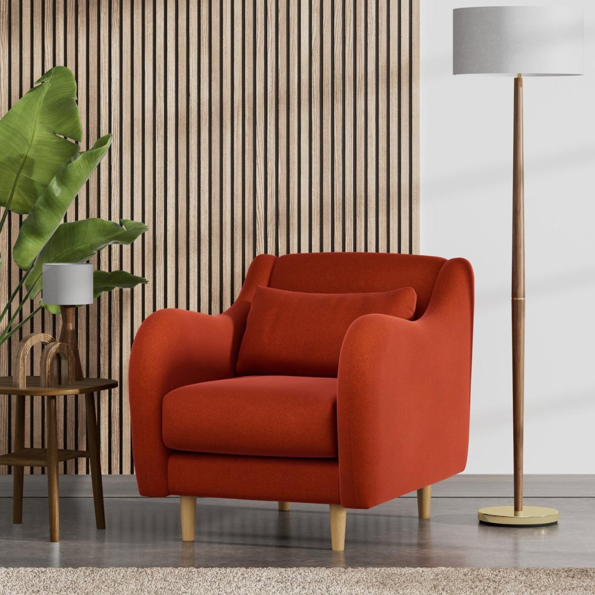 I love this orange velvet armchair because it adds a warm, inviting focal point to a variety of interiors. Its vibrant hue works well in both contemporary and eclectic spaces, bringing a pop of colour without overwhelming the room. The ash-toned legs lend a light, natural touch that keeps the overall look fresh and modern. For styling tips, pair it with neutral or muted tones for a balanced look, or mix it with patterned cushions and accessories for a more playful approach. This chair is also practical; its plush velvet promises comfort, while its sturdy frame makes it suitable for both cosy corners and more social settings.