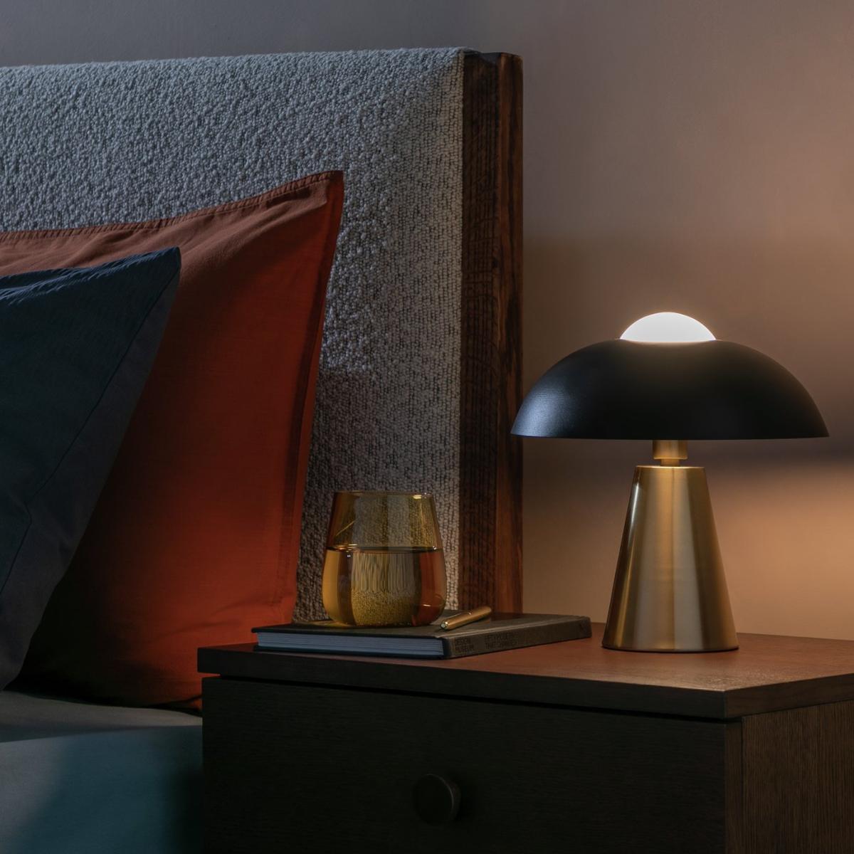 Mirage is a table lamp styled to create a gentle and soothing atmosphere. With enough diffused light to make the mood mellow. There isn't a room in the house where it won't look good. An opal glass inset softens upward light. While from the black domed shade, a downward pool is cast across and around the lustrous golden conical base. A distinctive modern piece with a serious shine. Dimensions: Overall size H24, Diameter 22cm. Diameter of base 10cm. Cord length 1.8m. Bulb Information: Bulbs required 1 x capsule G9 LED bulb(s) (not included). Recommended maximum wattage: 18 watts. General Information: Shade colour: black. Base colour: gold. Shade material: glass. Base material: steel. In-line switch. IP rating 20 - not suitable for bathroom use. Self-assembly. Product is mains powered plug in. Mirage. Manufacturer's 1 year guarantee.