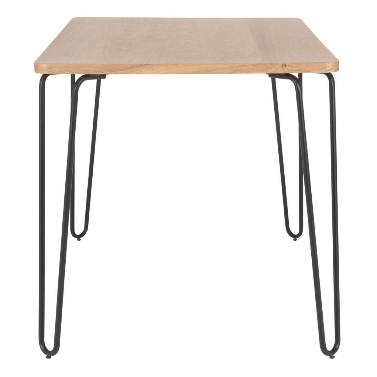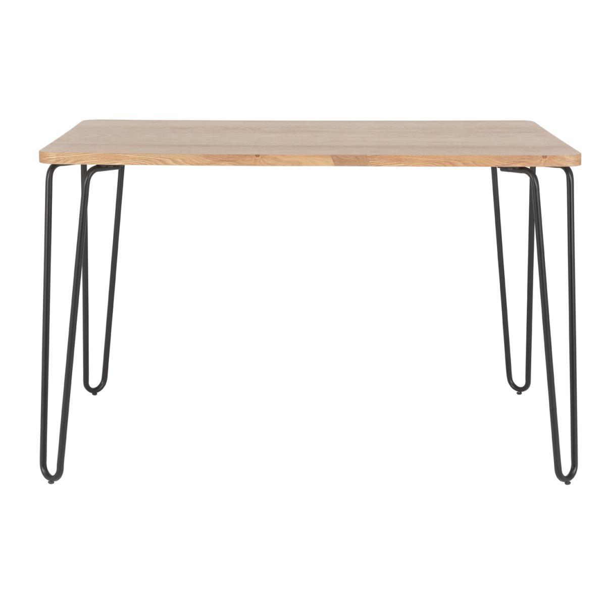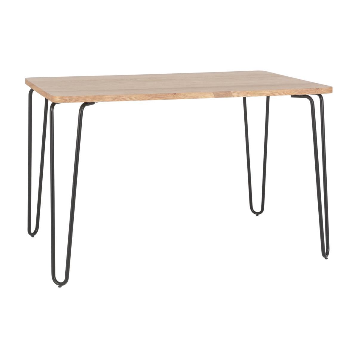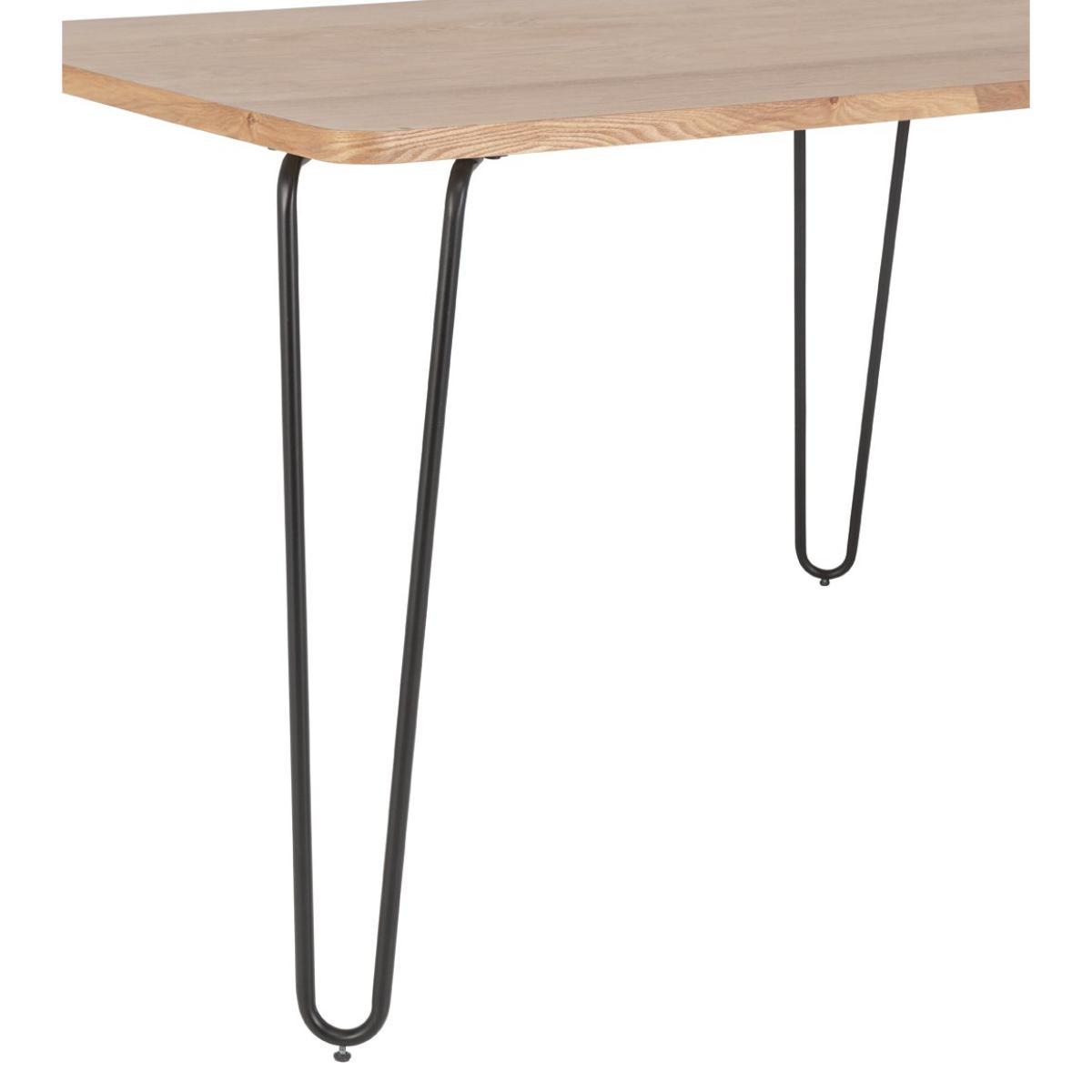 The Tyler ash and black metal 4-6-seater dining table pairs beautifully grained ash veneer with slender powder coated metal legs to create a distinctive design. With a slimline top and open hairpin legs, this table allows light to run freely around the room and wont dominate a space. Perfect for small spaces, this sturdy table will fit perfectly in a kitchen or dining room and is made for everyday use. Part of the Tyler range, its available as a bench and as coffee and side table.