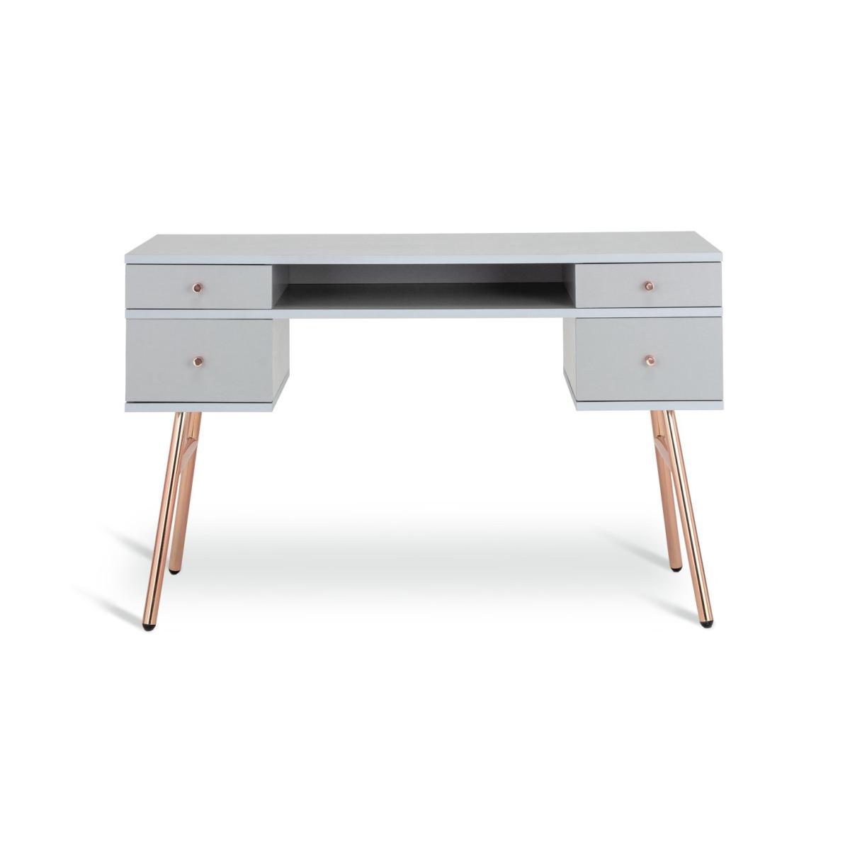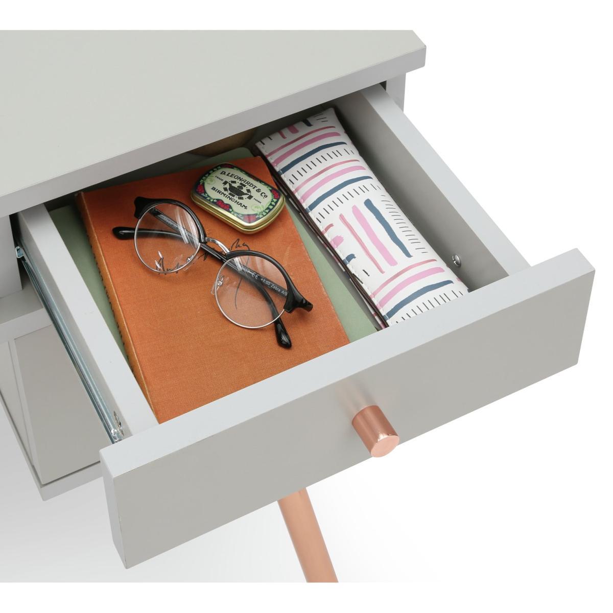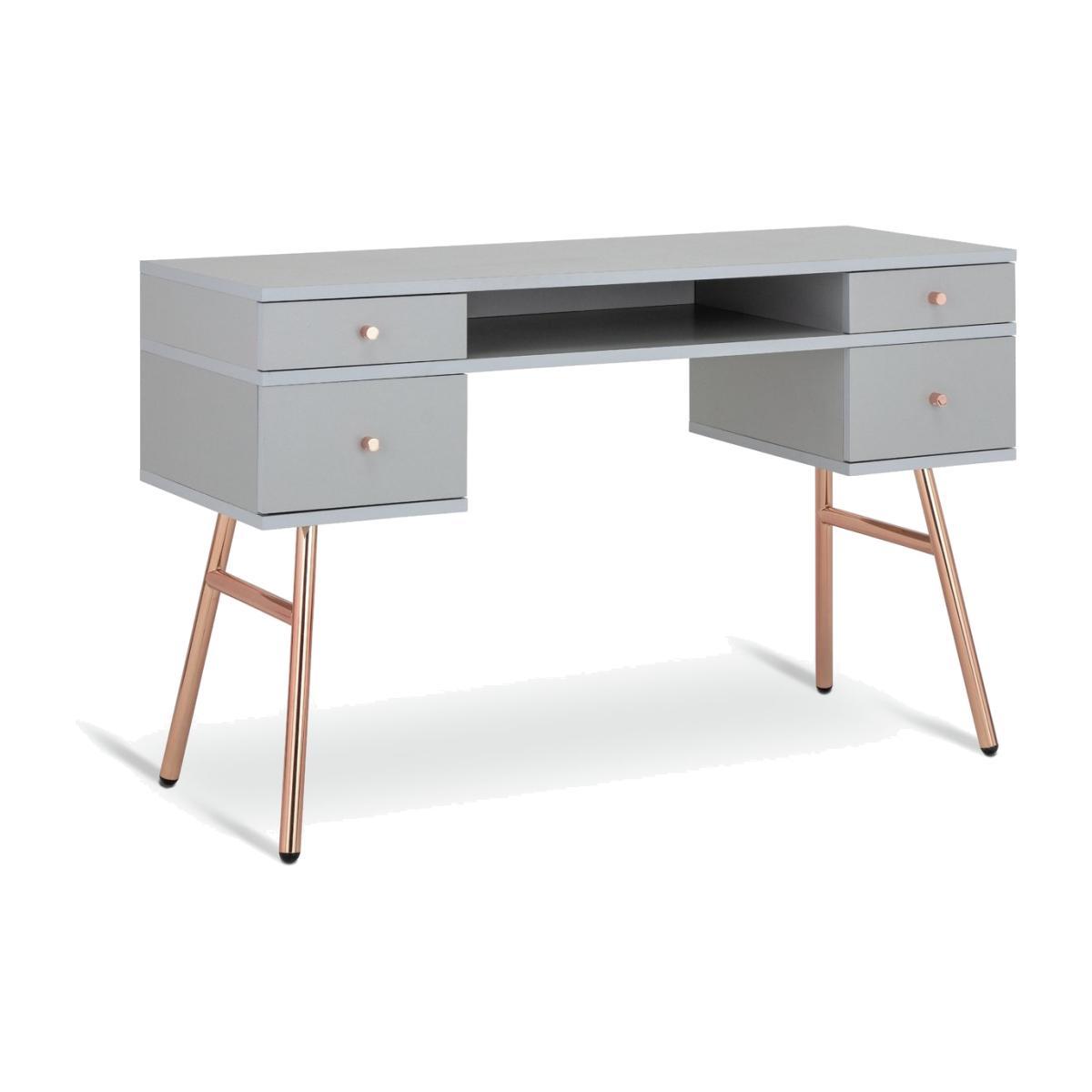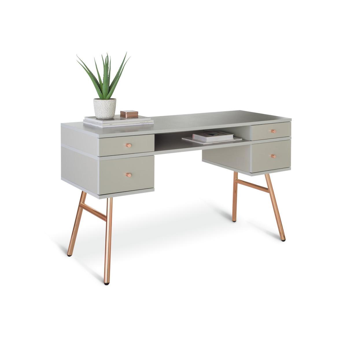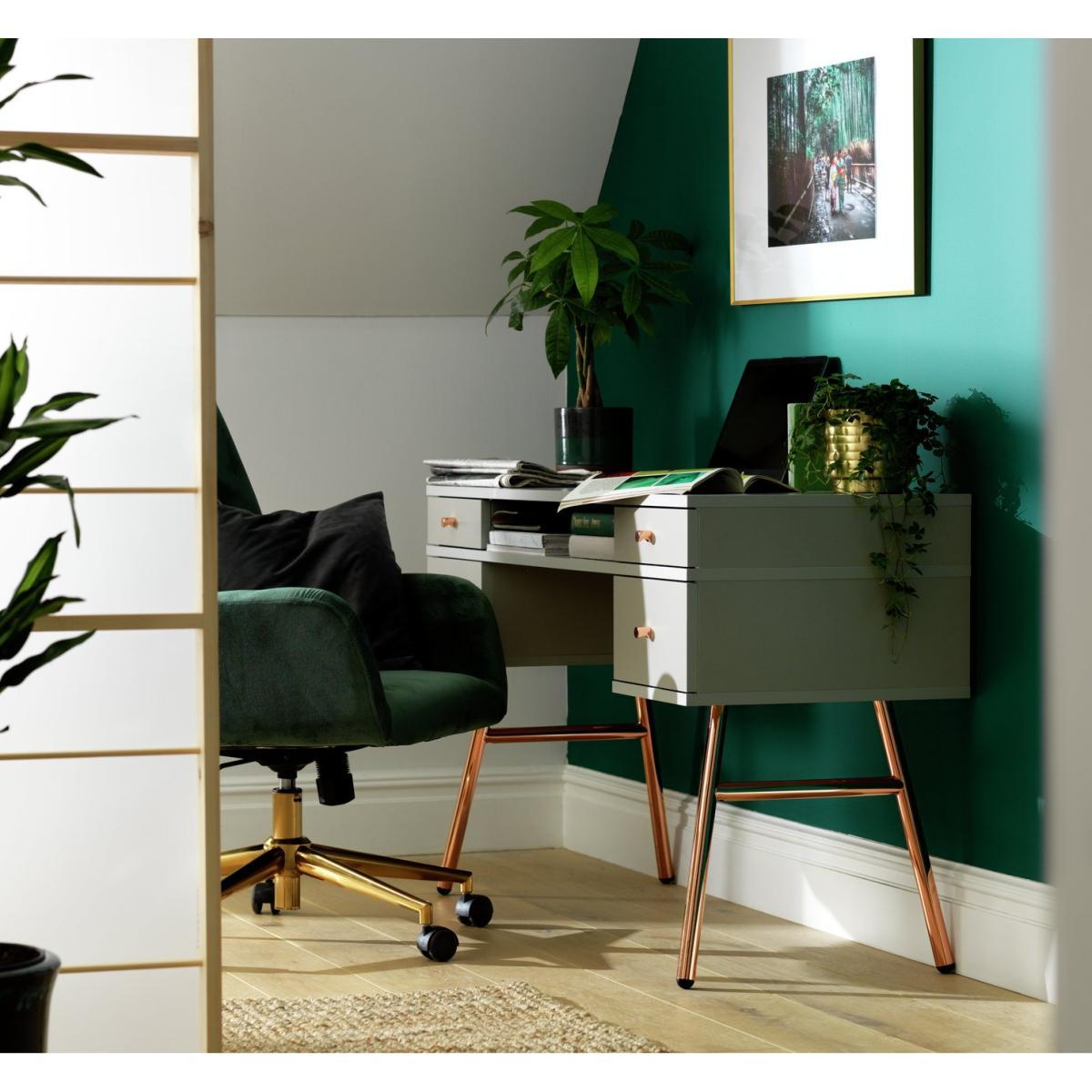 With vintage flair and delightfully feminine touches, the Valence pedestal desk is the perfect blend of functionality and style. A staple piece for at-home productivity, it features 4 handy drawers and a cubby hole for storing documents, stationery, books, cables and more. Crafted from wood-effect with contrasting rose gold legs and handles, the minimalist Valence desk pairs well with contemporary decor and makes an elegant addition to any room. A real charmer, the Valence desk is ideal for daydreamers and big thinkers alike. With 2 deep drawers, 2 slim ones and a shelf, this desk is an organisers dream; there's a place for everything. And when it's time to call it a day and shut down your laptop, you still have a charming desk that will decorate your space beautifully. Part of the Valence collection. with metal handles. 4 drawers with metal runners. Easy cable access. Self-assembly - 2 people recommended. If this product is over 60cm high it must be securely attached to the wall to prevent overturning. General information:We are excited to be welcoming some of our favourite HOME products into the Habitat range. Your product may arrive in Habitat or HOME packaging. Maunfacturer's 2 year guarantee. Dimensions: Size H75.6, W120, D48cm. Under desk chair space H62.8, W61cm. Maximum load capacity of desk 25kg. Weight 33.9kg. Packaged dimensions:Package dimensions H53, W132, D12.7cm. Second package H43.5, W58.7, D13.2cm.