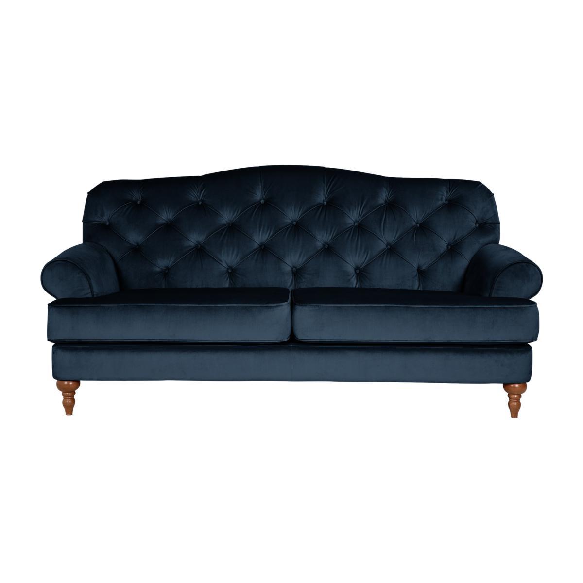 Surround yourself with true beauty. The 3-seater Valerie sofa is thoroughly classic. From its turned front feet to its deep buttoned back. It exudes elegance. The luxurious, soft-to-touch velvet stands out with its ink indigo tone. Its elegant look will withstand ever changing interior trends. The best of British, Valerie is manufactured right here in the UK. It's been carefully crafted to provide the best comfort. We're in love with its traditional look. This sofa comes with a 10 year frame guarantee. We'll cover manufacturing faults on frames, feet, arms, internal springs or webbing. We can arrange a repair, replacement, exchange or refund. Part of the Valerie collection. Material:Made from 100% polyester. Wooden feet. Removable seats with foam fibre wrap filling. Dimensions: Size H91, W184, D100cm. Floor to seat height: 50cm. Depth of seat: 67cm. Height of seat back: 39cm. Width of seating area between arms: 154cm. Height of arm rest: 60cm. Weight 52kg. Professional clean only. Plump cushions regularly to maintain shape. Minimal assembly - just add feet. Maximum individual user weight 95kg. Packaged dimensions:Package size H80.5, W206, D105cm. General information:Manufacturer's 10 year frame guarantee.