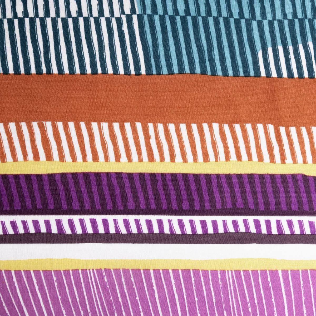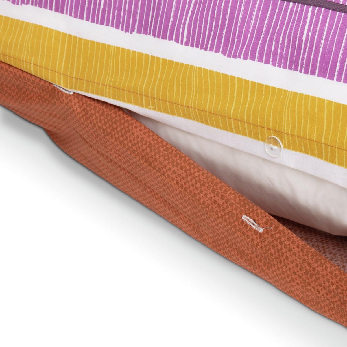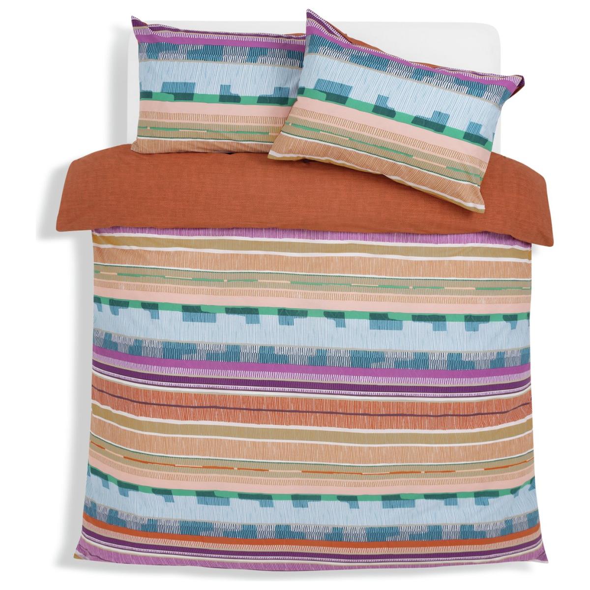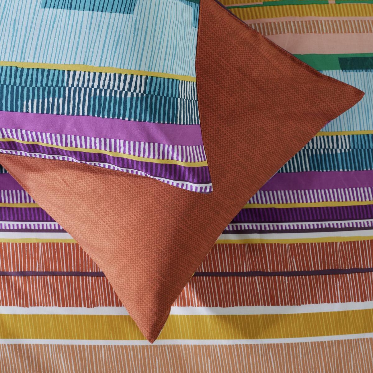 This bright and exciting bedding set is a riot of colour. Bold stripes and geo patterns bring your sleep space to life. And it's reversible. A warm rust orange is waiting for you on the other side. Simply flip over anytime you fancy a change of scenery. This item carries the STANDARD 100 by OEKO-TEX logo, which means you can be certain that every component has been tested for harmful substances and is therefore harmless to human health. 52% polyester , 48% cotton. 144 thread count. Set includes 1 duvet cover and 2 pillowcases. Bed size: double. Length 200cm, Width 200cm. Reversible. Buttons for fastening. Standard pillowcase (s). Pillow case length 75cm, Width 50cm. Reversible pillowcase (s). Wash before use. Suitable for tumble drying.