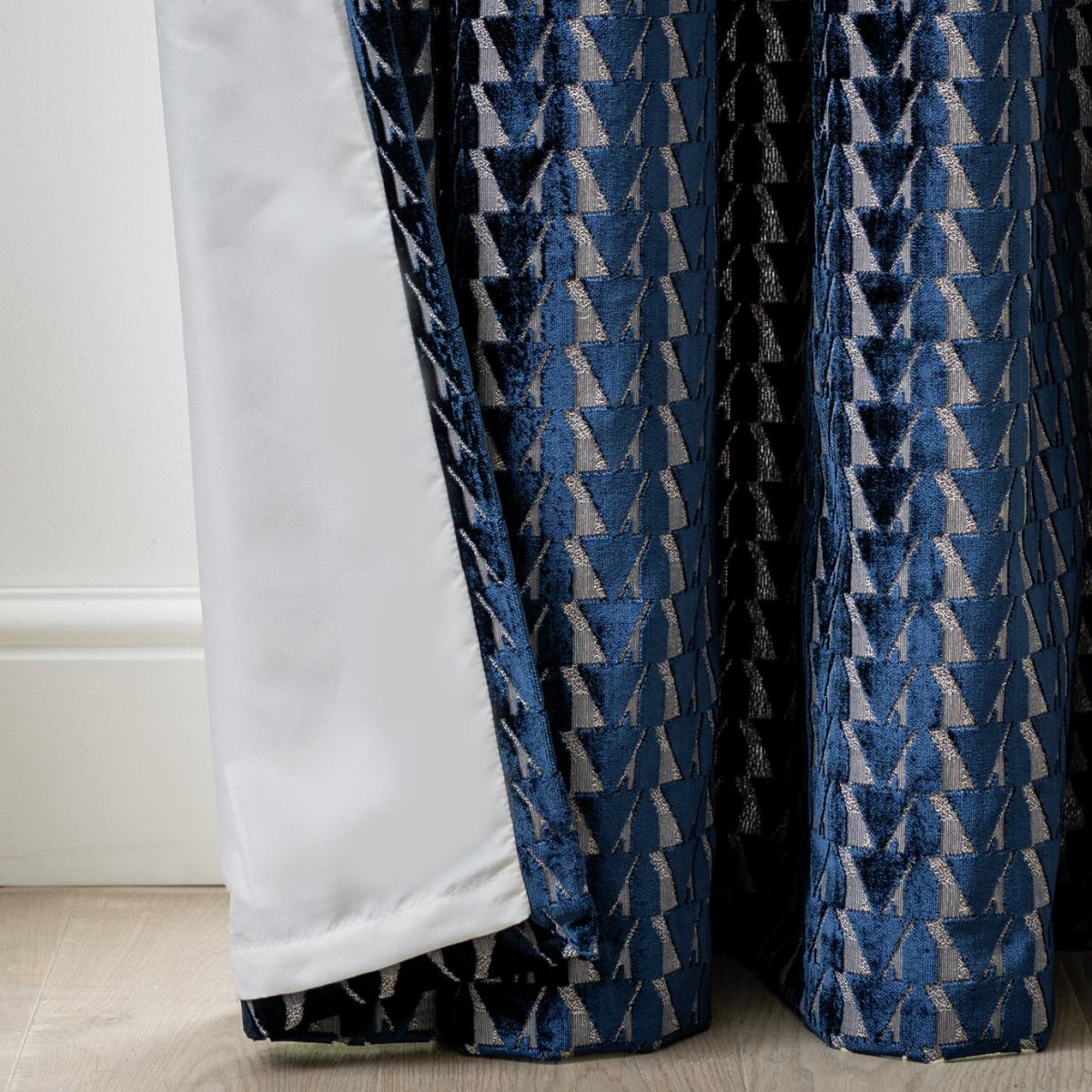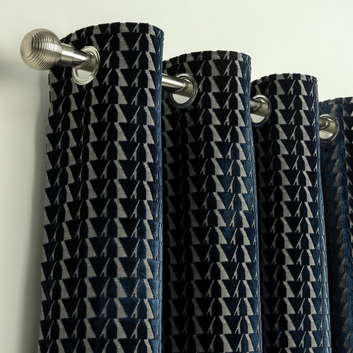 Tall, dark and handsome. Our pair of luxe lined curtains feature an eye-catching geo jacquard pattern. Just slide them onto a pole and they'll fall in soft, wide folds from the brushed silver nickel eyelets adding instant drama to your window. A stylish essential for seasons to come. Navy geo Design. Brushed silver nickel Eyelets. Features Fully lined. Made from 91% polycotton and 9% linen. Lined. Lining made from 100% recycled polyester. Dimensions Size 117cm (46 inches) wide by 137cm (54 inches) drop. Dimensions provided include header tape. Width refers to one curtain panel before hanging. Eyelet diameter: 4cm. General information Contains one pair of curtains. Number of eyelets per curtain: 8. Suitable for curtain poles. Curtain pole not included. Professional clean only.