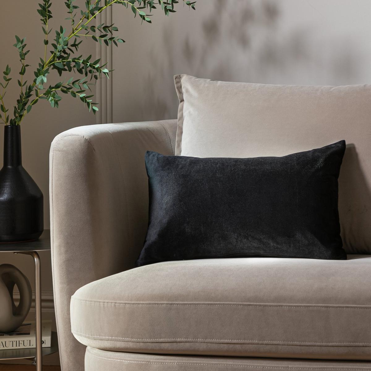 Add a touch of luxe to your living room with this opulent rectangular cushion. Crafted in rich black velvet with a soft squashy filling. It's everything a cushion should be. Comfy, cool and temptingly tactile. Zip fastening. Cover 100% Polyester. Filling 100% Recycled Polyester. Size L50, W30cm. This cover is machine washable covers.
