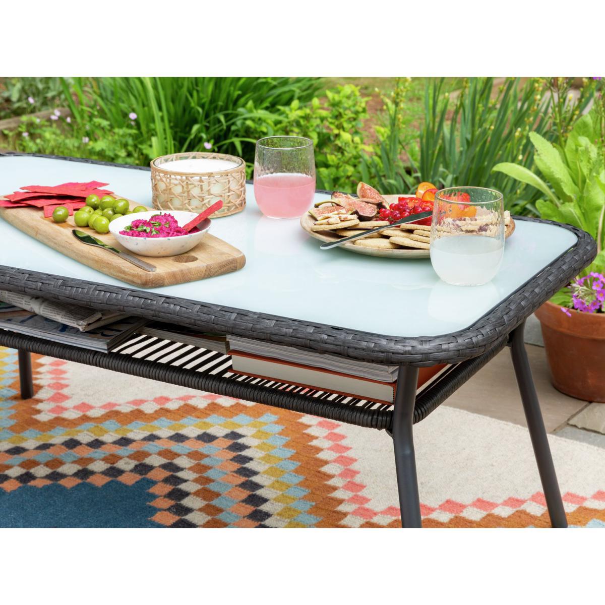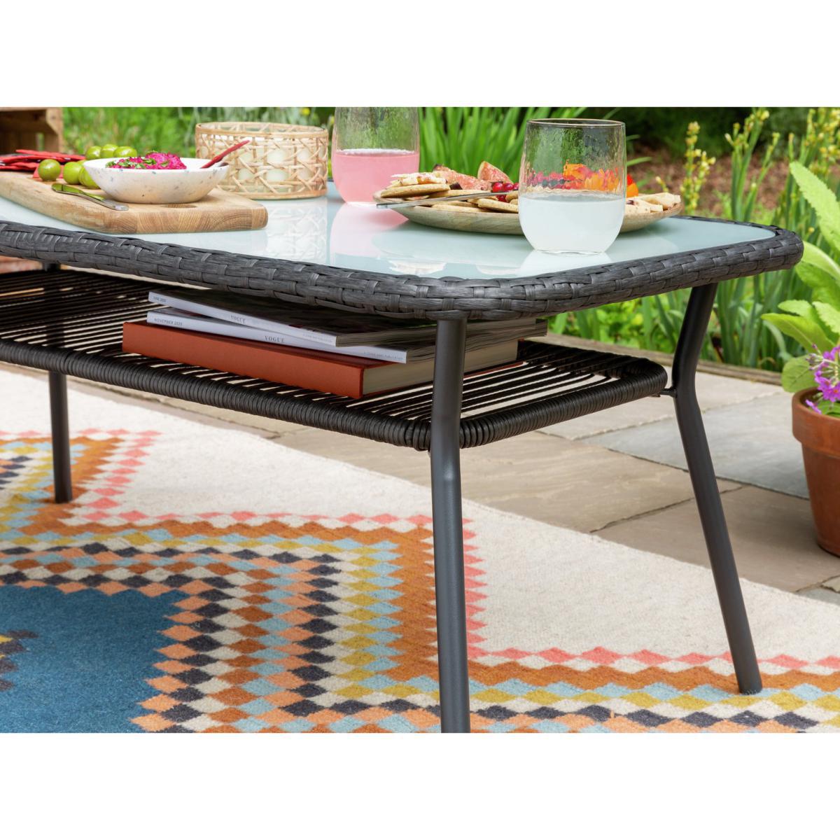 Sleek, sophisticated, stylish. That's Venus. Get family and friends over to chill with this comfy, contemporary furniture set. Handwoven with black rattan and steel, the 2-seater sofa and 2 carver chairs help you kick back in style. While the glass top coffee table sets the stage for drinks and nibbles. Halfway through a book or magazine? A secret storage shelf means you can pop them out of the way to come back to later. That's neat.