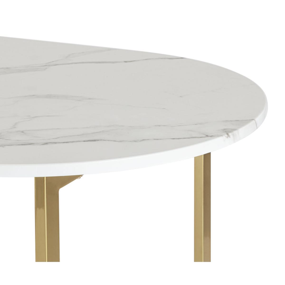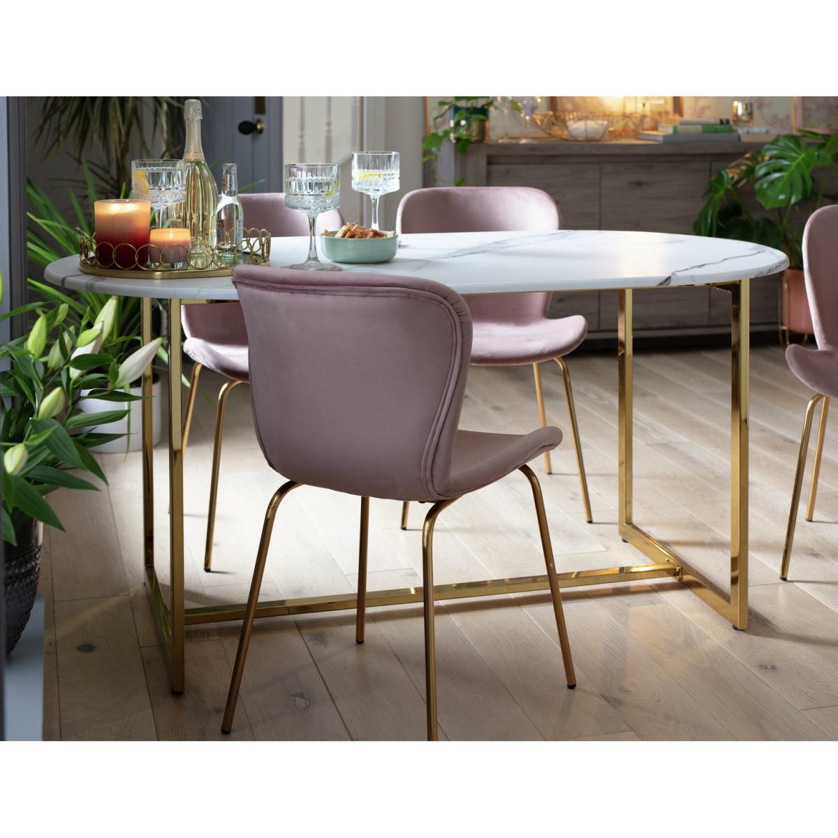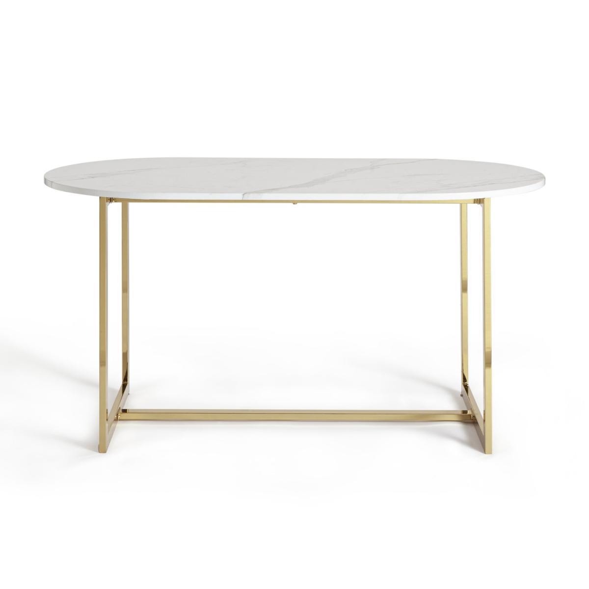 Mesmerising mix of materials. That's the Habitat Vivien. An oval marble-effect table top is sat atop a sleek gold-coloured metal frame. The result? A show home chic dining table that impresses. Ditch everyday dining dull and go for glam. From suppers to soirees, this table is ready to take centre stage. An opulent oval.